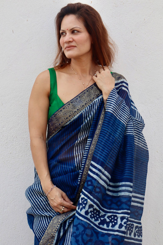 Indigo Natural Vanaspati Block Print Maheshwari Sari with Zari Border