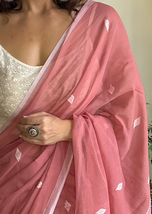 Pink Hand Spun Pure Cotton Jamdani Sari with Butis