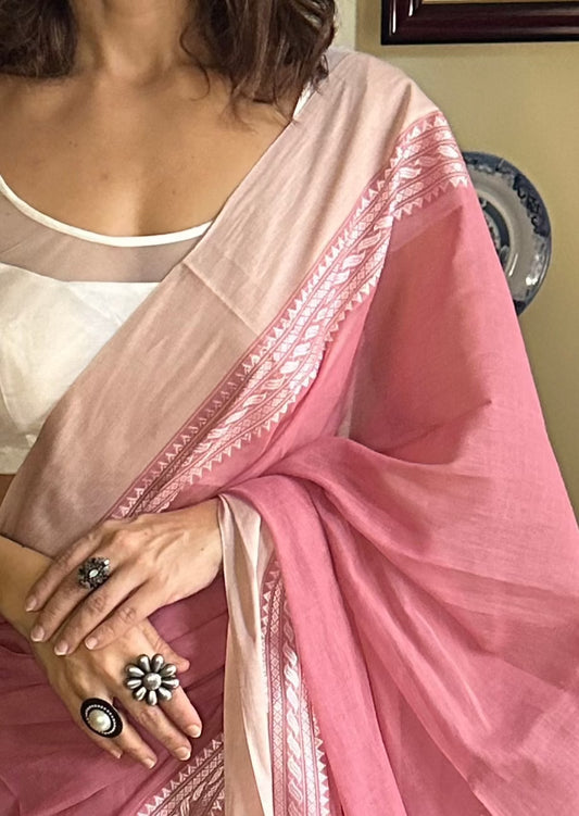 Onion Pink Soft Handloom Cotton Sari with Zari Woven Borders