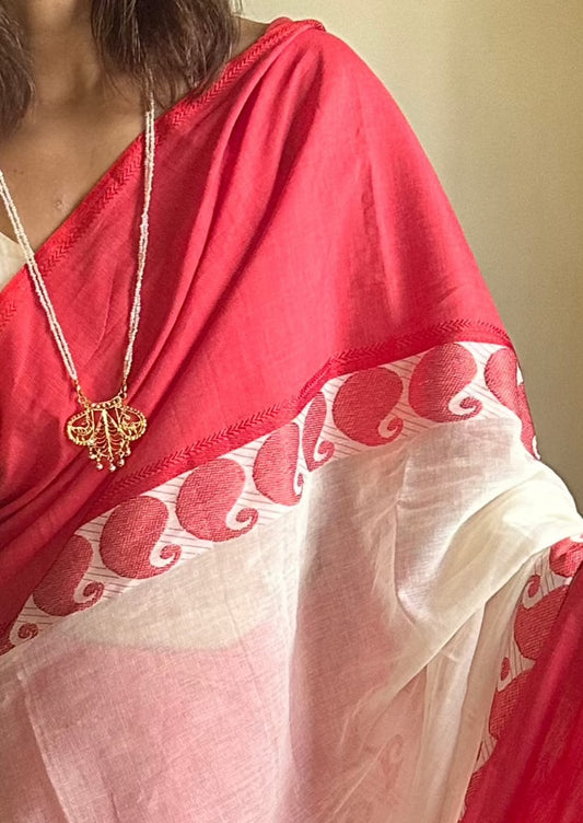 White Pure Cotton Saree with Red Woven Rudraksha Design