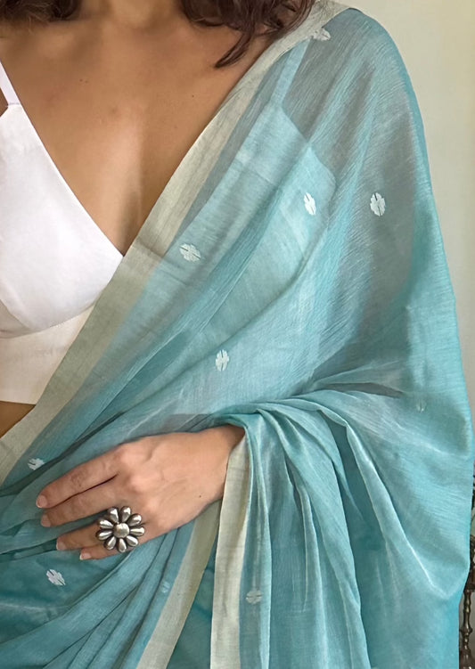 Turquoise Hand Spun Pure Fine Cotton Jamdani with Woven Butterflies