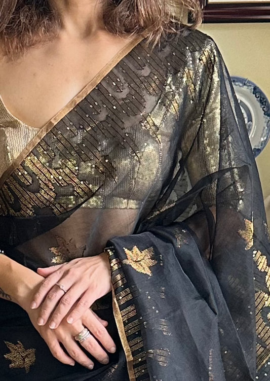 Red & Black Handloom Linen Tissue Sari with Contrast Zari Woven Pallu