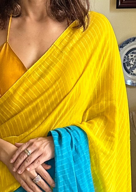 Yellow & Blue Hand Dyed Pure Mul Mul Cotton Saree