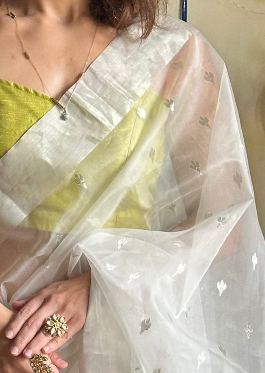 White Hand Spun Pure Cotton Jamdani Sari with Butis