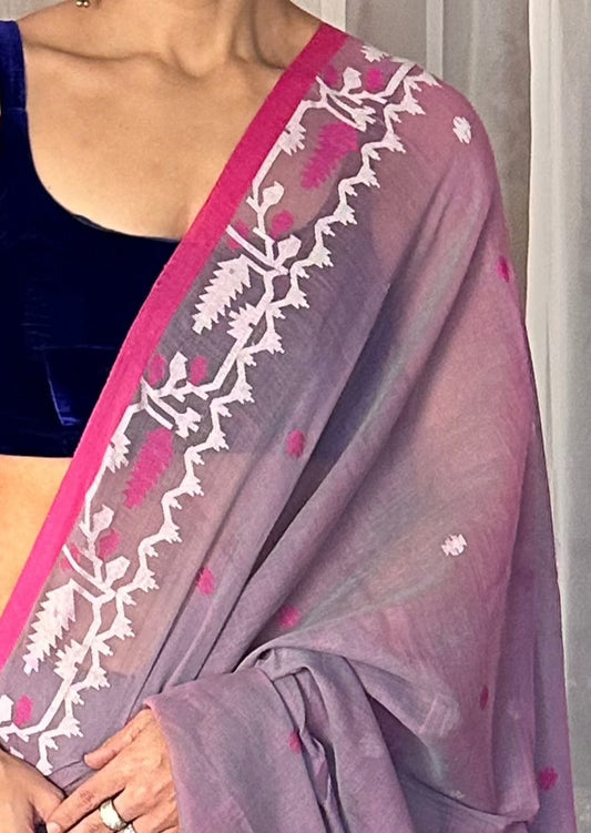 Dual Toned Hand Spun Muslin Khaadi Supremely Soft Jamdani Sari