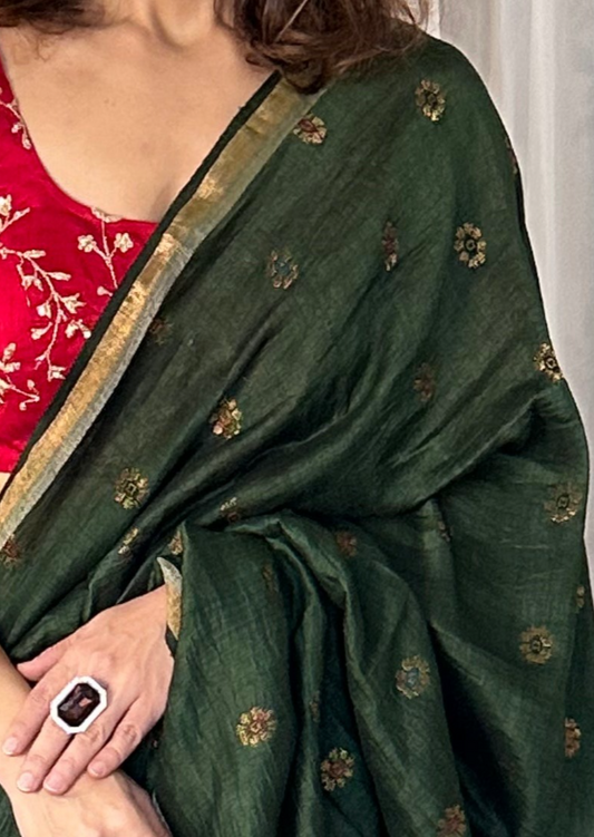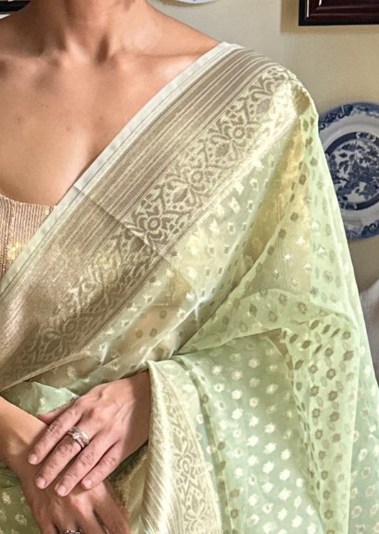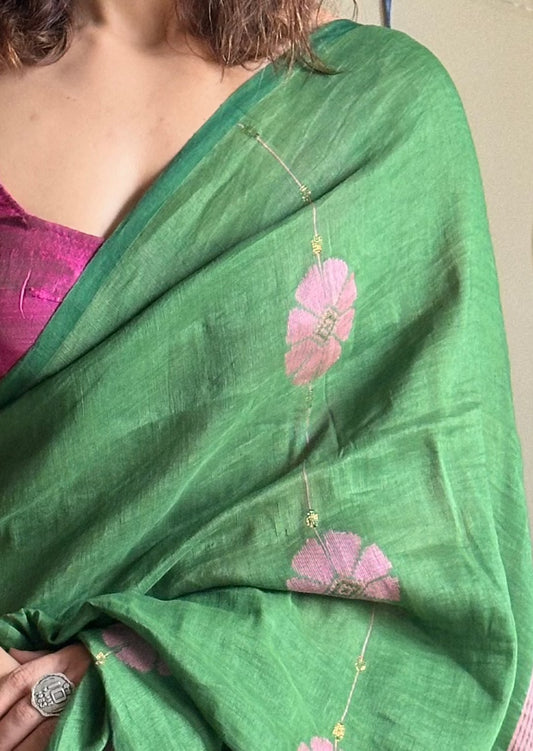 Green Pure Mul Mul Handwoven Tissue Cotton Sari