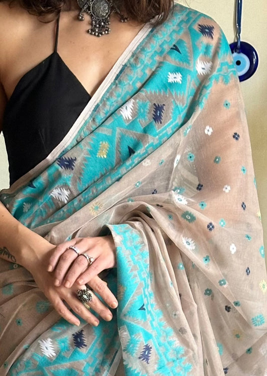 Light Blue Jacquard Weaving Cotton Silk Jamdani Sari