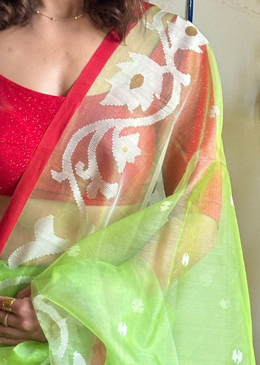 Green Pure Muslin Silk Jamdani with Intricate Needle Work