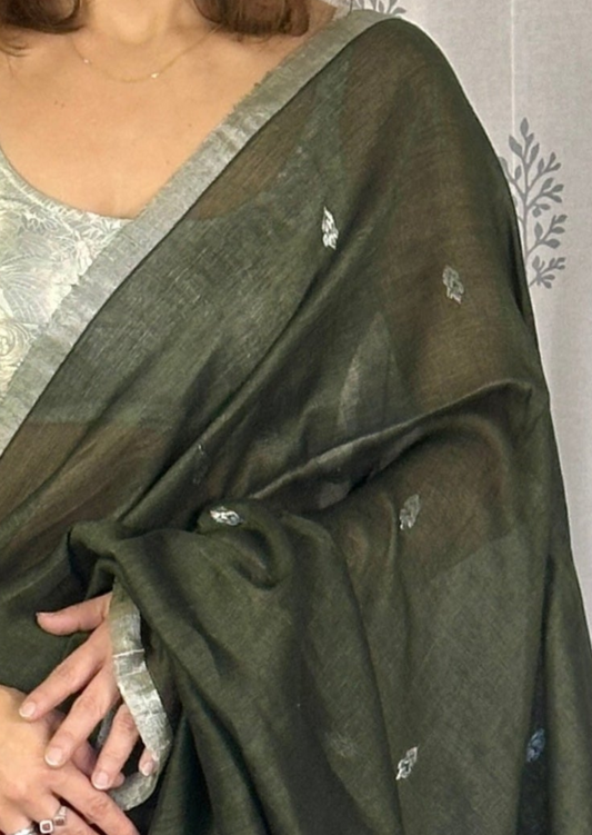 Green Pure Linen Sari with Banarasi Silver Zari Work