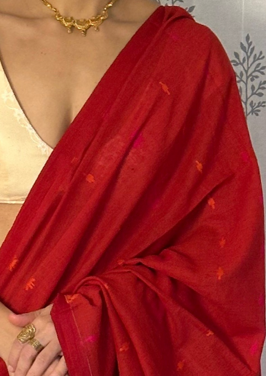 Red Handloom Pure Soft Cotton Jamdani Sari with Woven Flowers