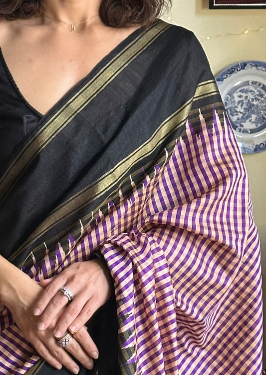 Purple Pure Raw Silk with Small Checks, Khapa Contrast Pallu, Temple Border