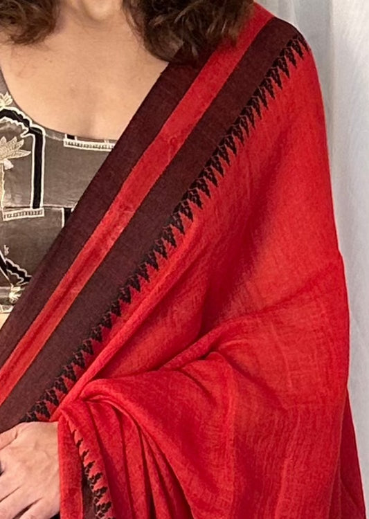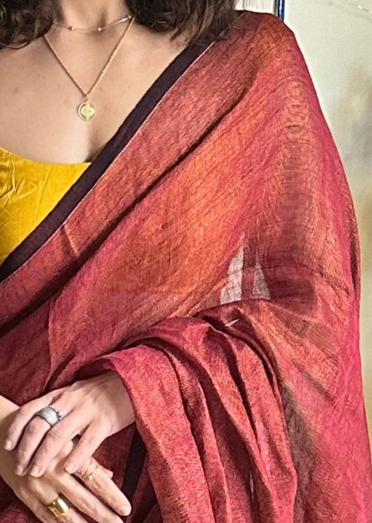 Red & Black Handloom Linen Tissue Sari with Contrast Zari Woven Pallu