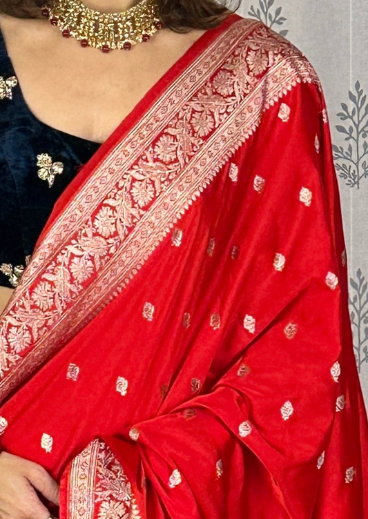 Red Mashru Silk Banarasi Saree with Silver & Gold Zari Work