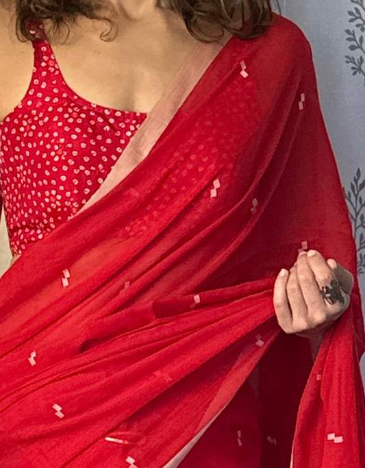 Red & Blue Hand Dyed Tie & Dye Pure Mul Mul Cotton Saree with Self Body Checks