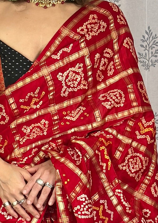 Red & Cream Natual Dyed Bagru Hand Block Print Chanderi Silk Sari with Gold Print