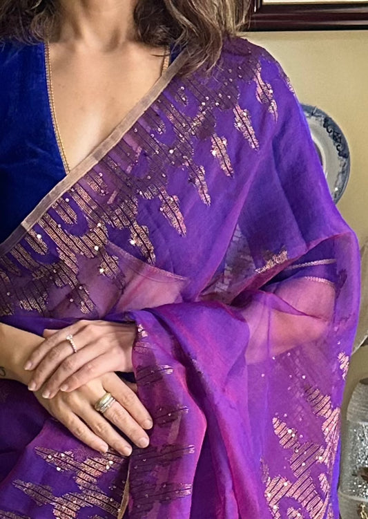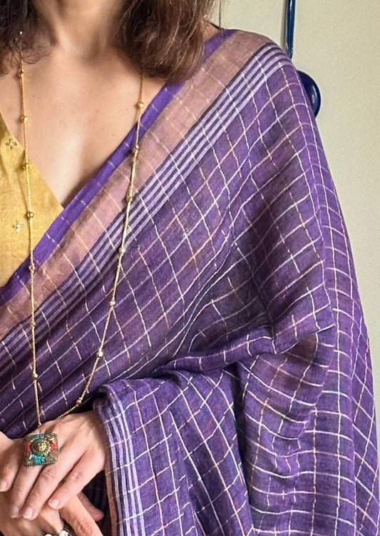 Purple Pure Linen Sari with Silver and Gold Zari Checks