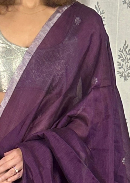 Purple Pure Linen Cotton Jamdani Sari with Zari Work