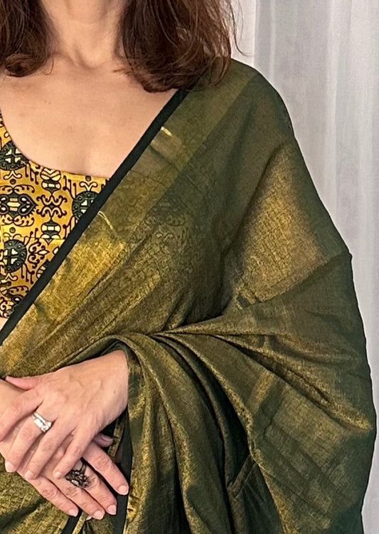 Moss Green & Gold Pure Mul Mul Handwoven Tissue Cotton Saree with Thick Green Border