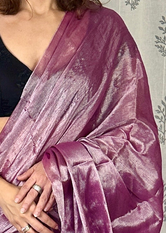 Purple & Silver Pure Mul Mul Handwoven Tissue Cotton Saree
