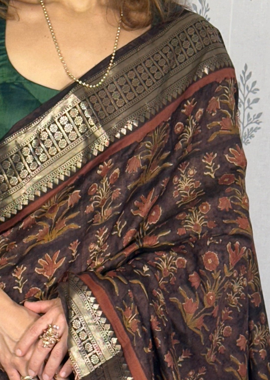 Brownish Black Sanganeri Handblock Print Chanderi Silk Saree with Zari Woven Border & Rich Zari Pallu