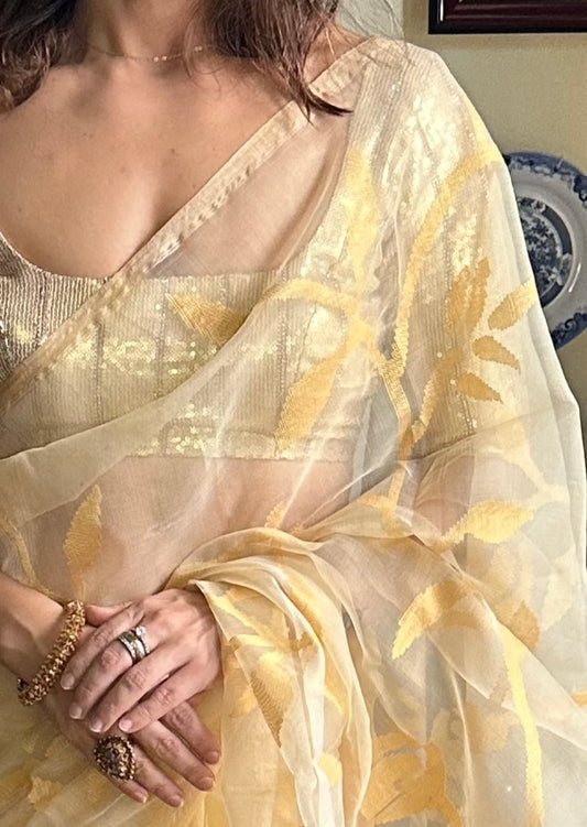 Cream Pure Muslin Silk Jamdani Saree with Intricate Hand Work
