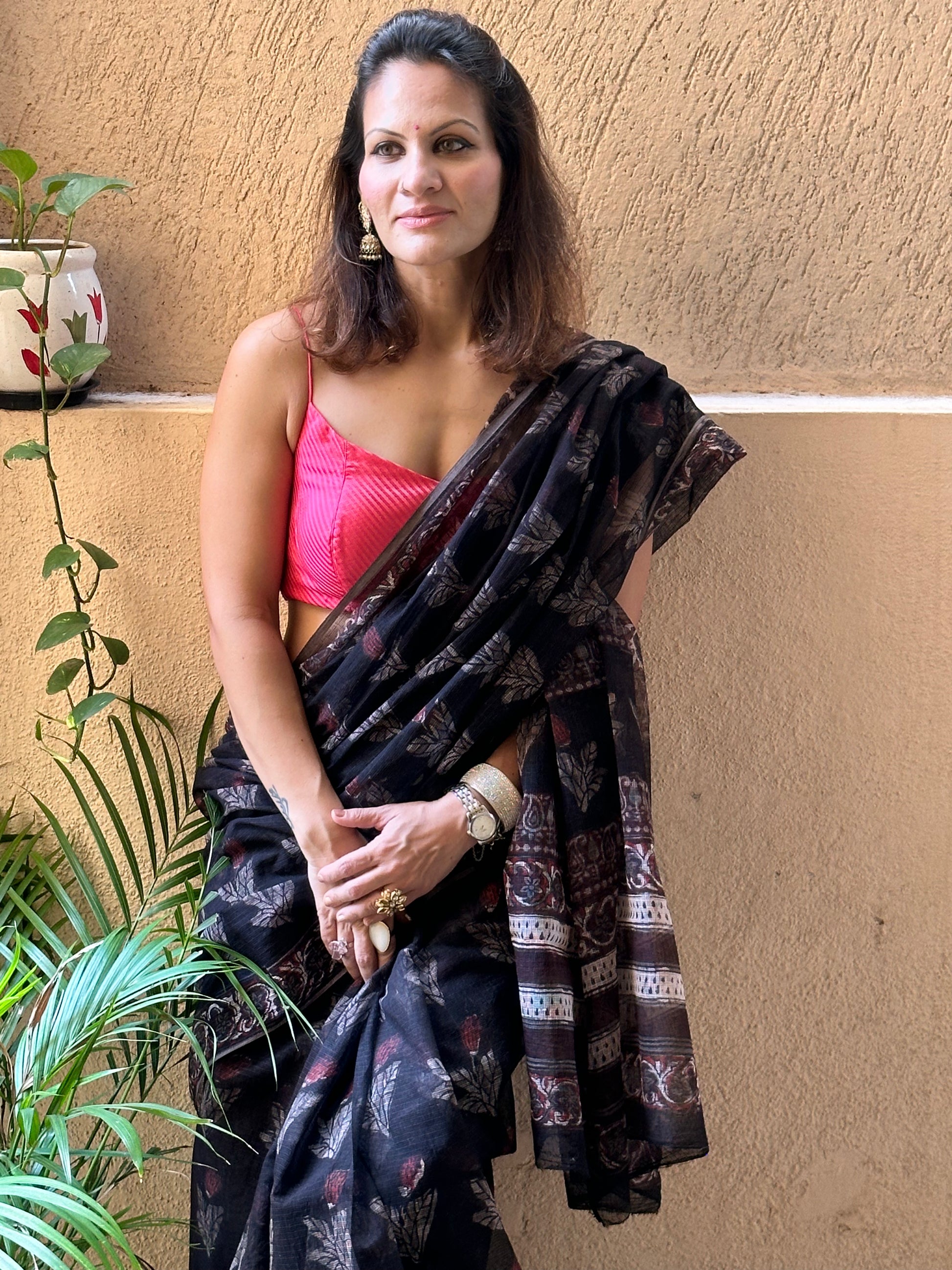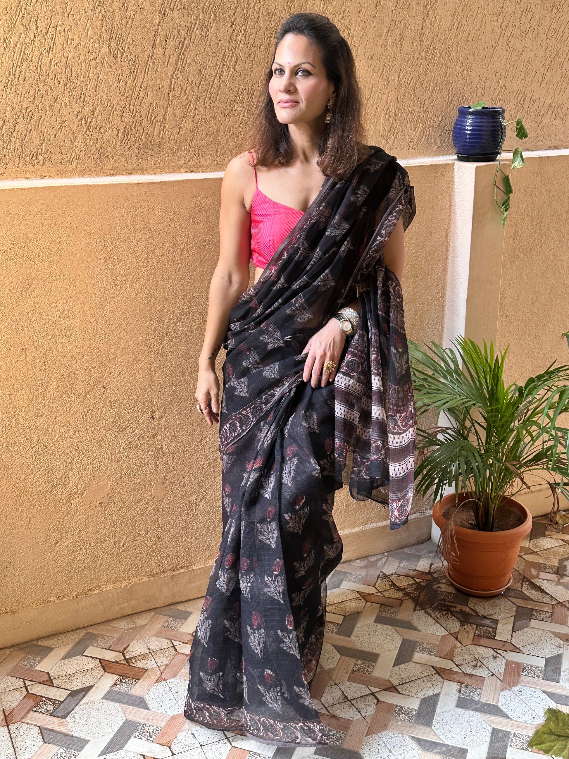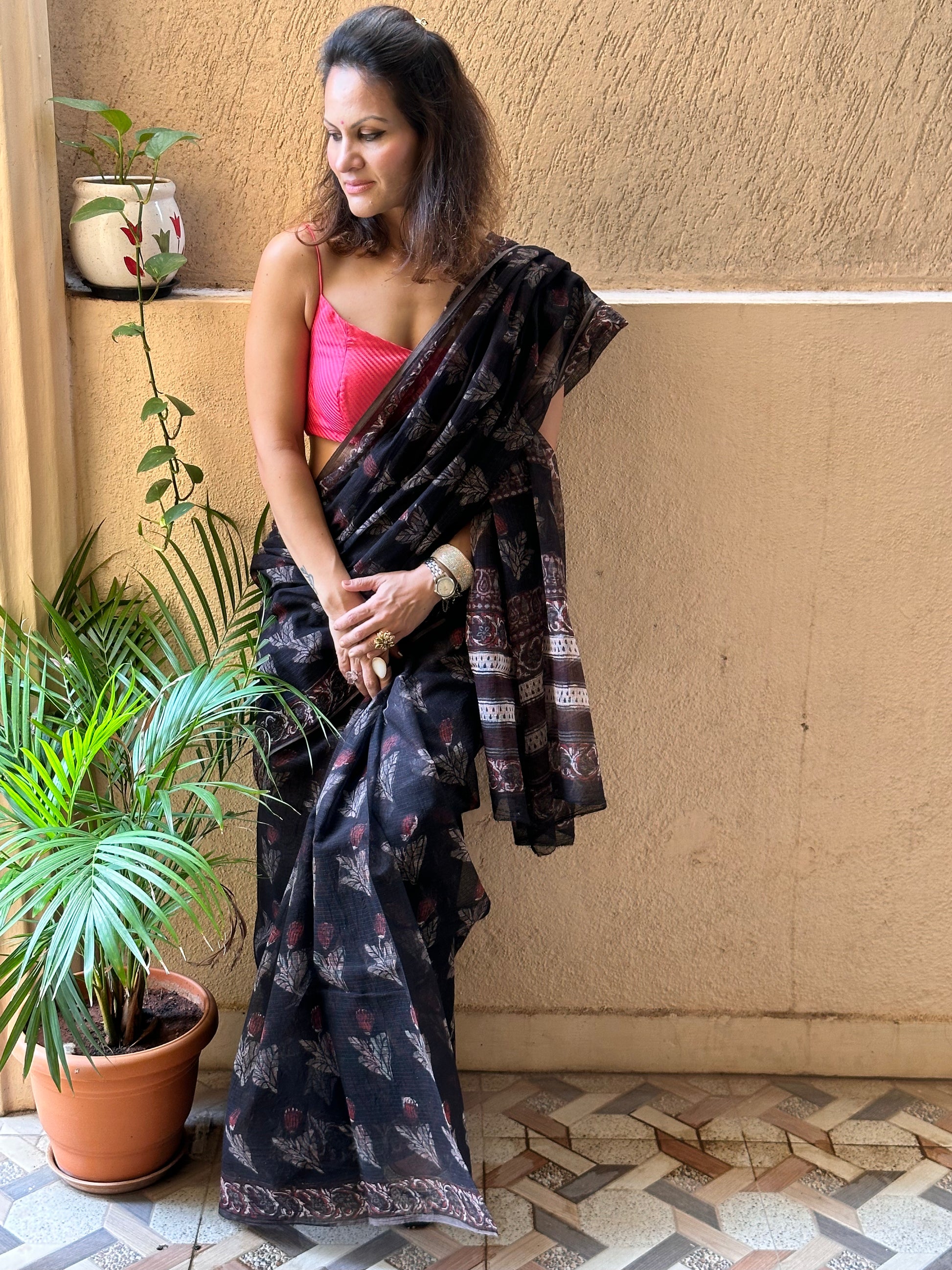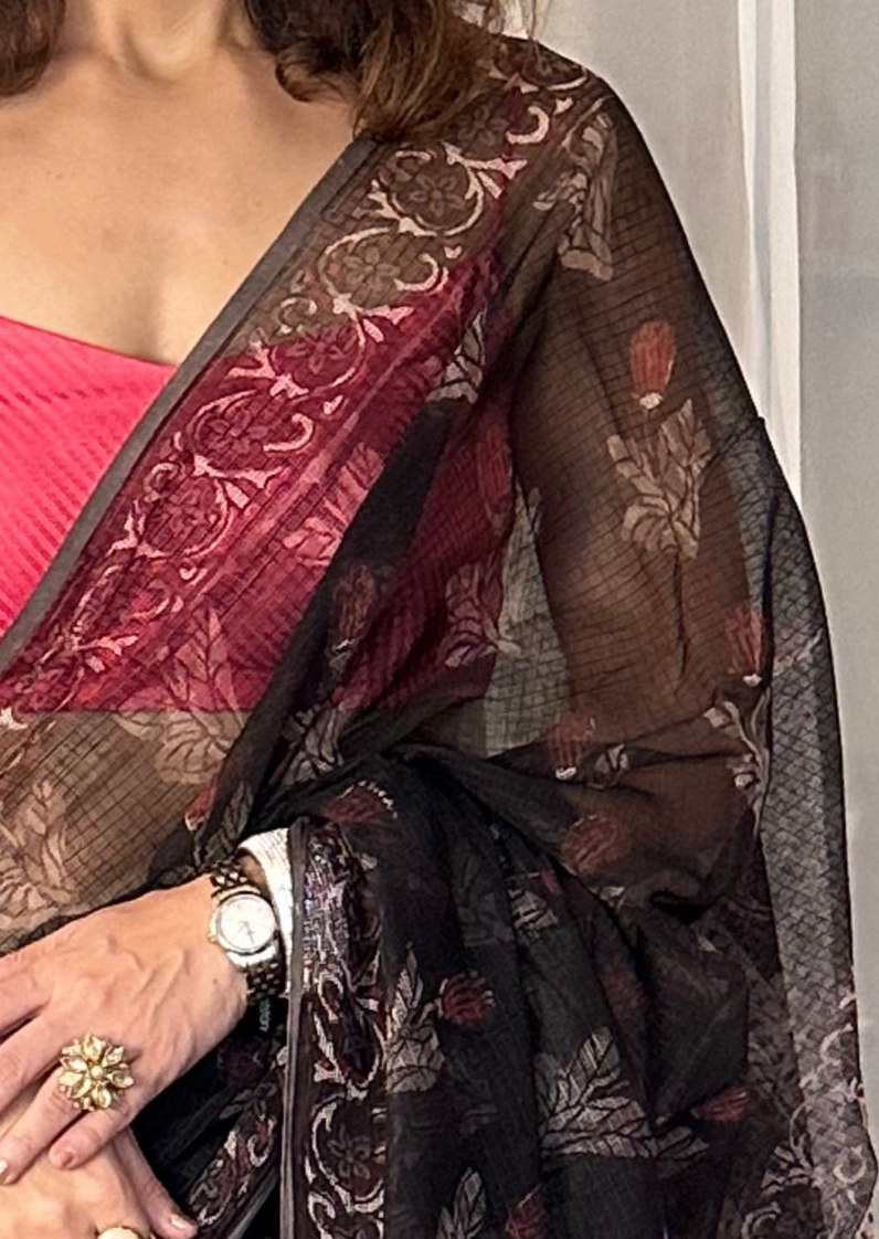 Black & Pink Natural Vanaspati Block Print Kota Cotton Sari