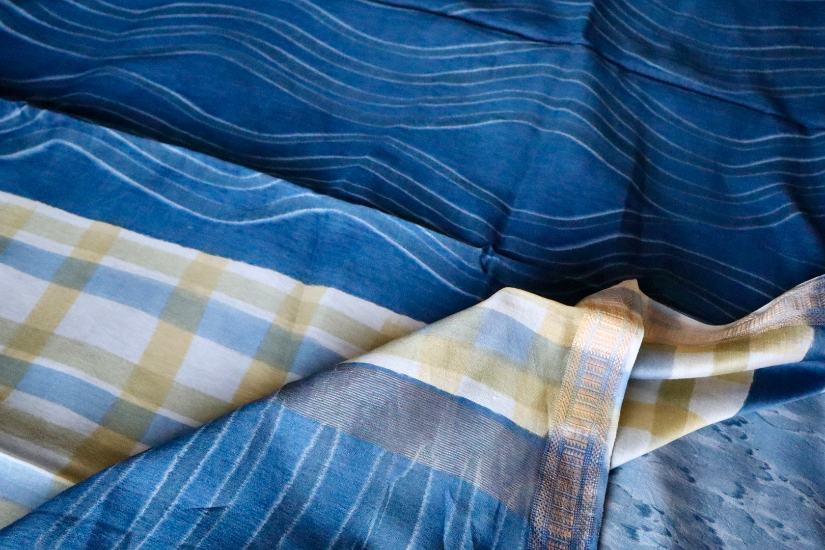 Blue Maheshwari Saree with Block Print and Checks