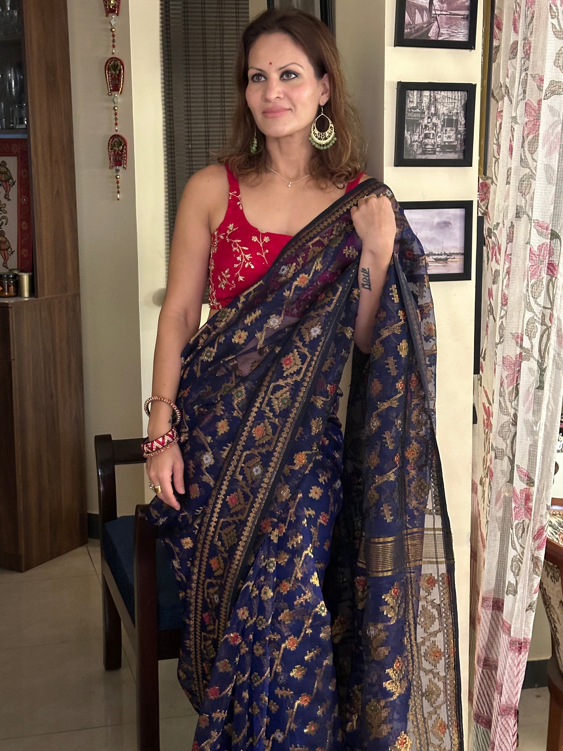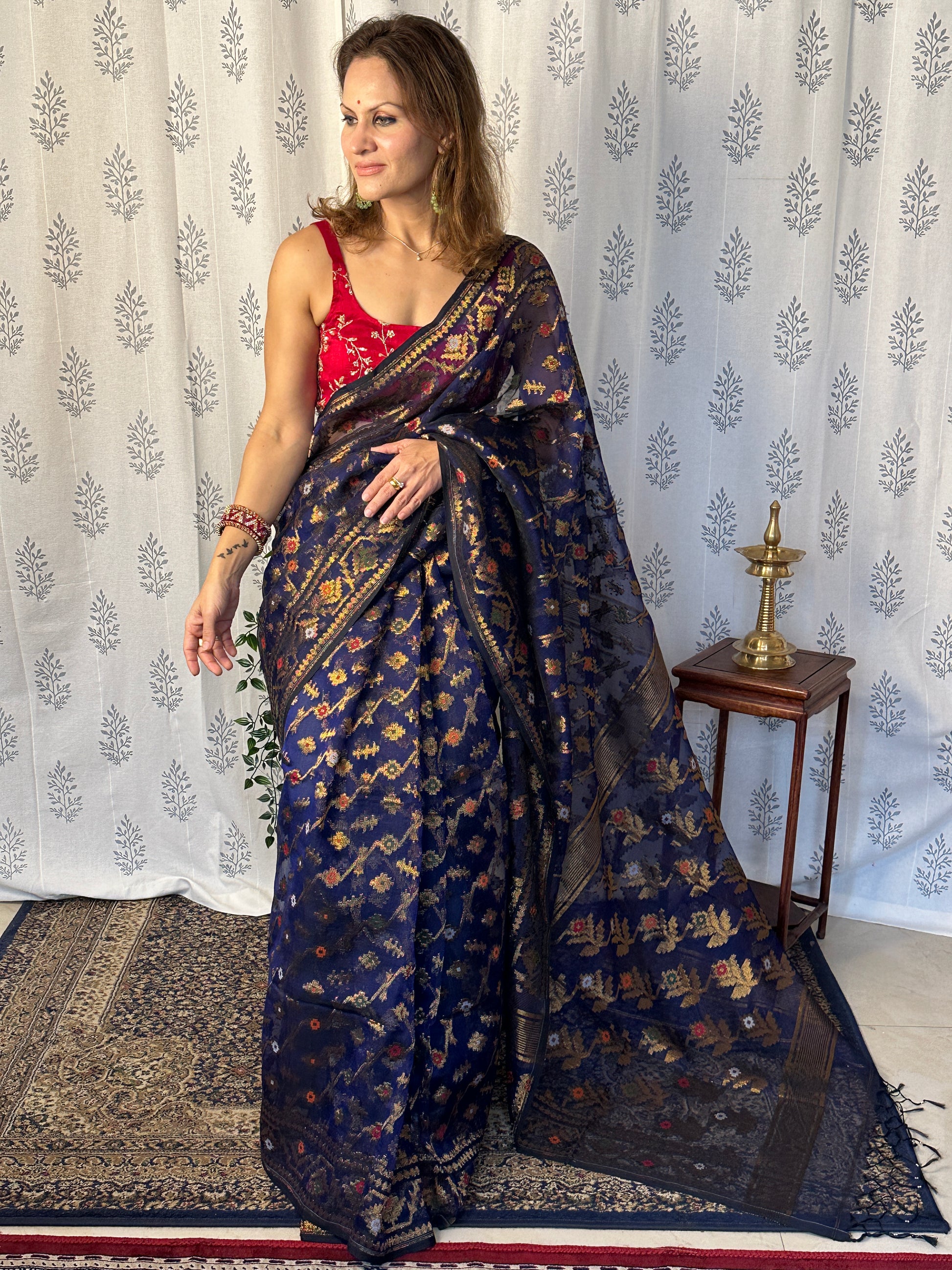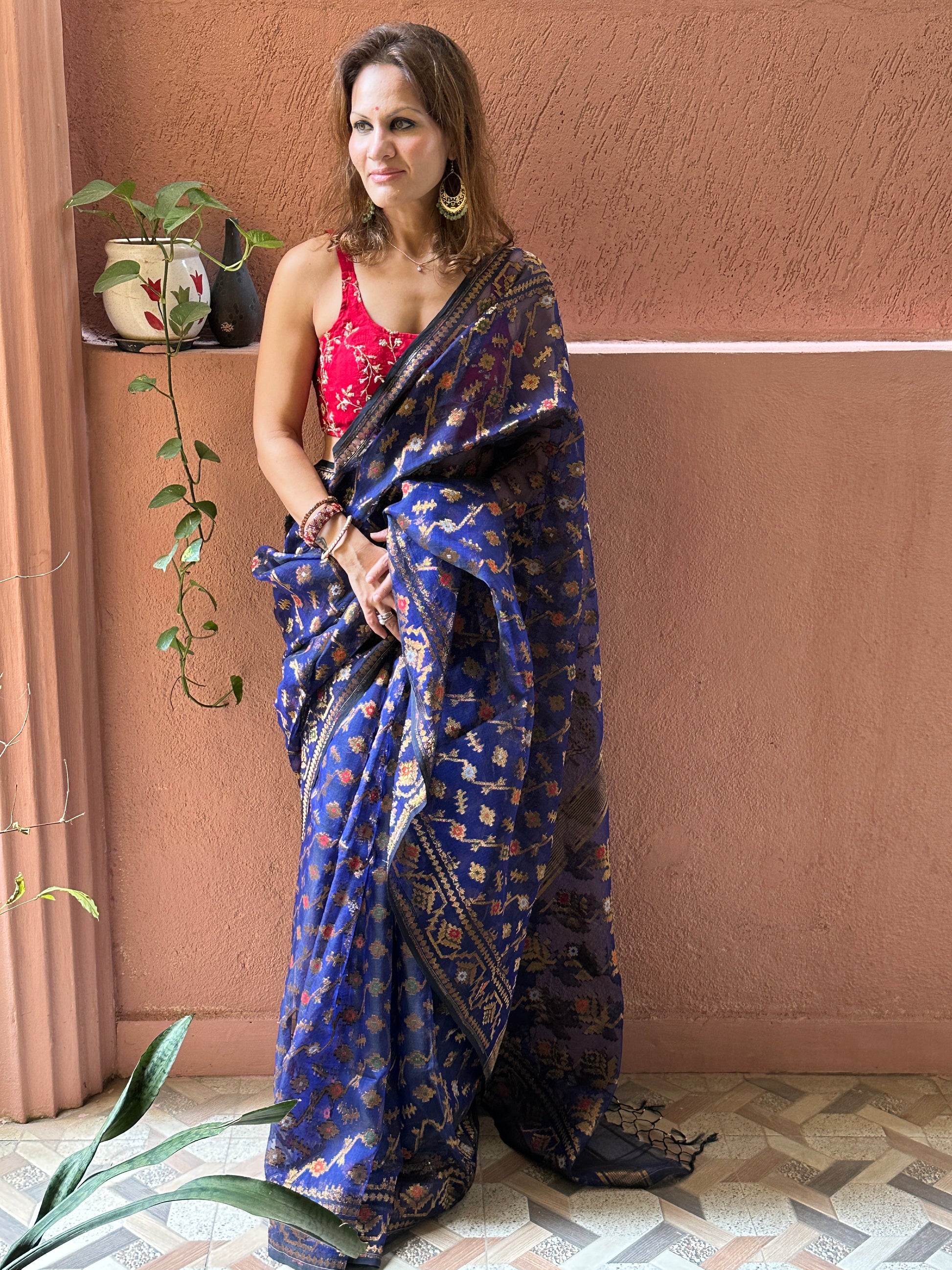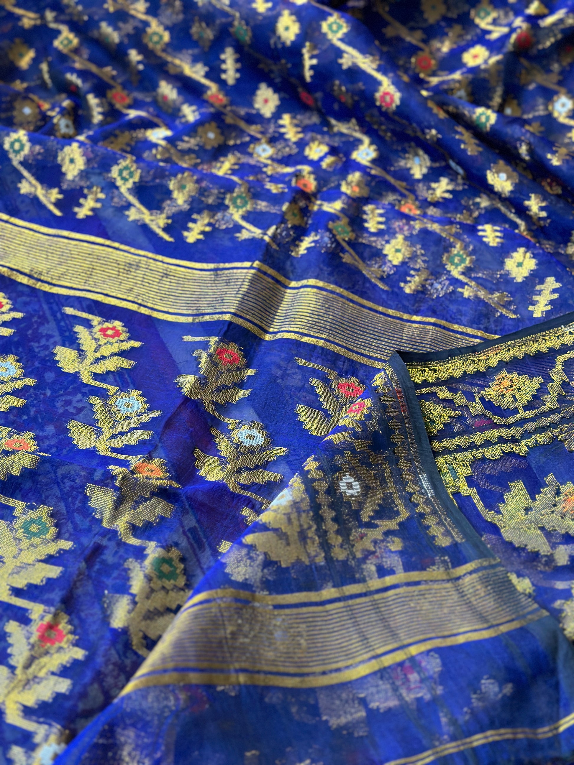 Experience the luxurious royal blue muslin silk handloom Jamdani sari. Crafted from pure muslin, this sari is exquisitely embellished with delicate Jamdani weaving - sure to make a bold statement!