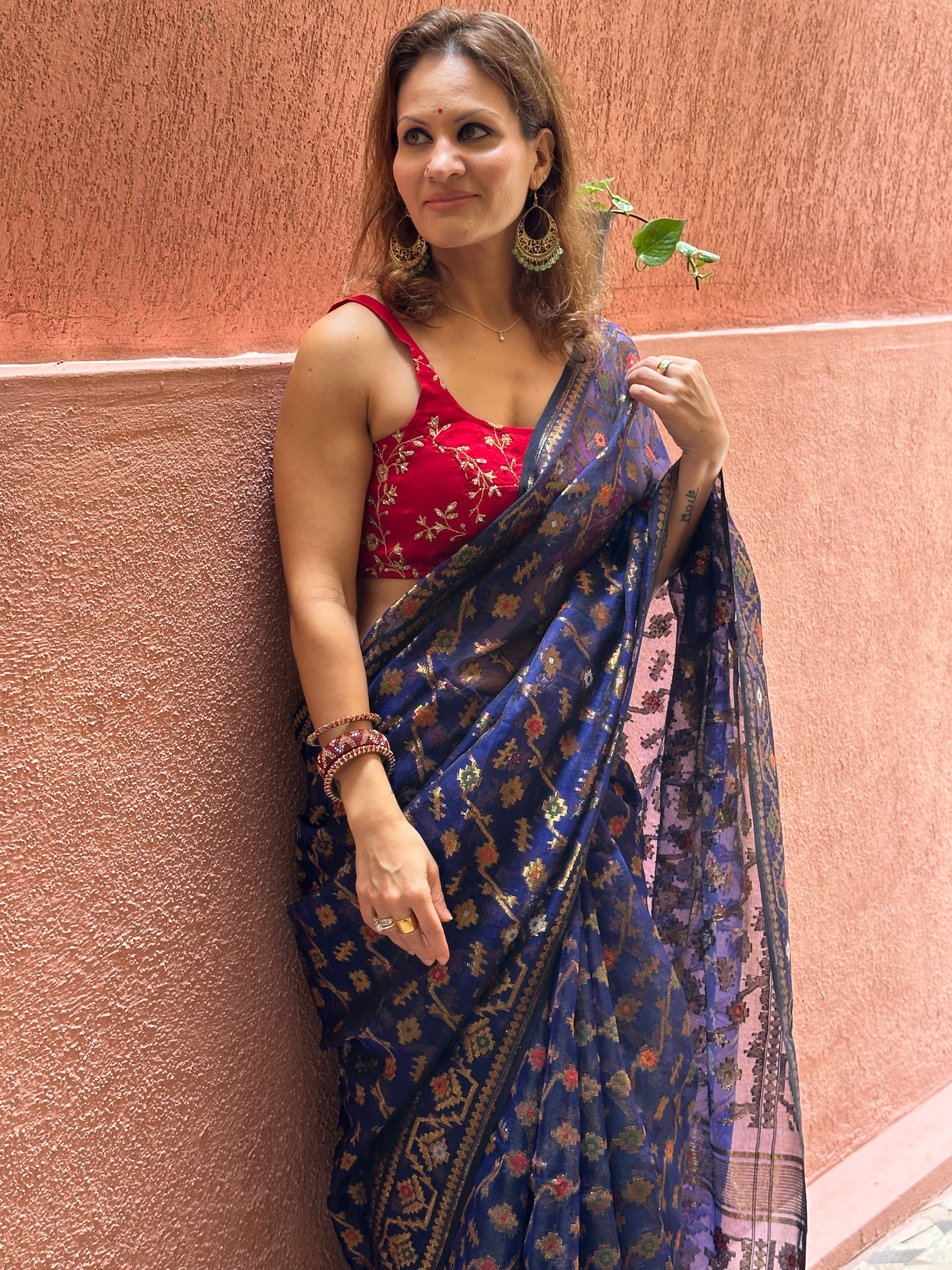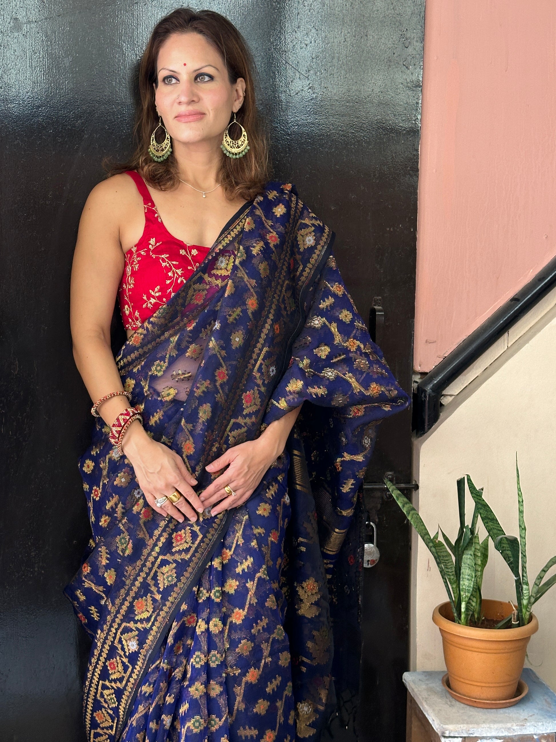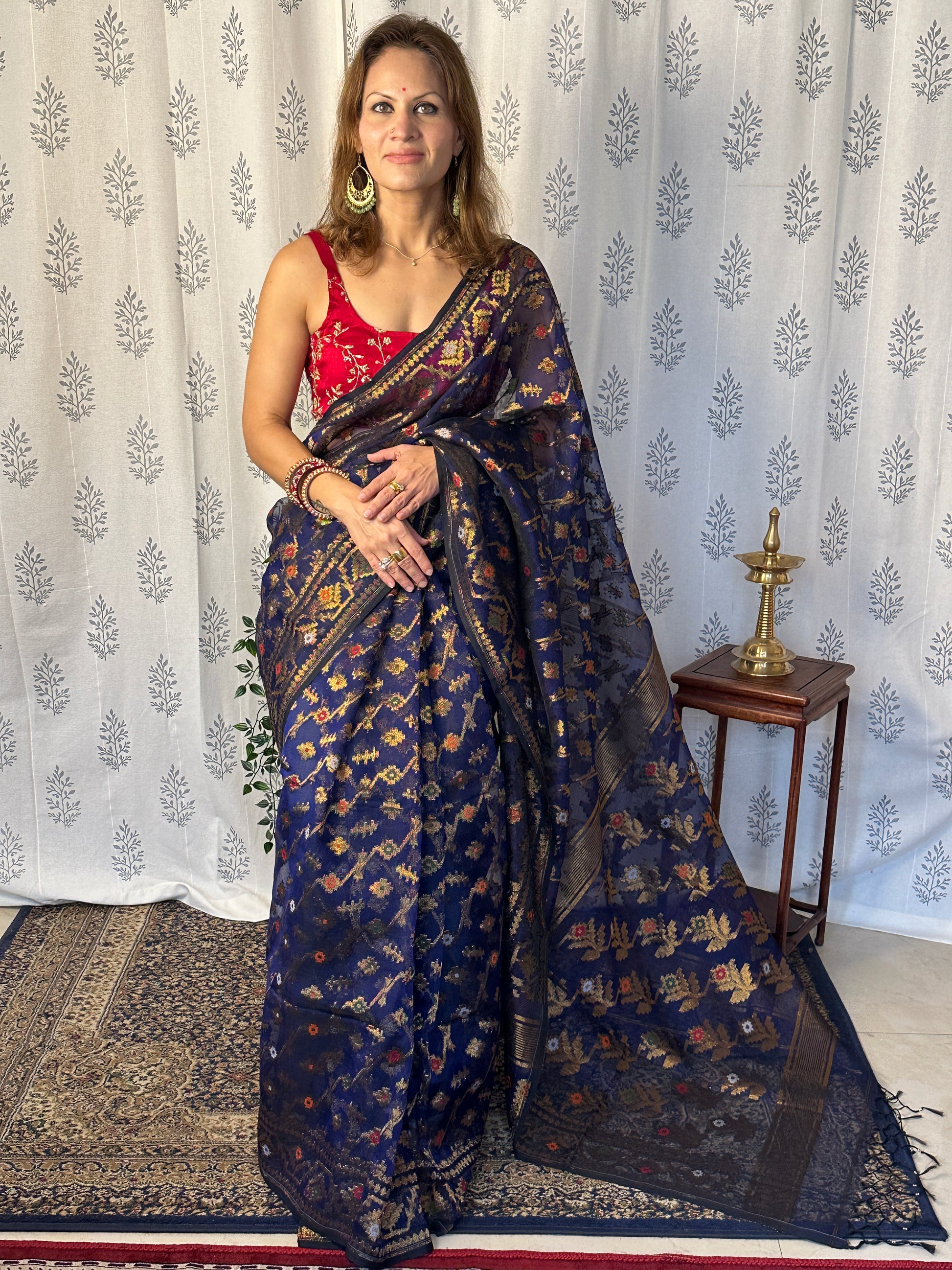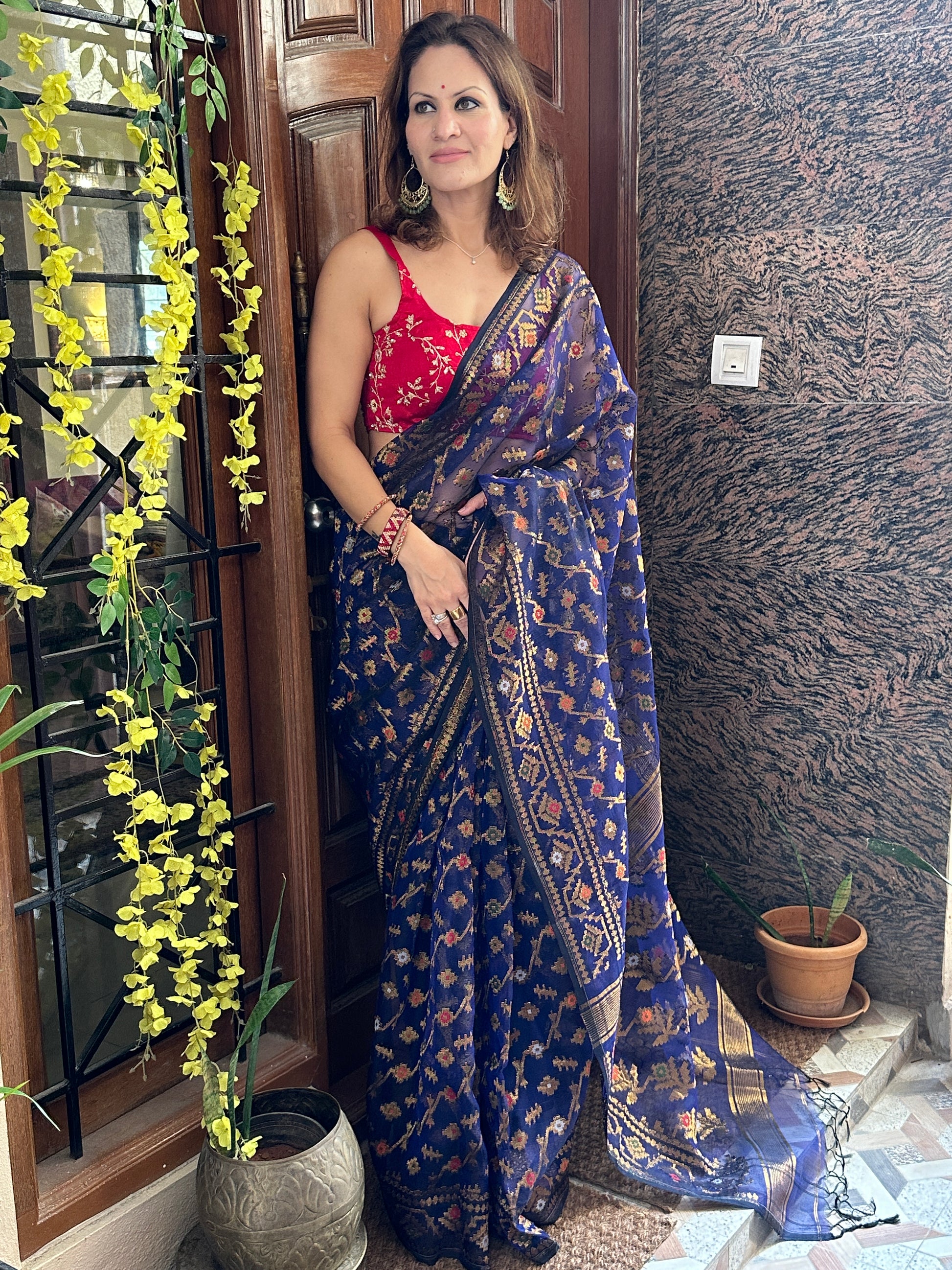 Experience the luxurious royal blue muslin silk handloom Jamdani sari. Crafted from pure muslin, this sari is exquisitely embellished with delicate Jamdani weaving - sure to make a bold statement!