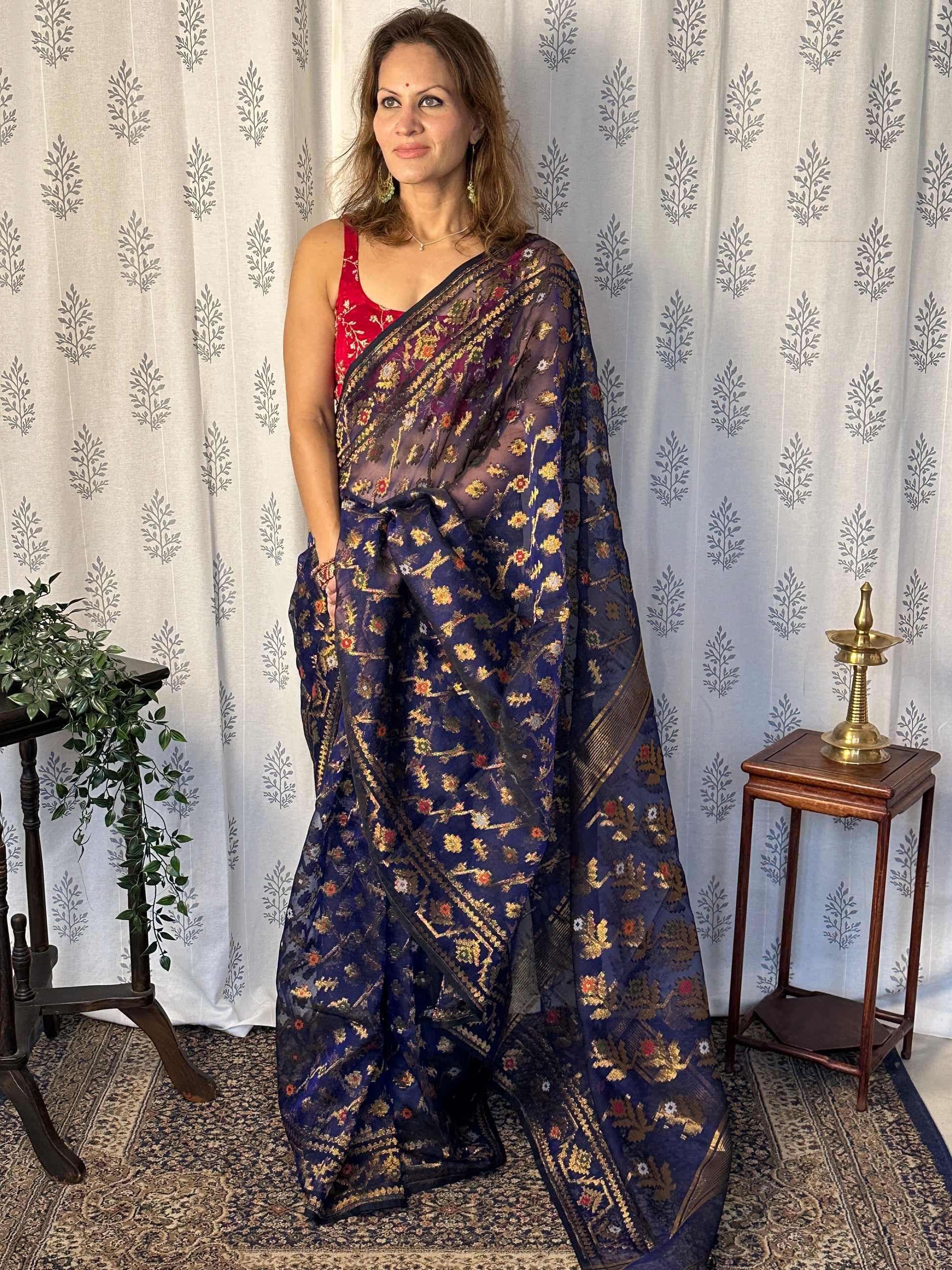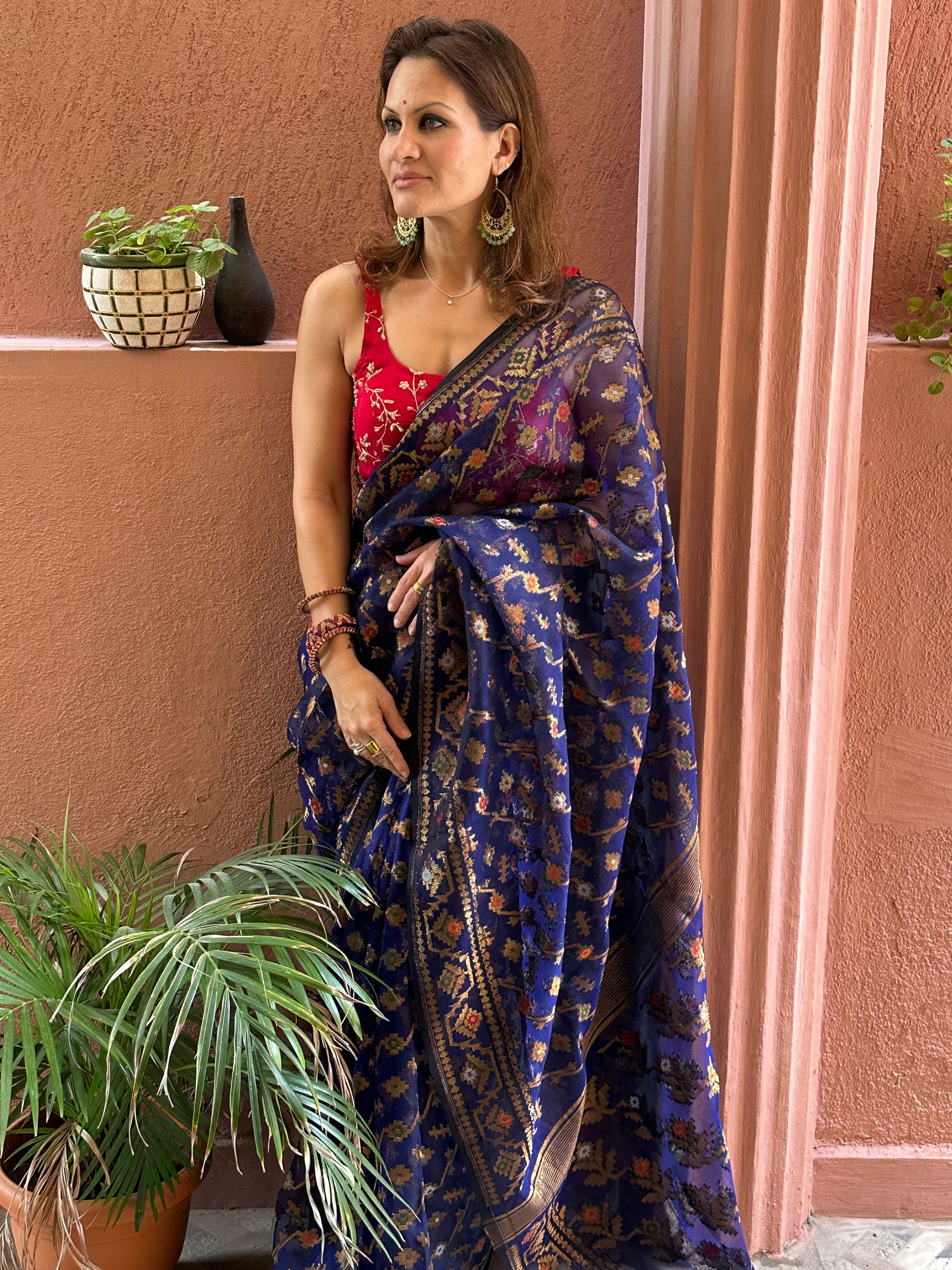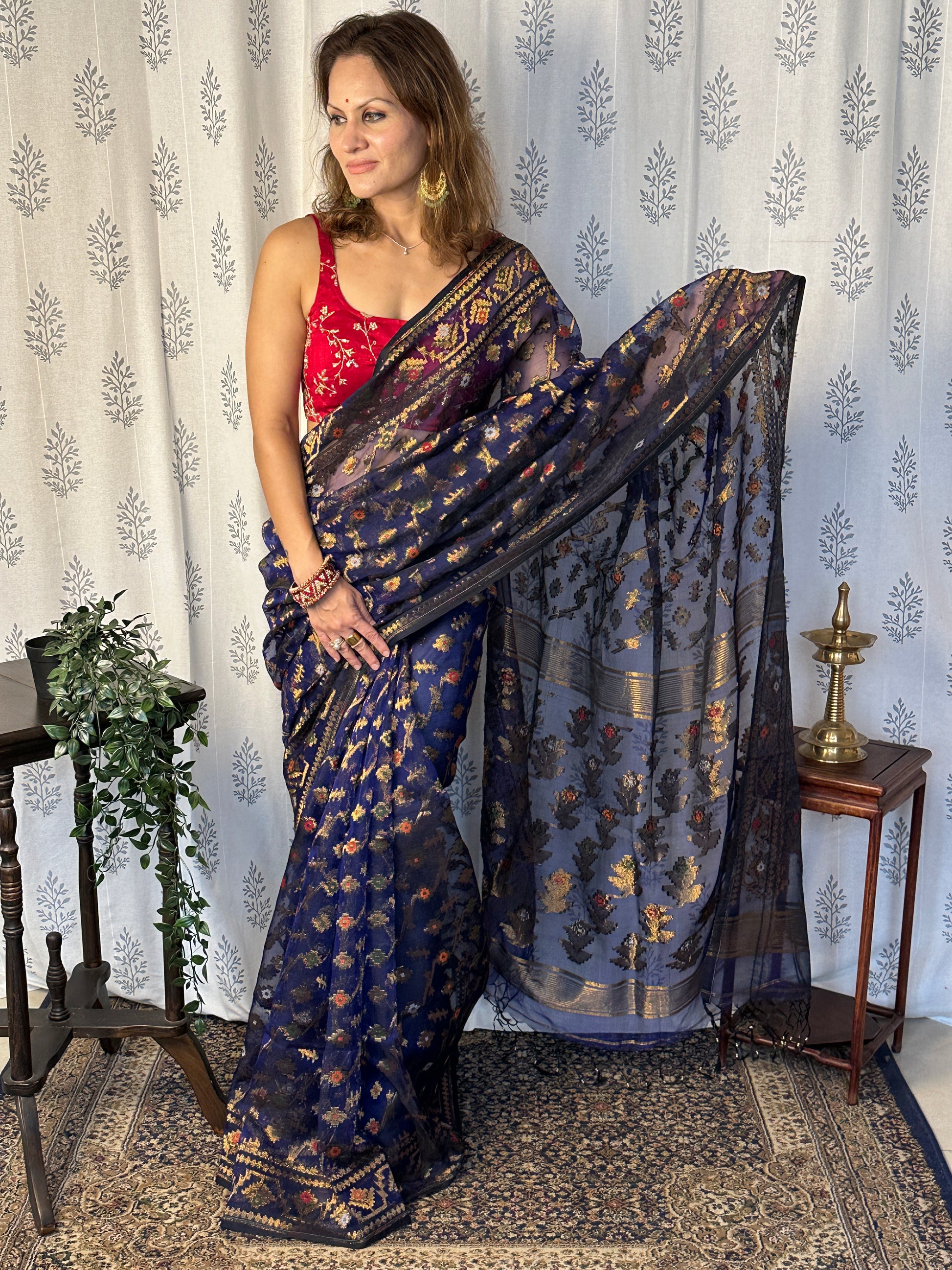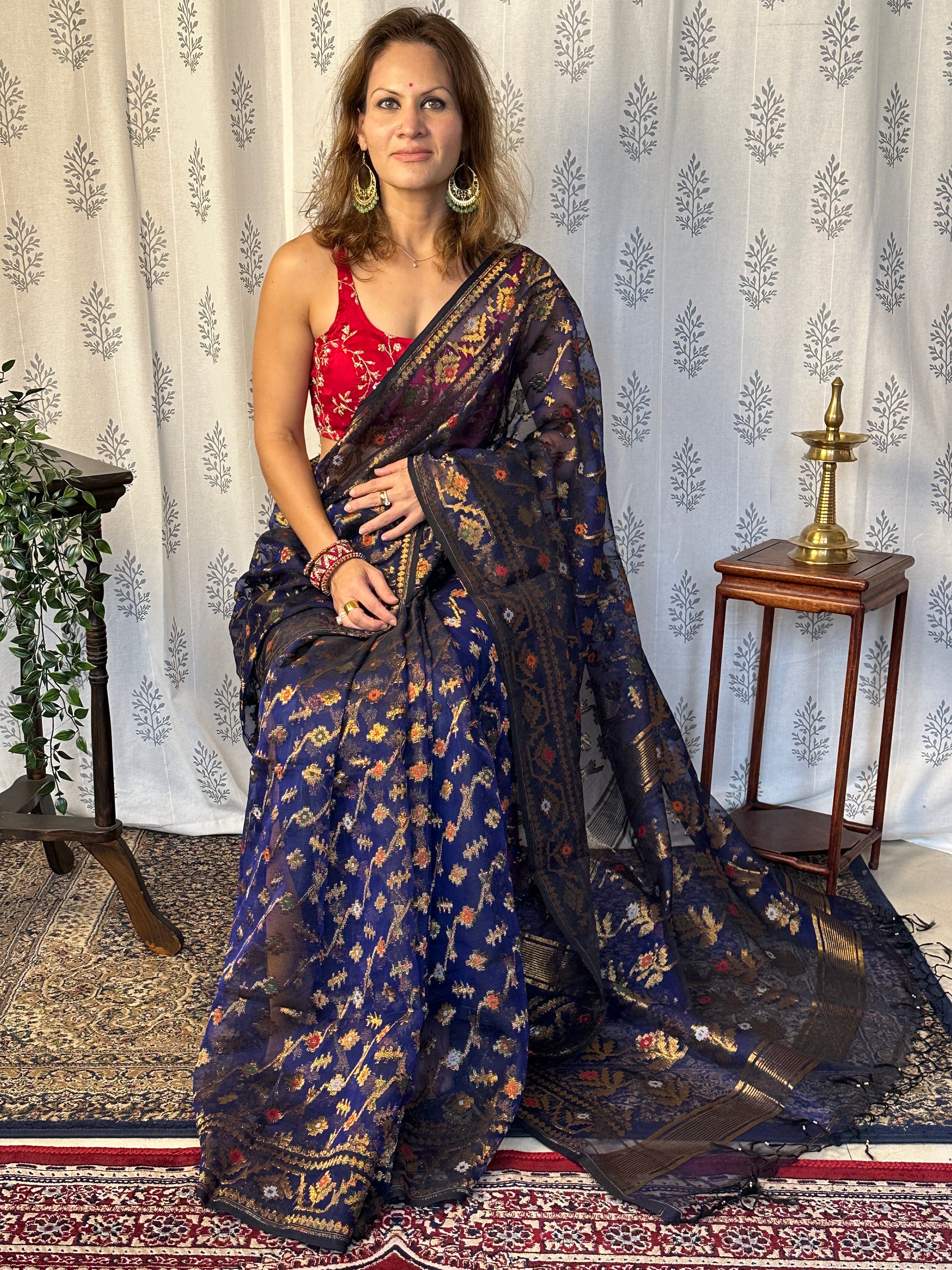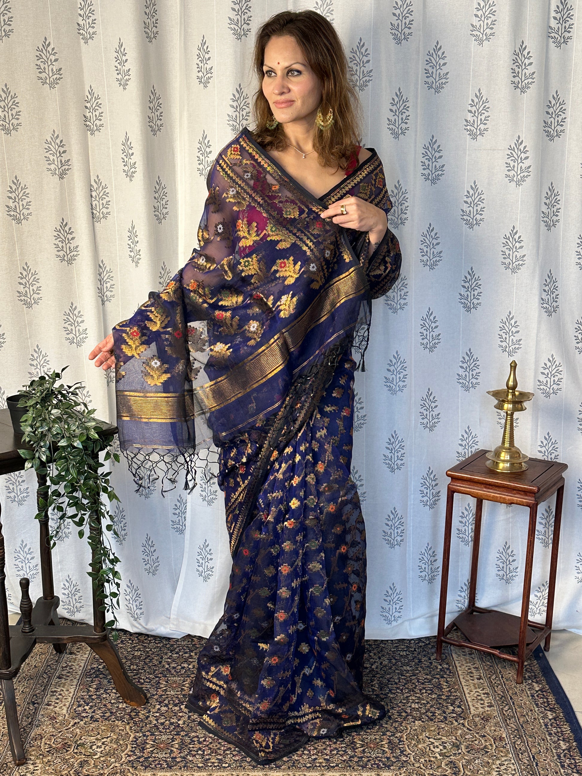 Experience the luxurious royal blue muslin silk handloom Jamdani sari. Crafted from pure muslin, this sari is exquisitely embellished with delicate Jamdani weaving - sure to make a bold statement!