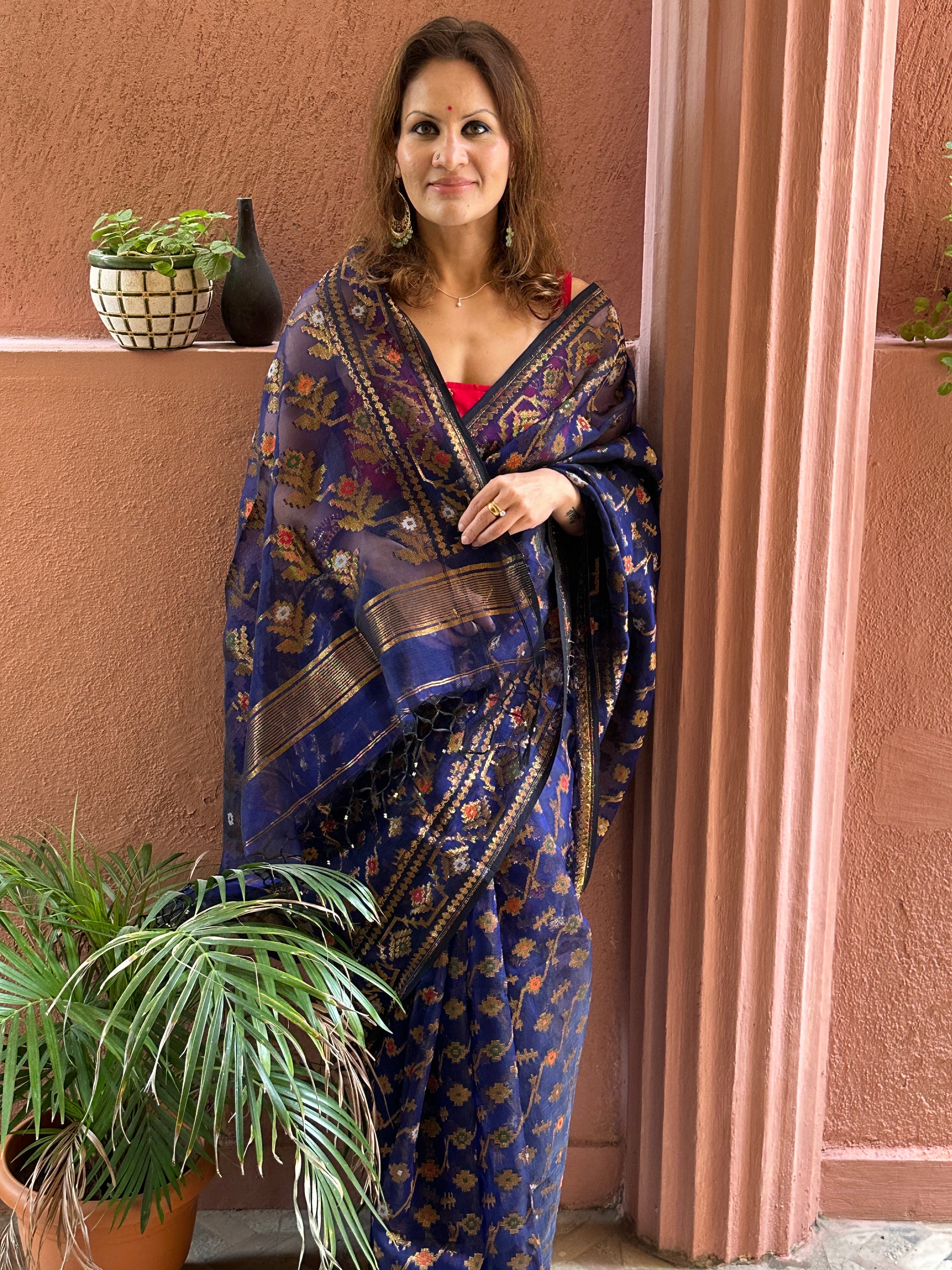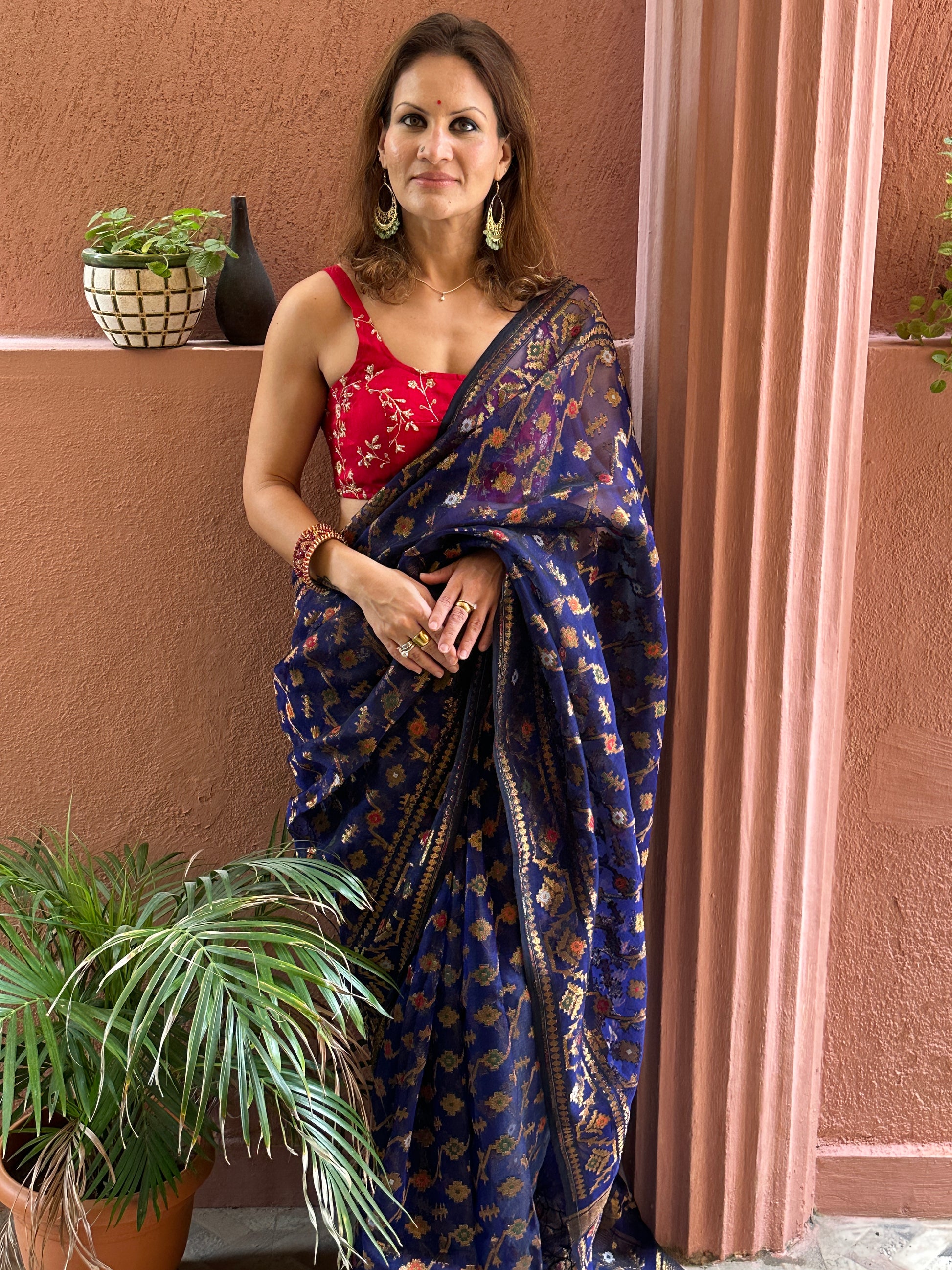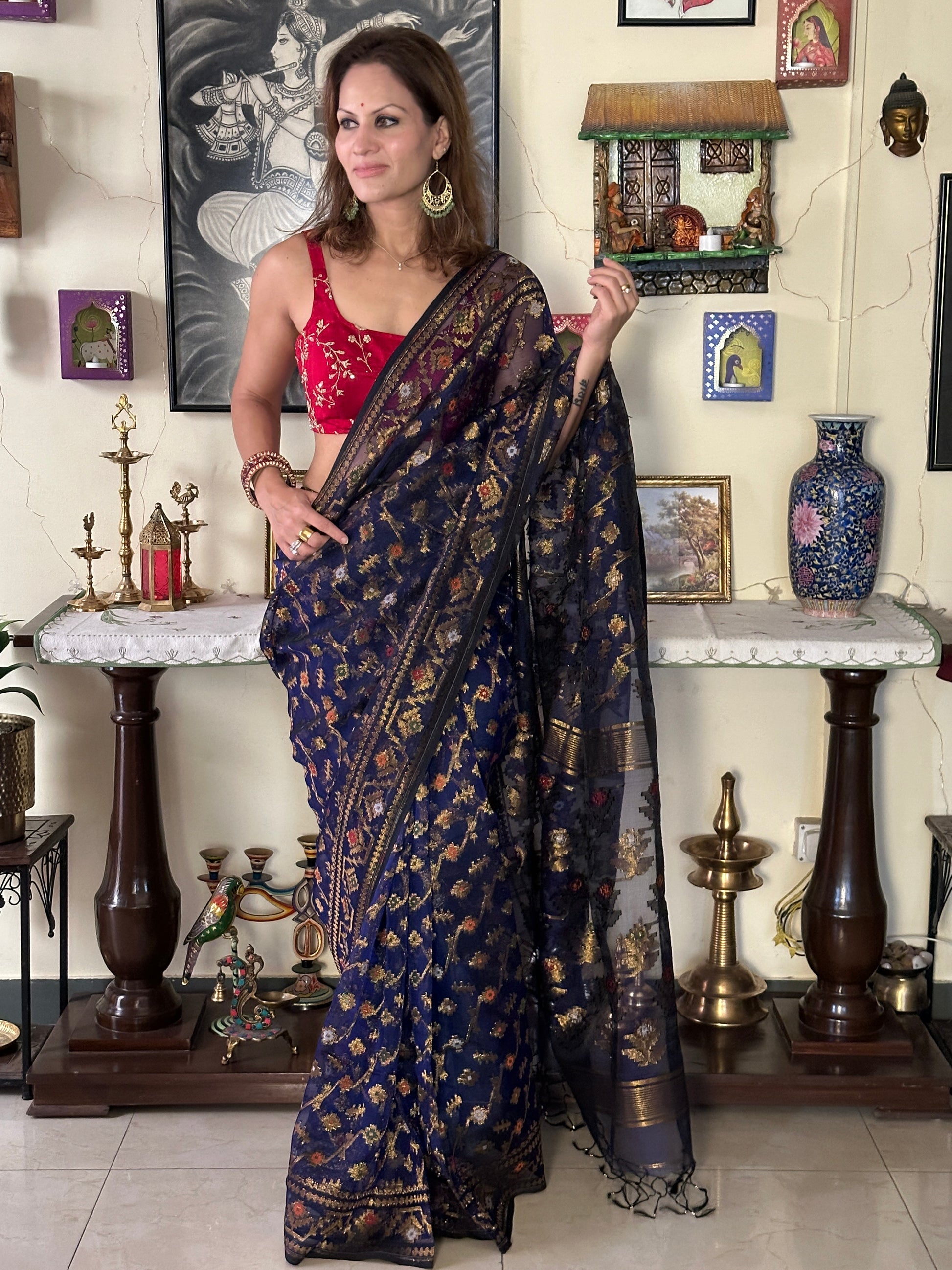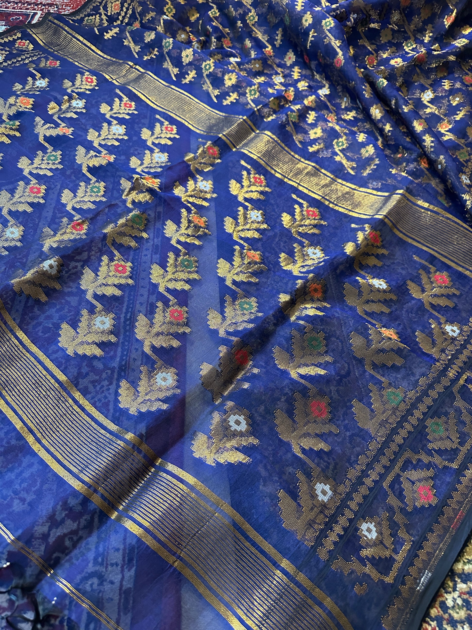 Experience the luxurious royal blue muslin silk handloom Jamdani sari. Crafted from pure muslin, this sari is exquisitely embellished with delicate Jamdani weaving - sure to make a bold statement!