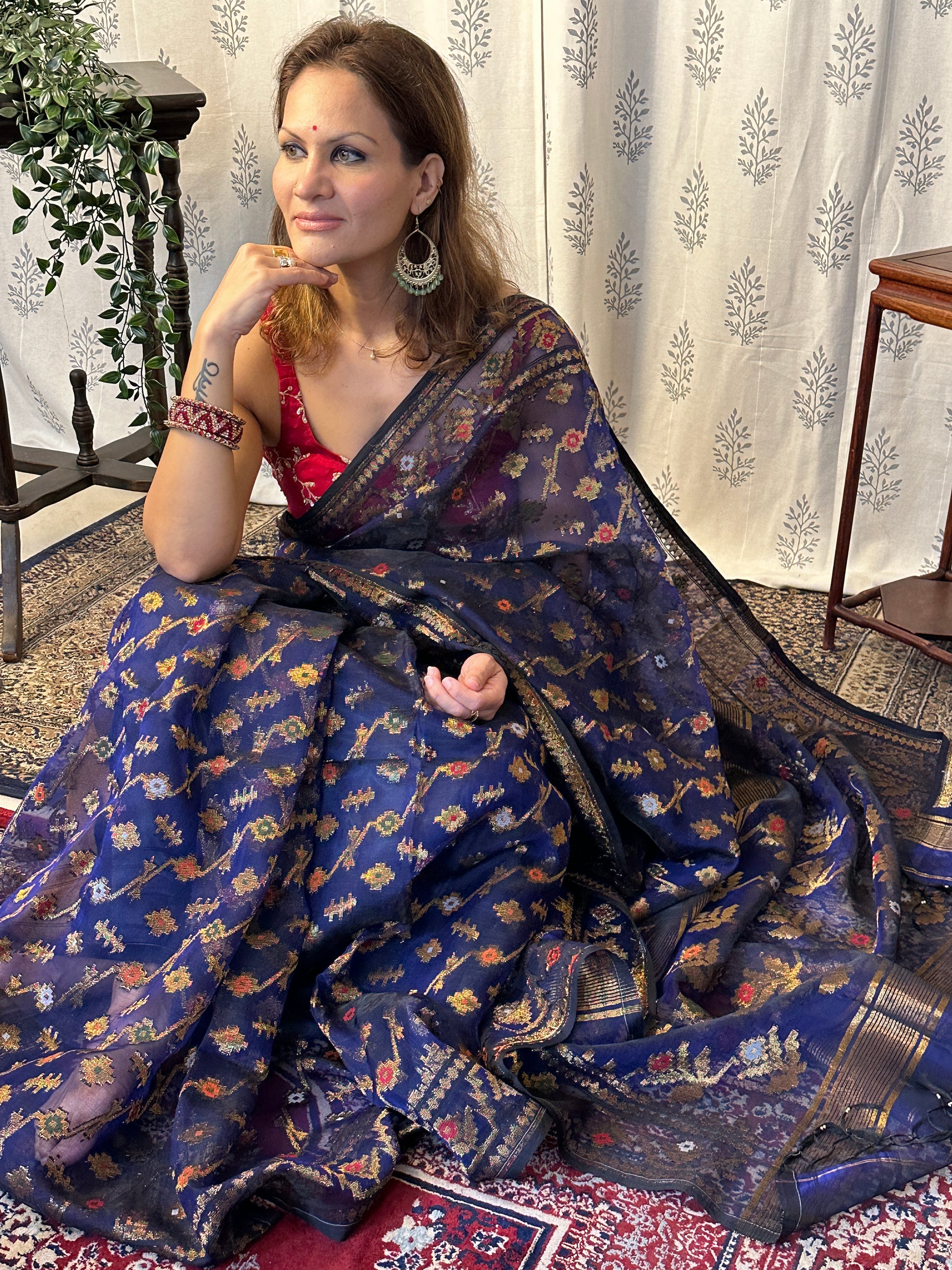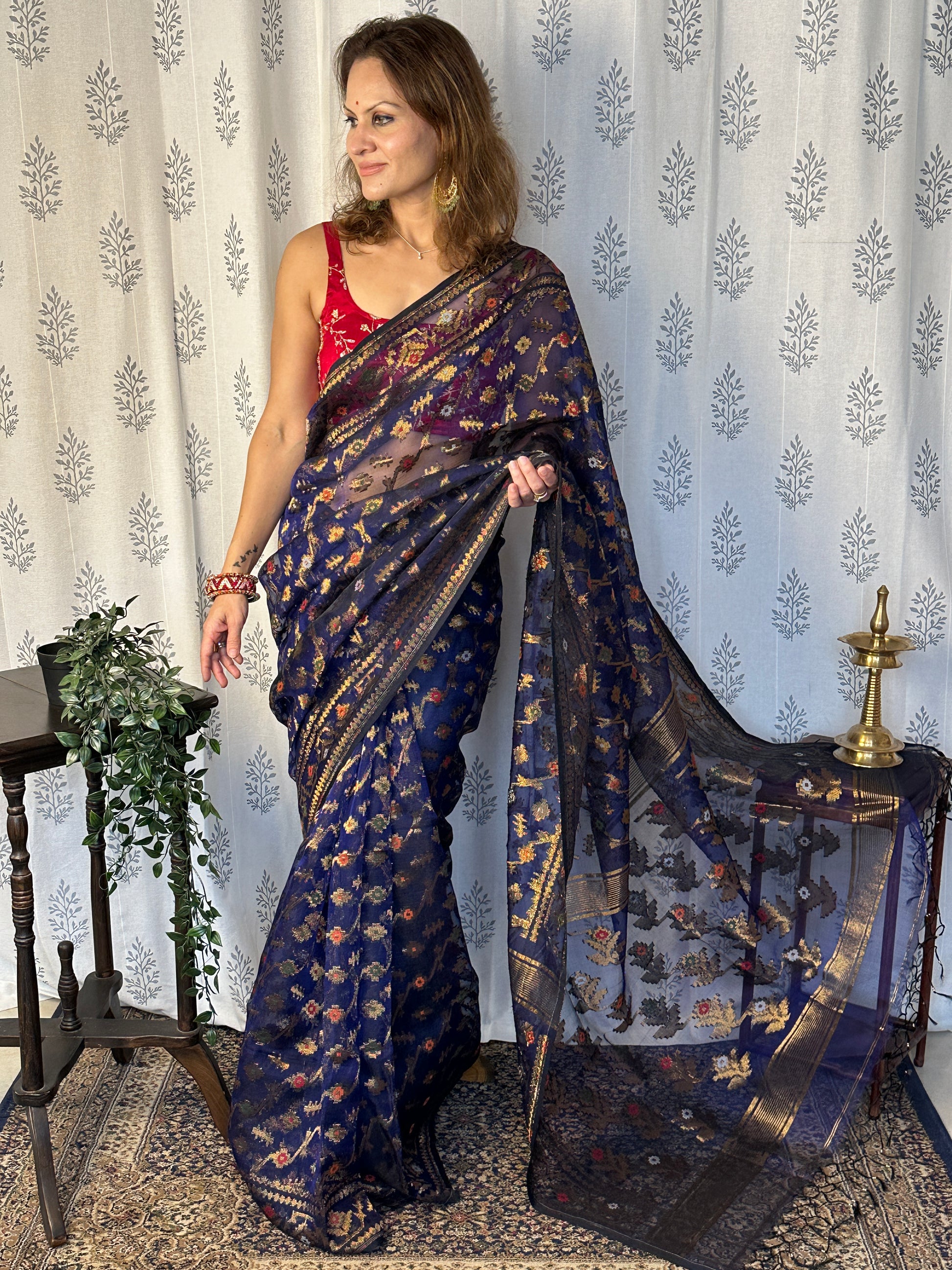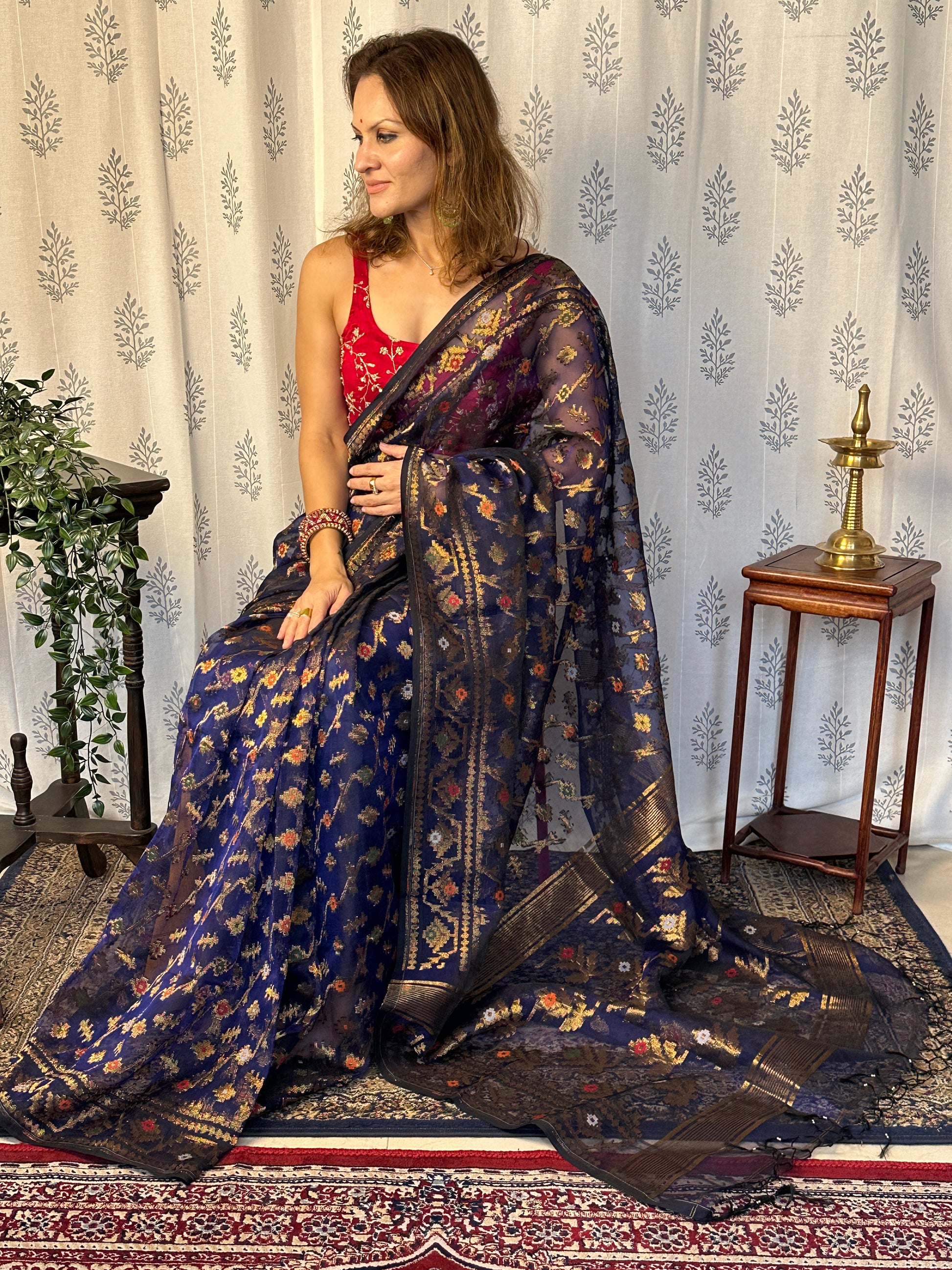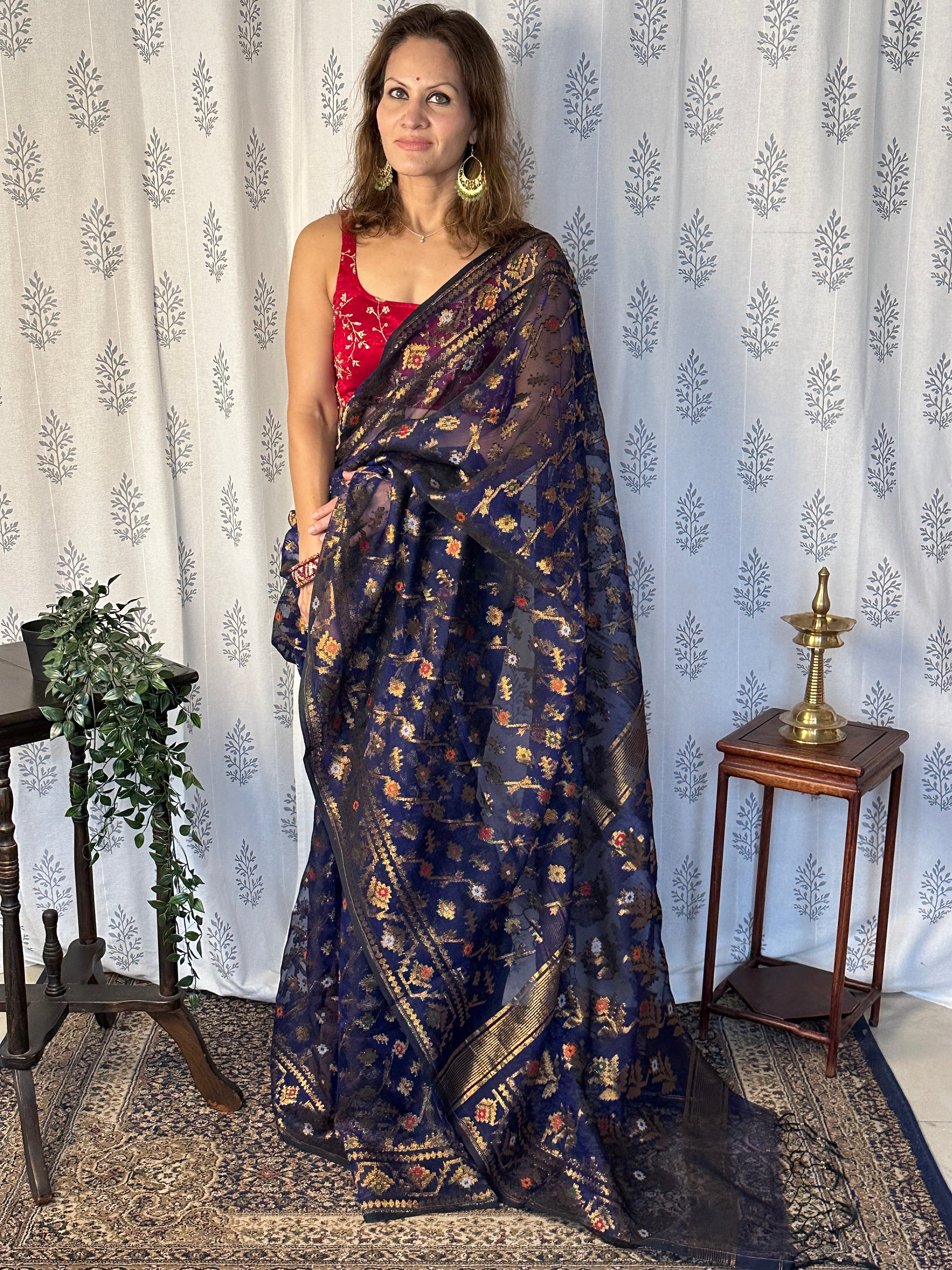 Experience the luxurious royal blue muslin silk handloom Jamdani sari. Crafted from pure muslin, this sari is exquisitely embellished with delicate Jamdani weaving - sure to make a bold statement!