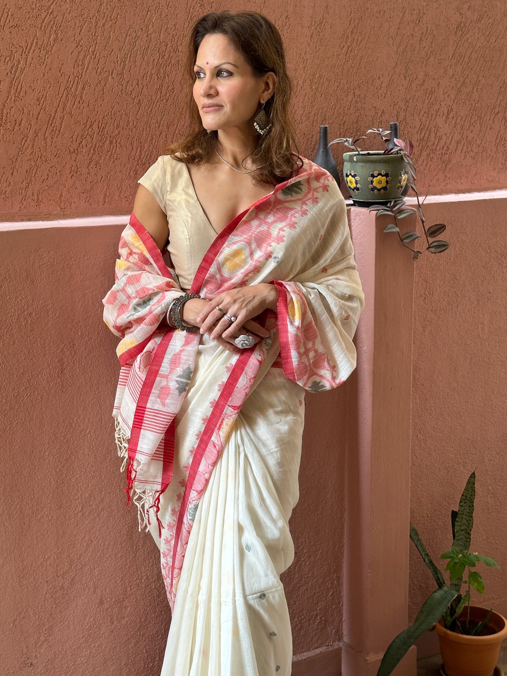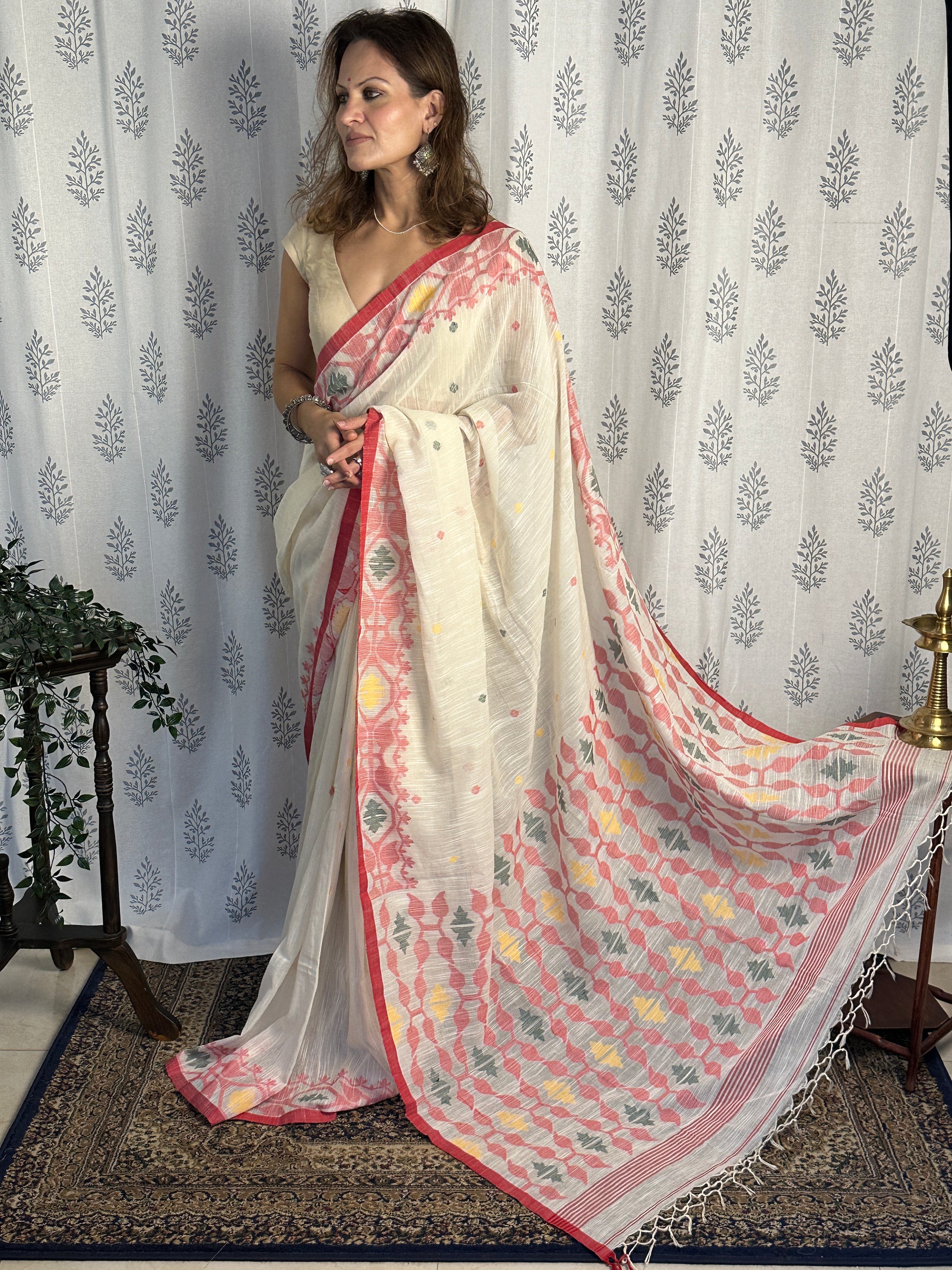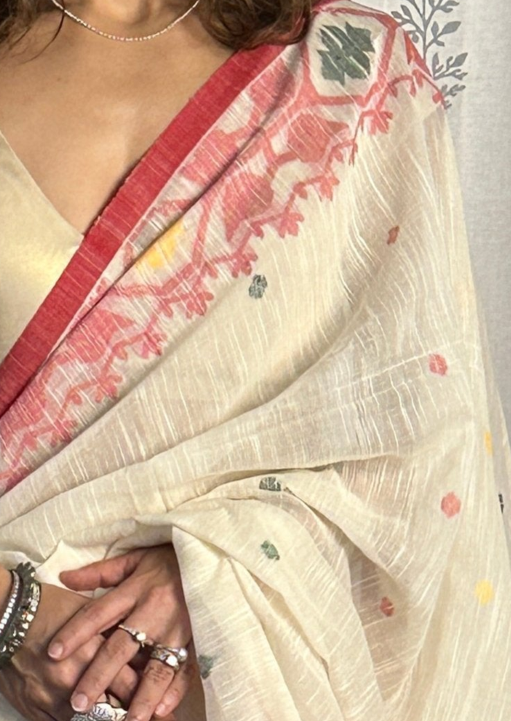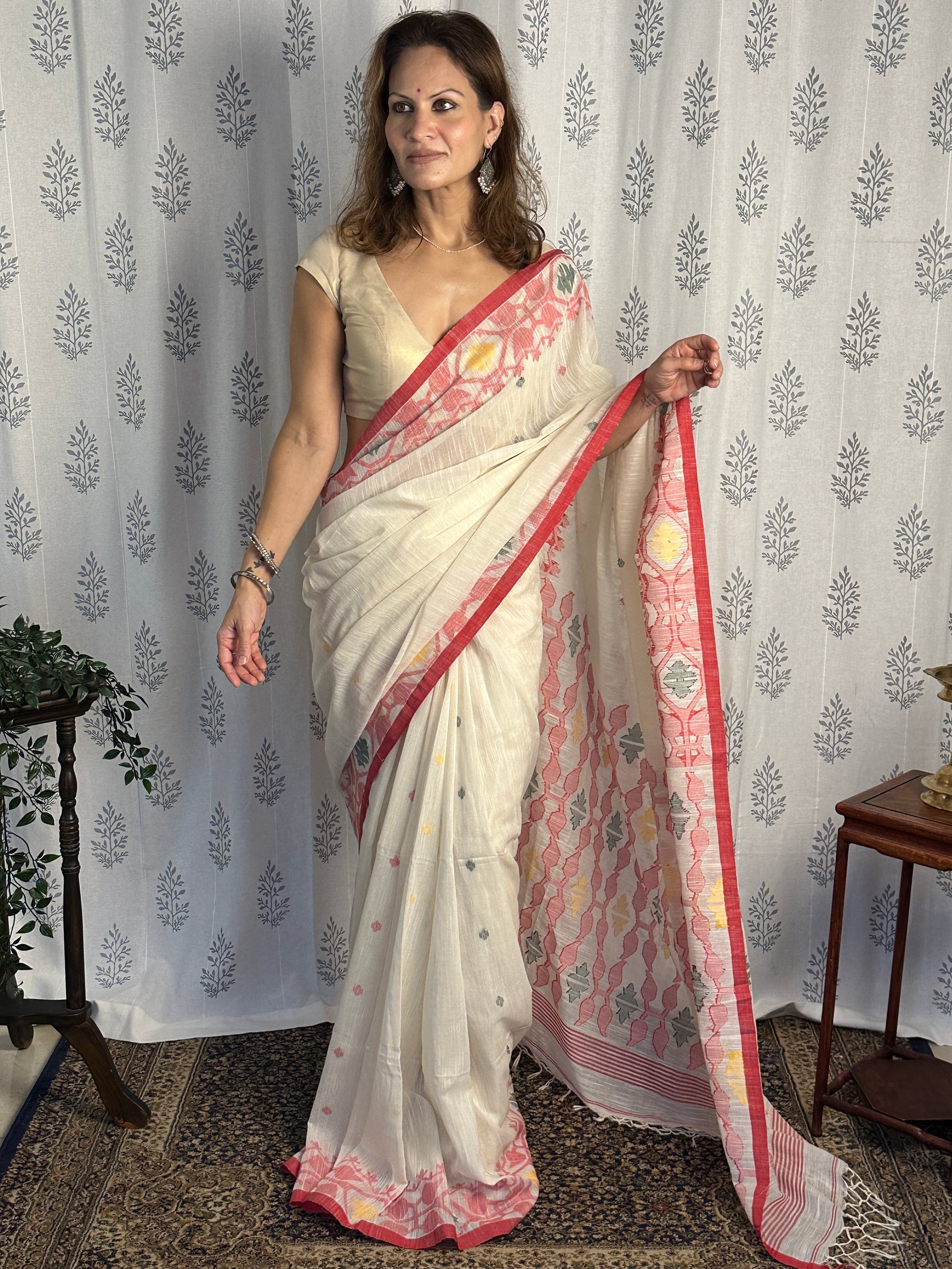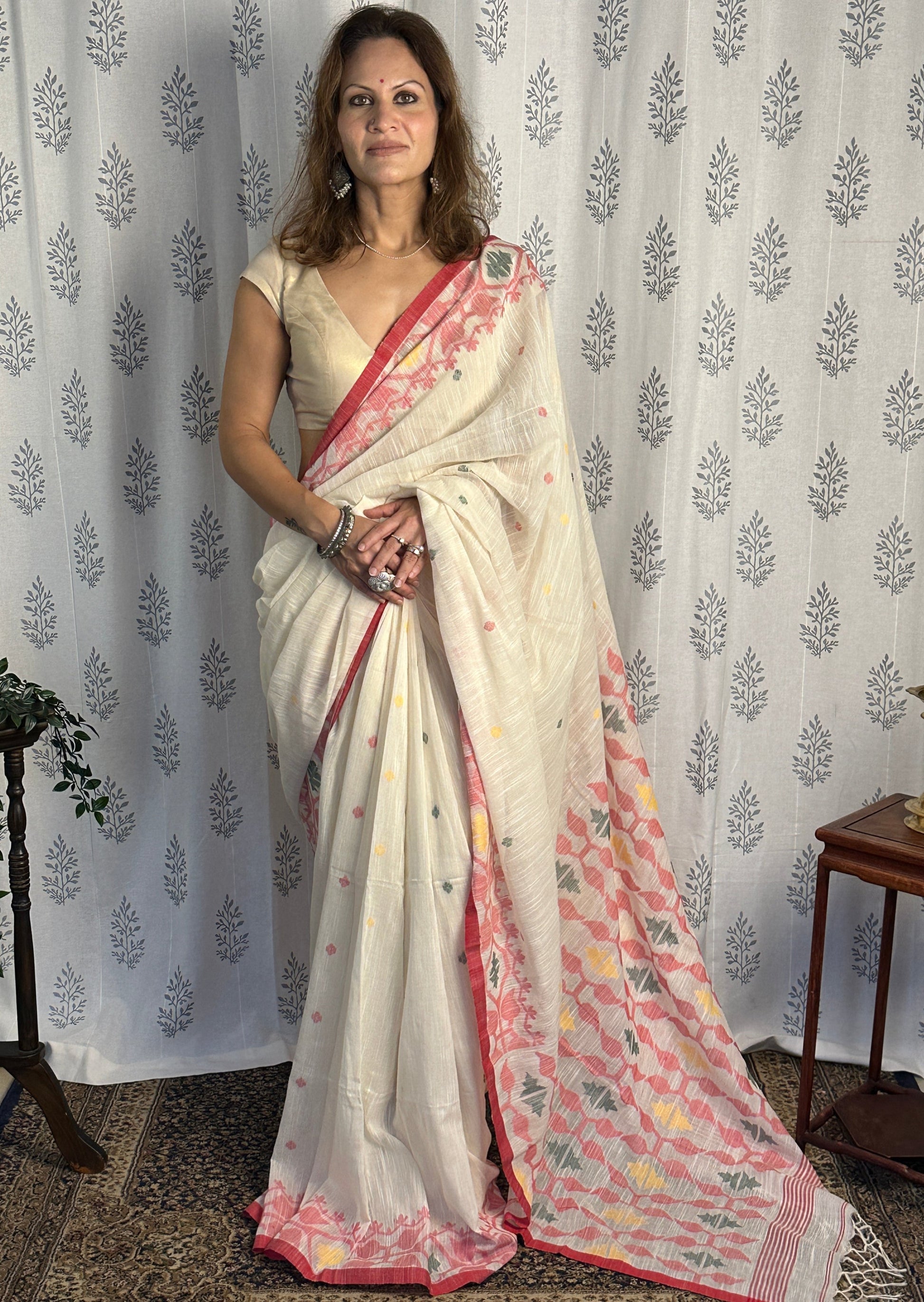 Cream Handloom Pure Khaadi Jamdani Saree with Red Border