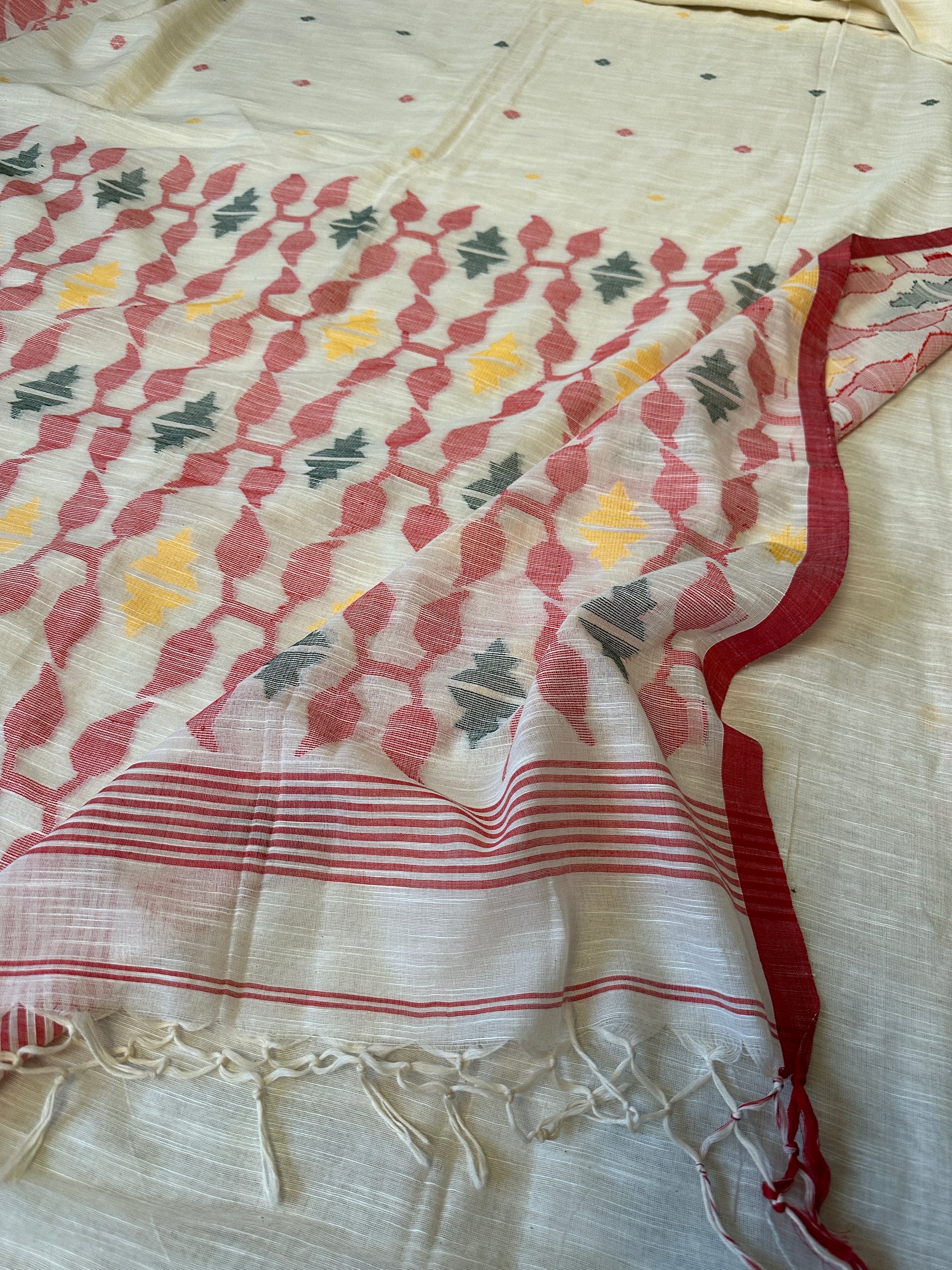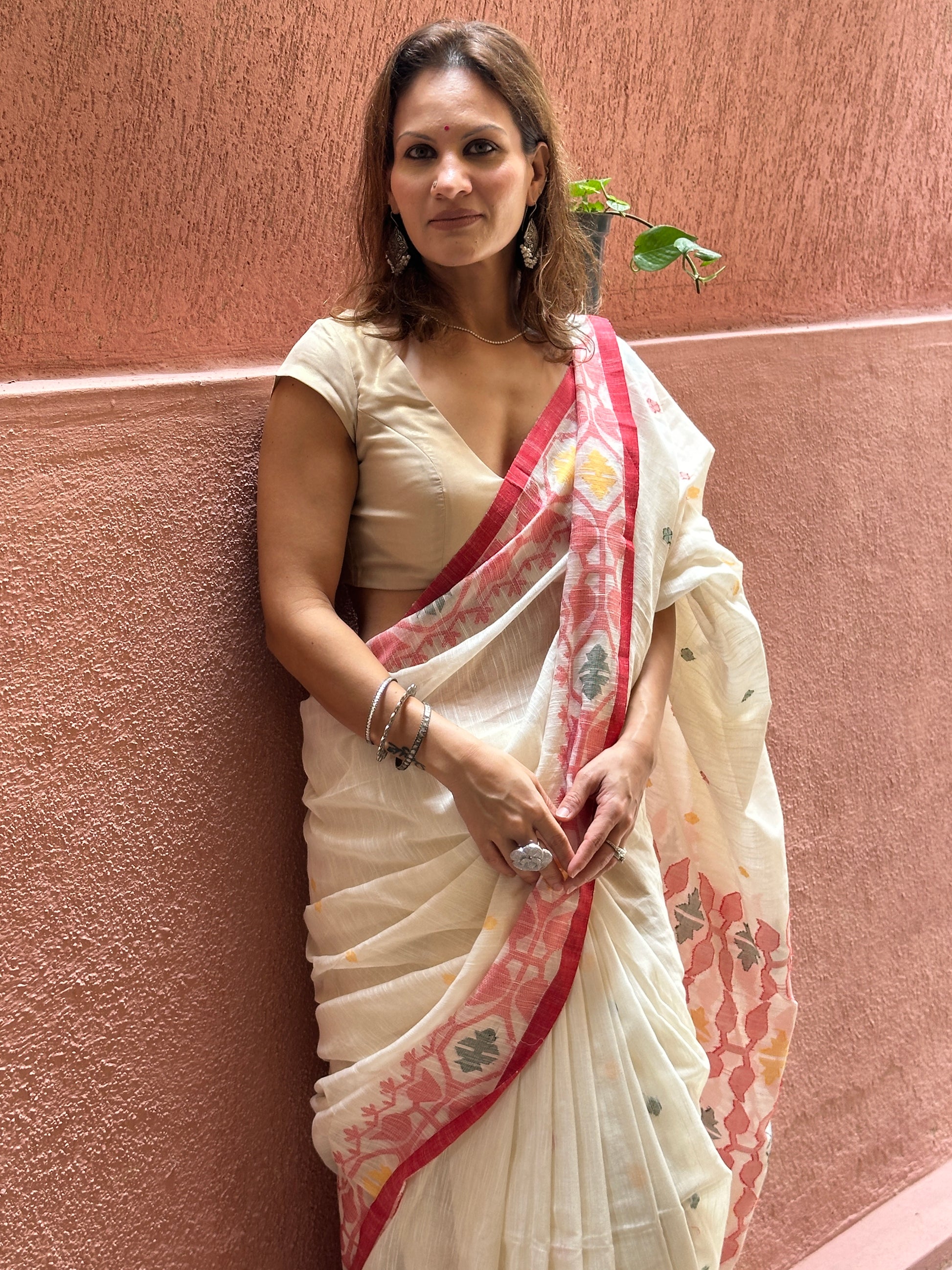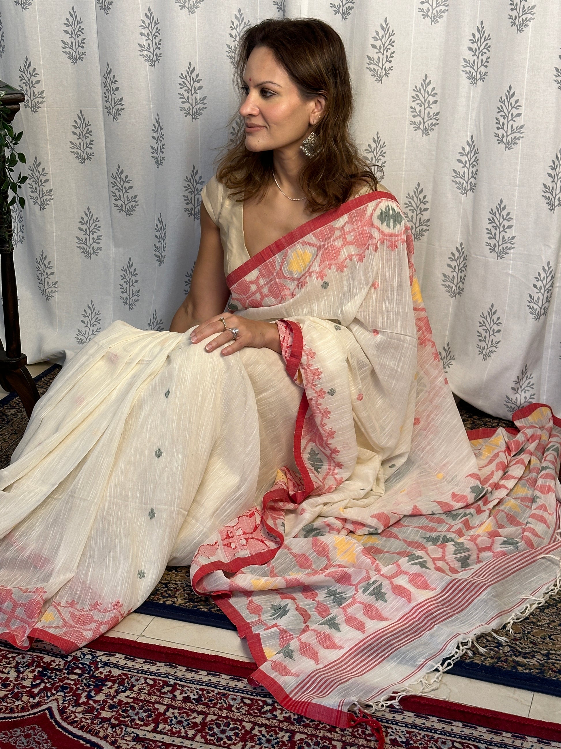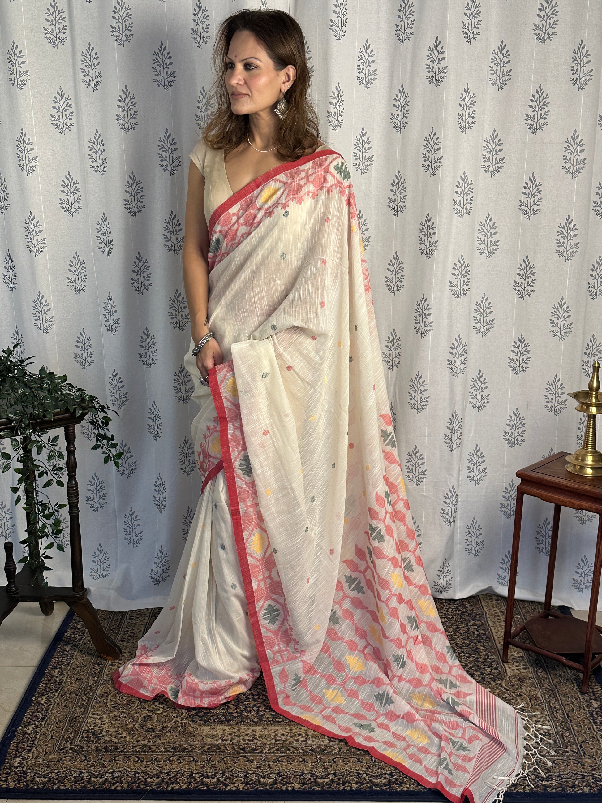 Cream Handloom Pure Khaadi Jamdani Saree with Red Border