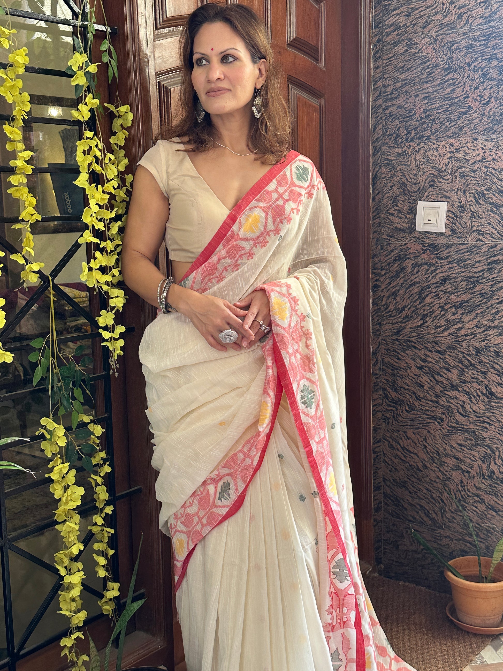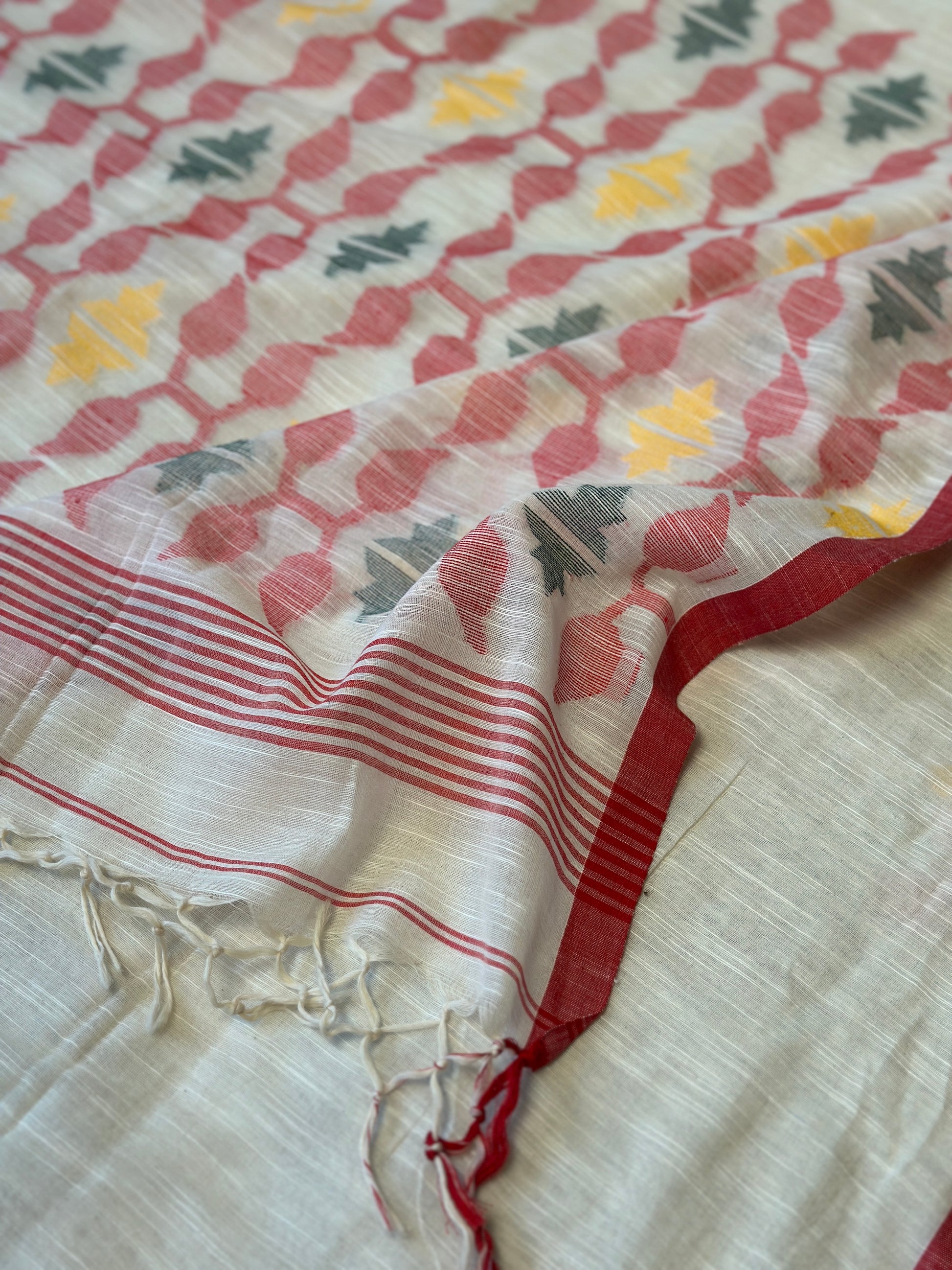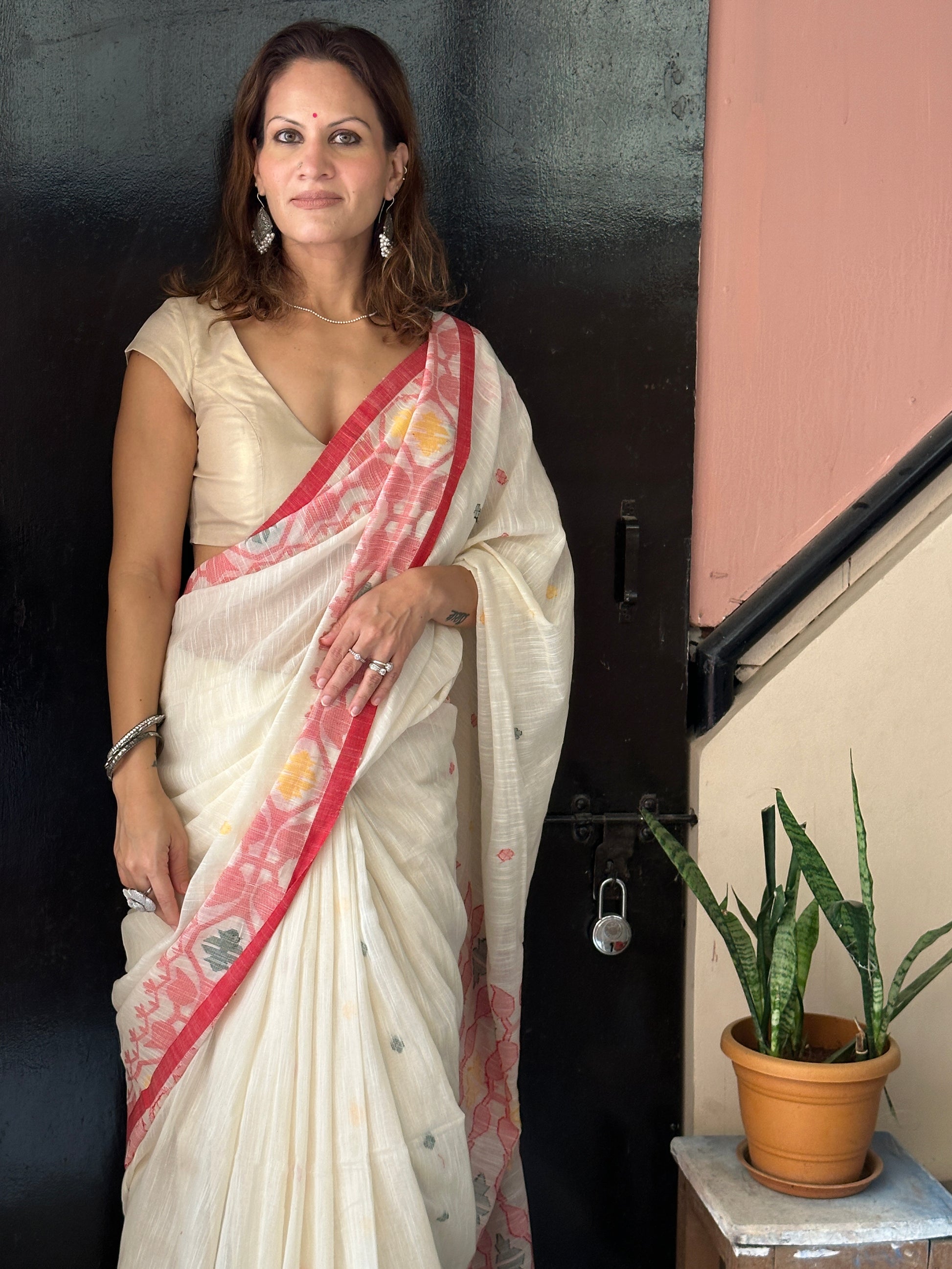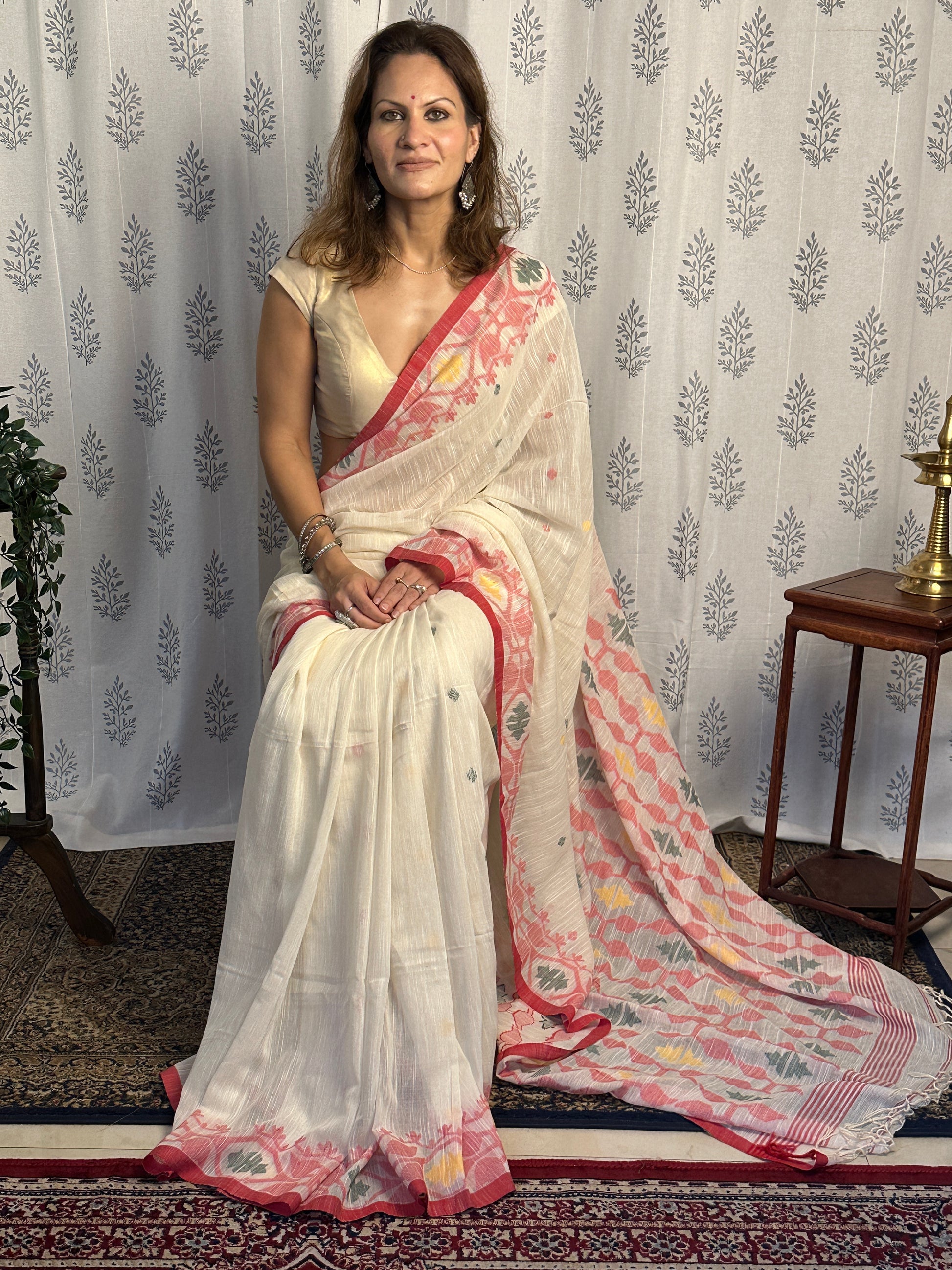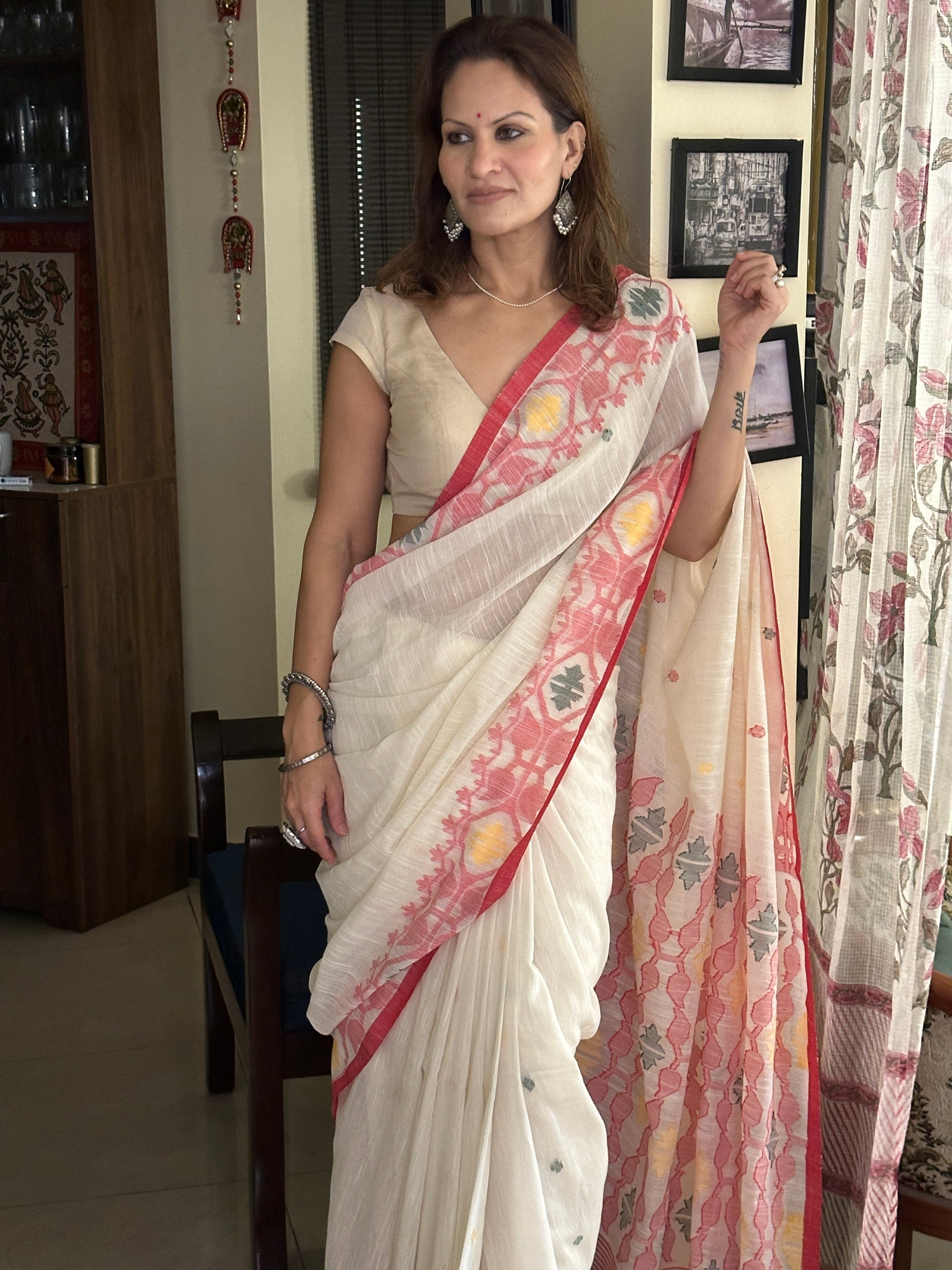 Cream Handloom Pure Khaadi Jamdani Saree with Red Border
