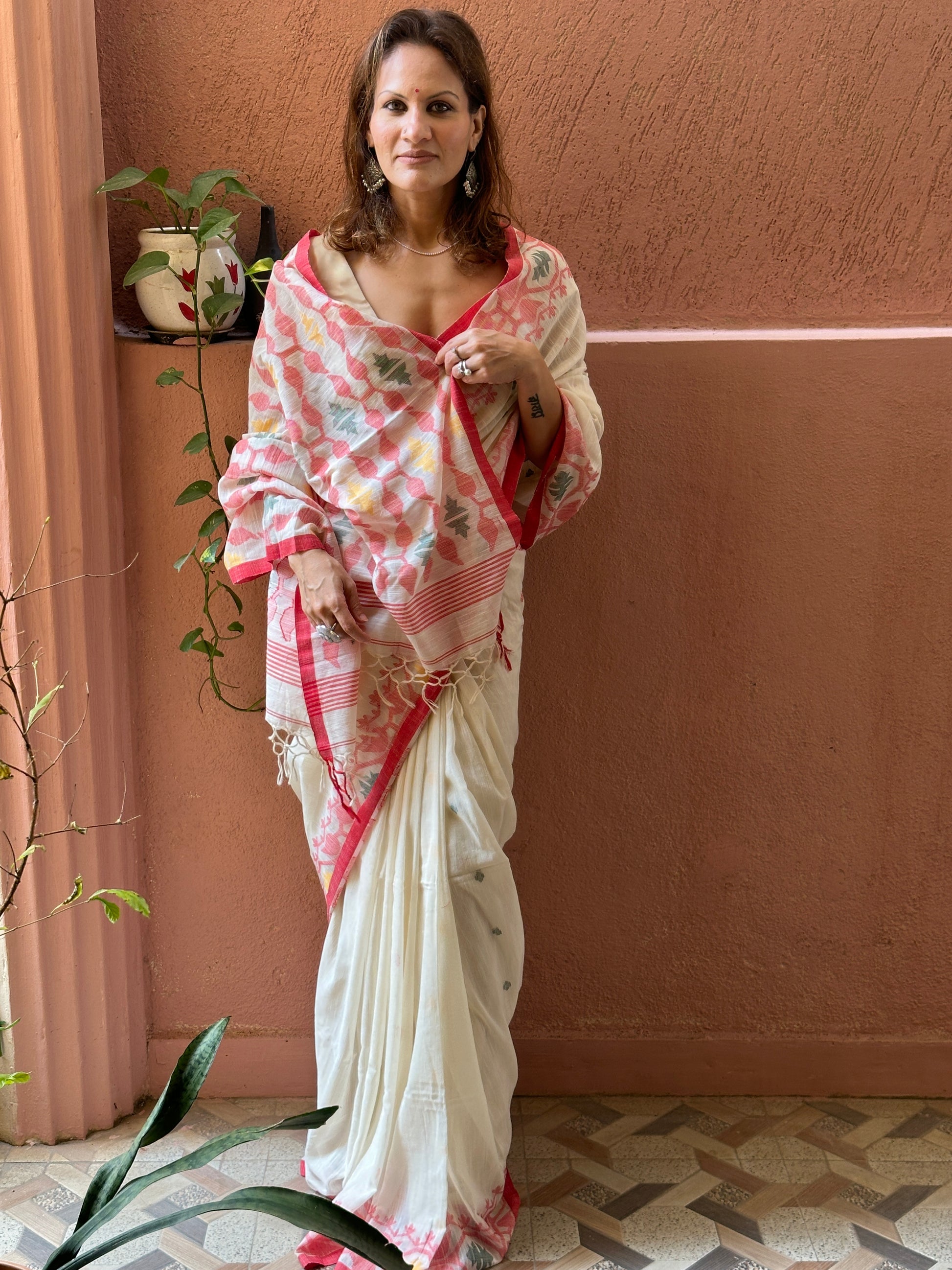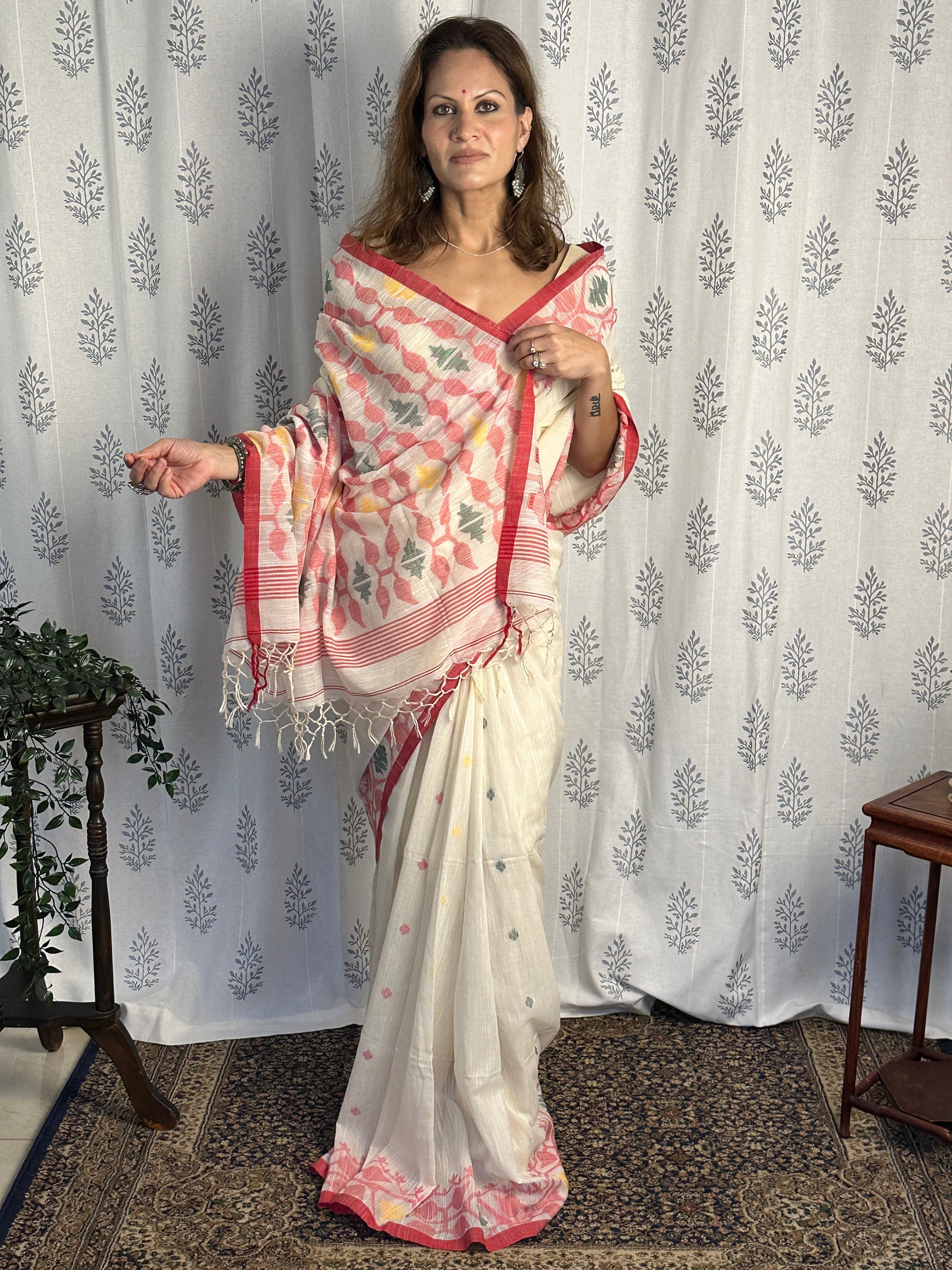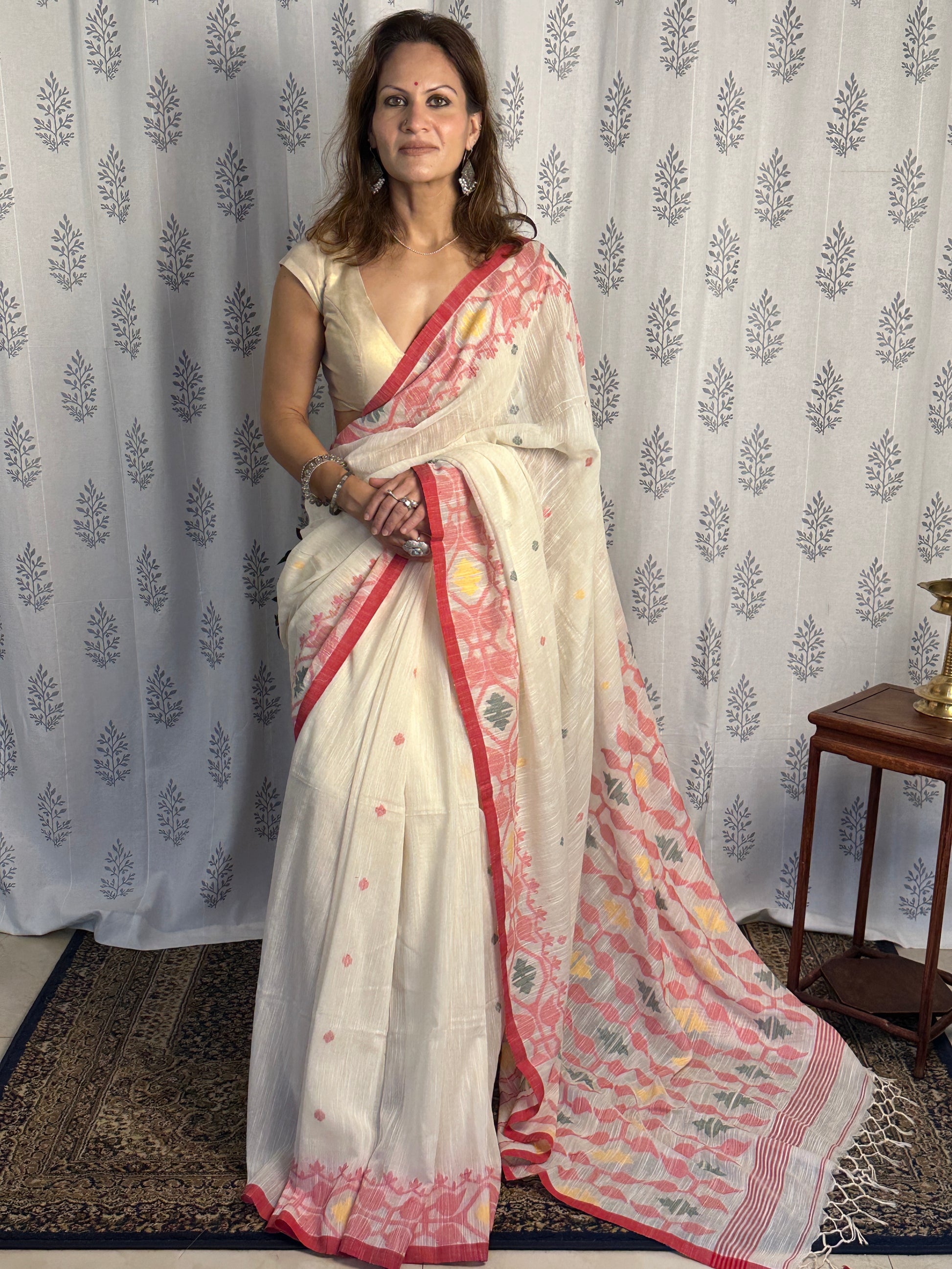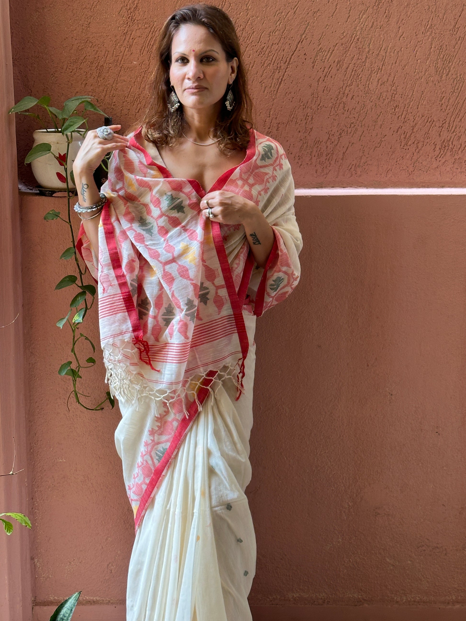 Bask in the grace of this pure khaadi cotton Jamdani sari, with its soft cotton weave featuring small butis all over the body in a stunning white and red colour combination. Revel in the opulence of its fabric, crafted with finesse to envelop you in pure elegance.