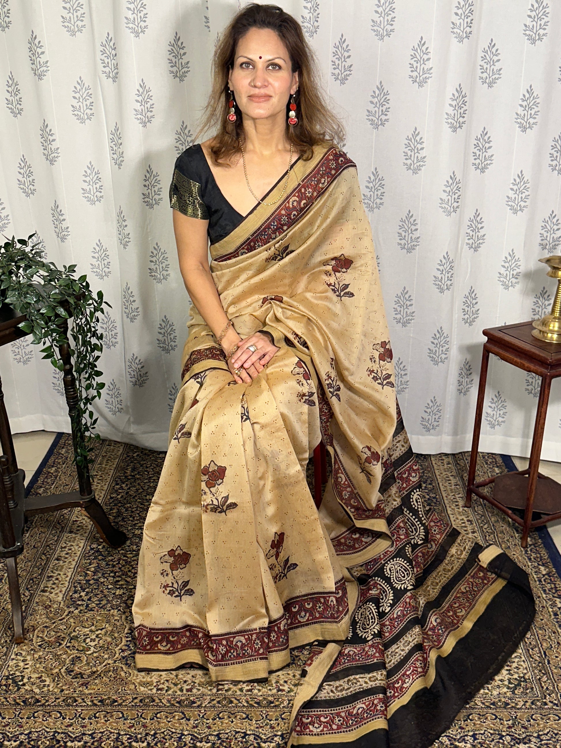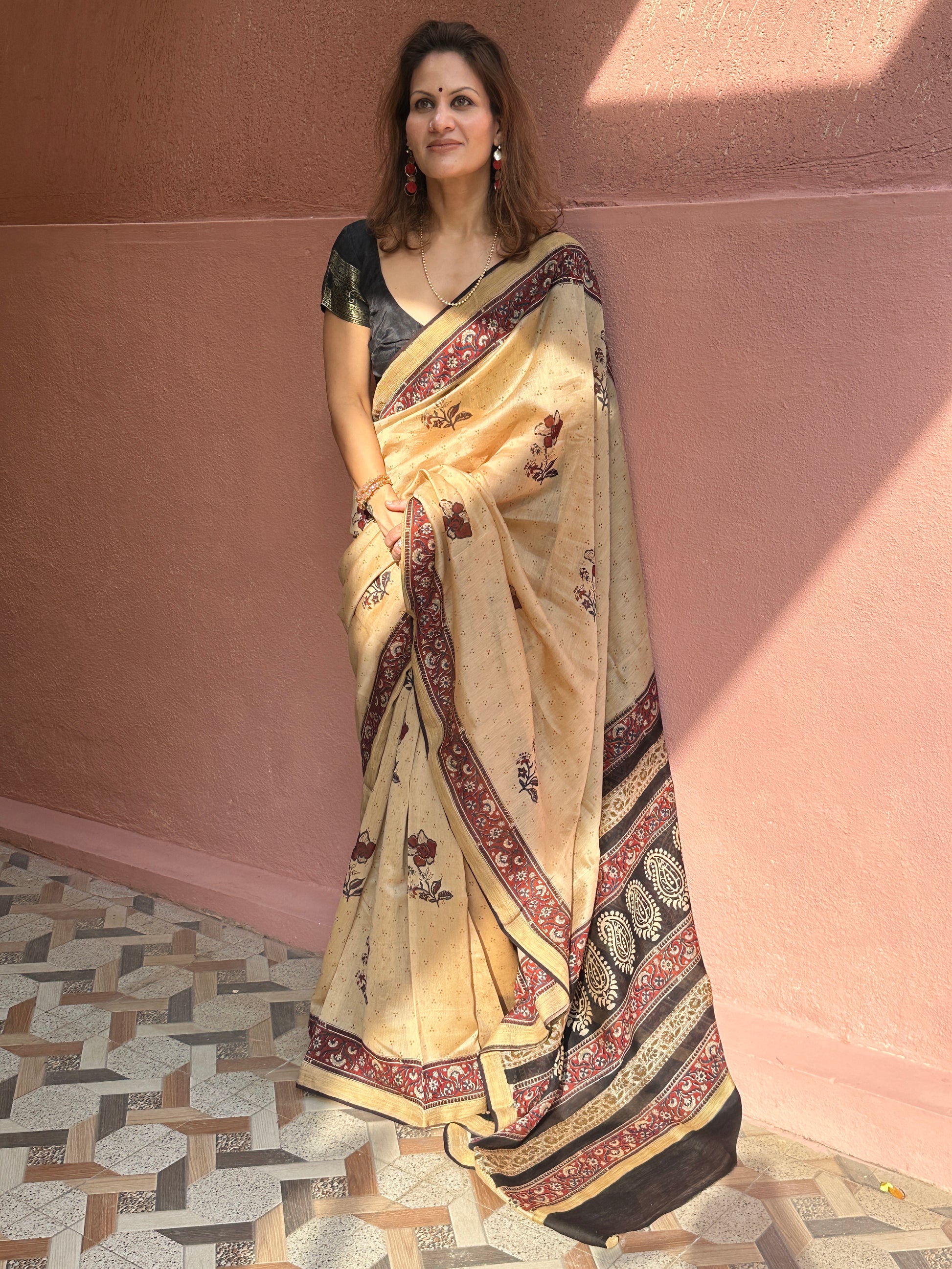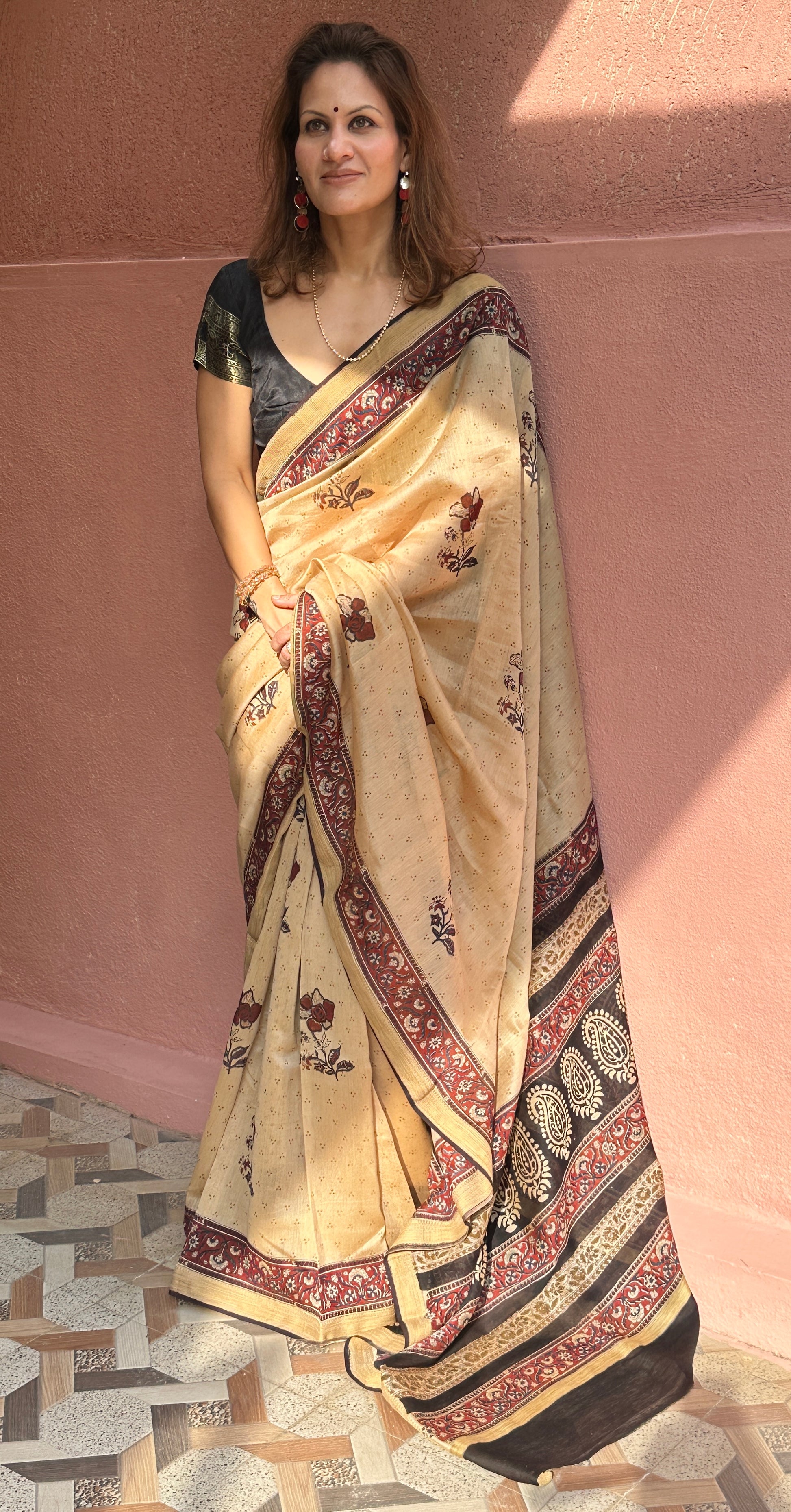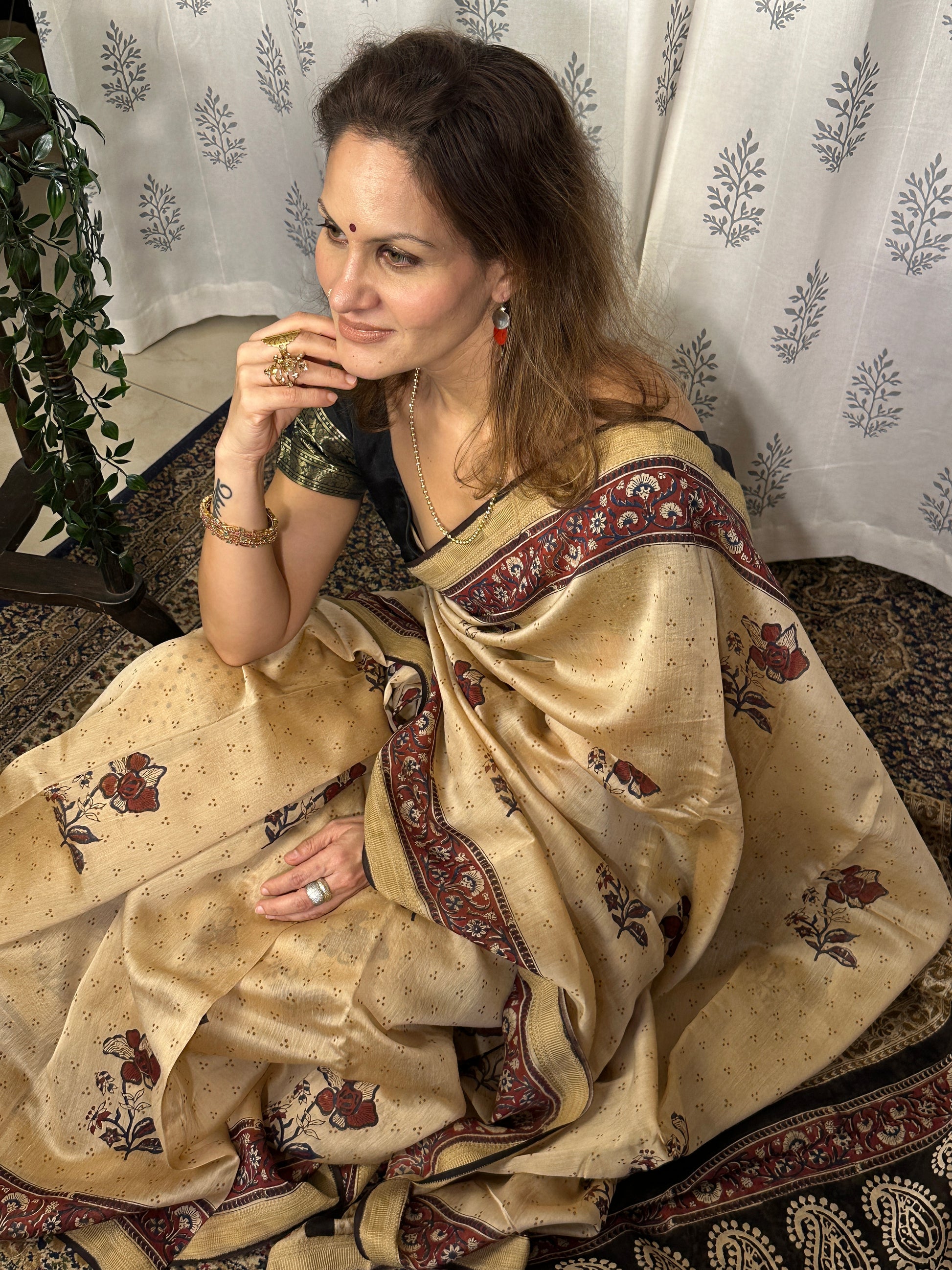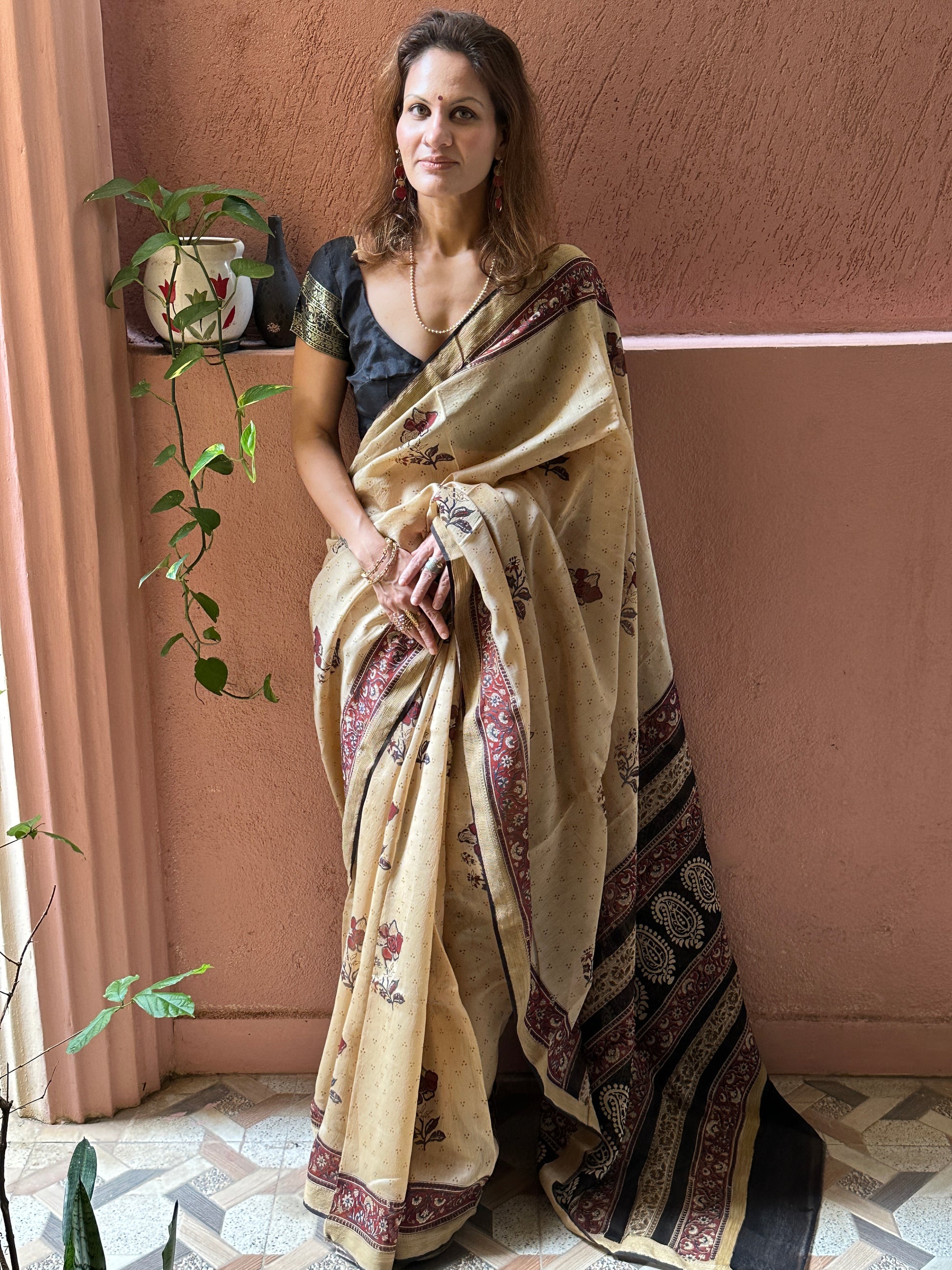 Cream Sanganeri Handblock Print Chanderi Silk Saree
