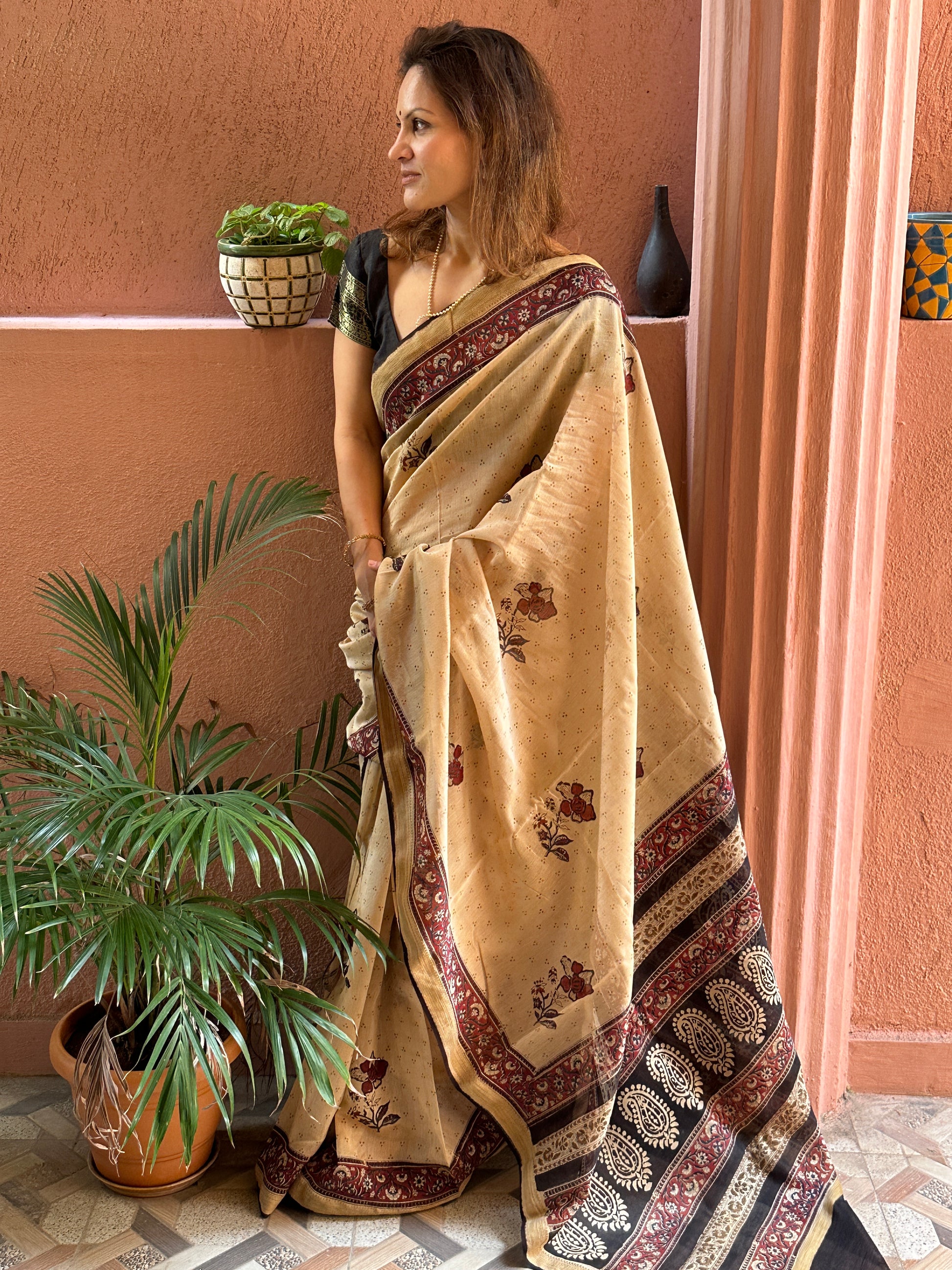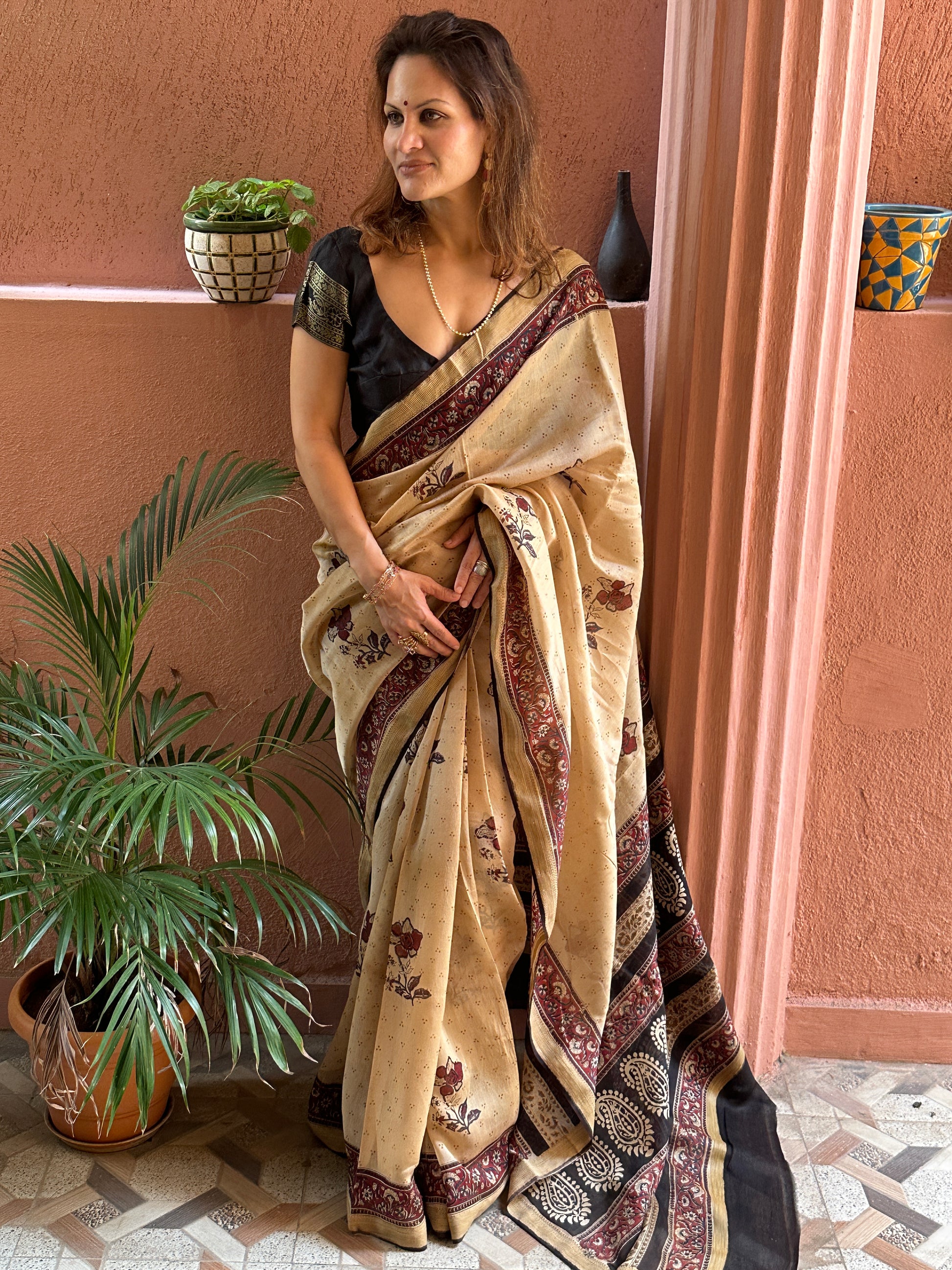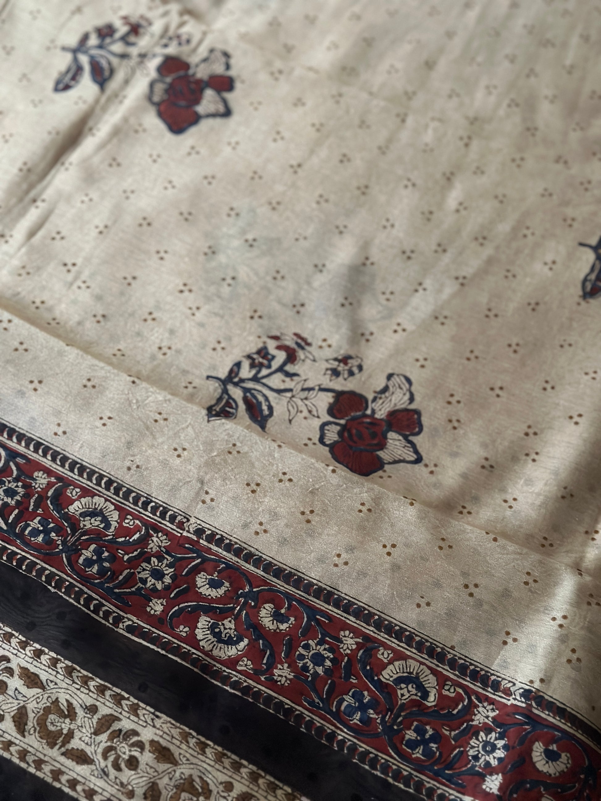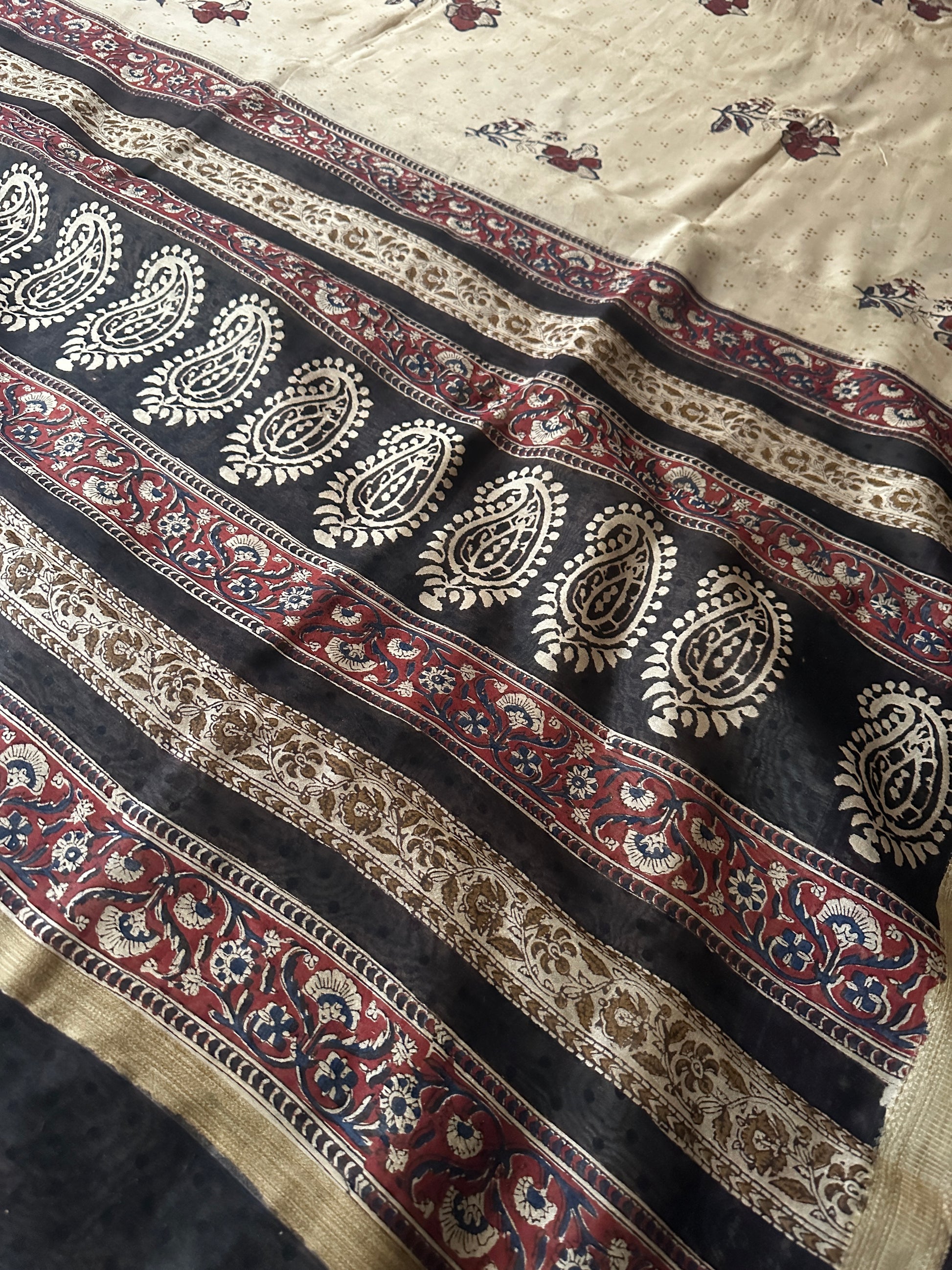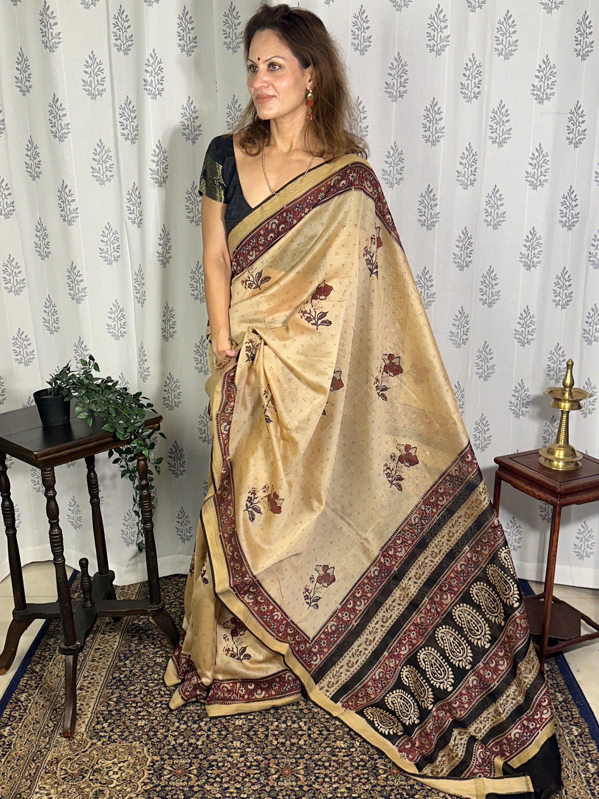Cream Sanganeri Handblock Print Chanderi Silk Saree