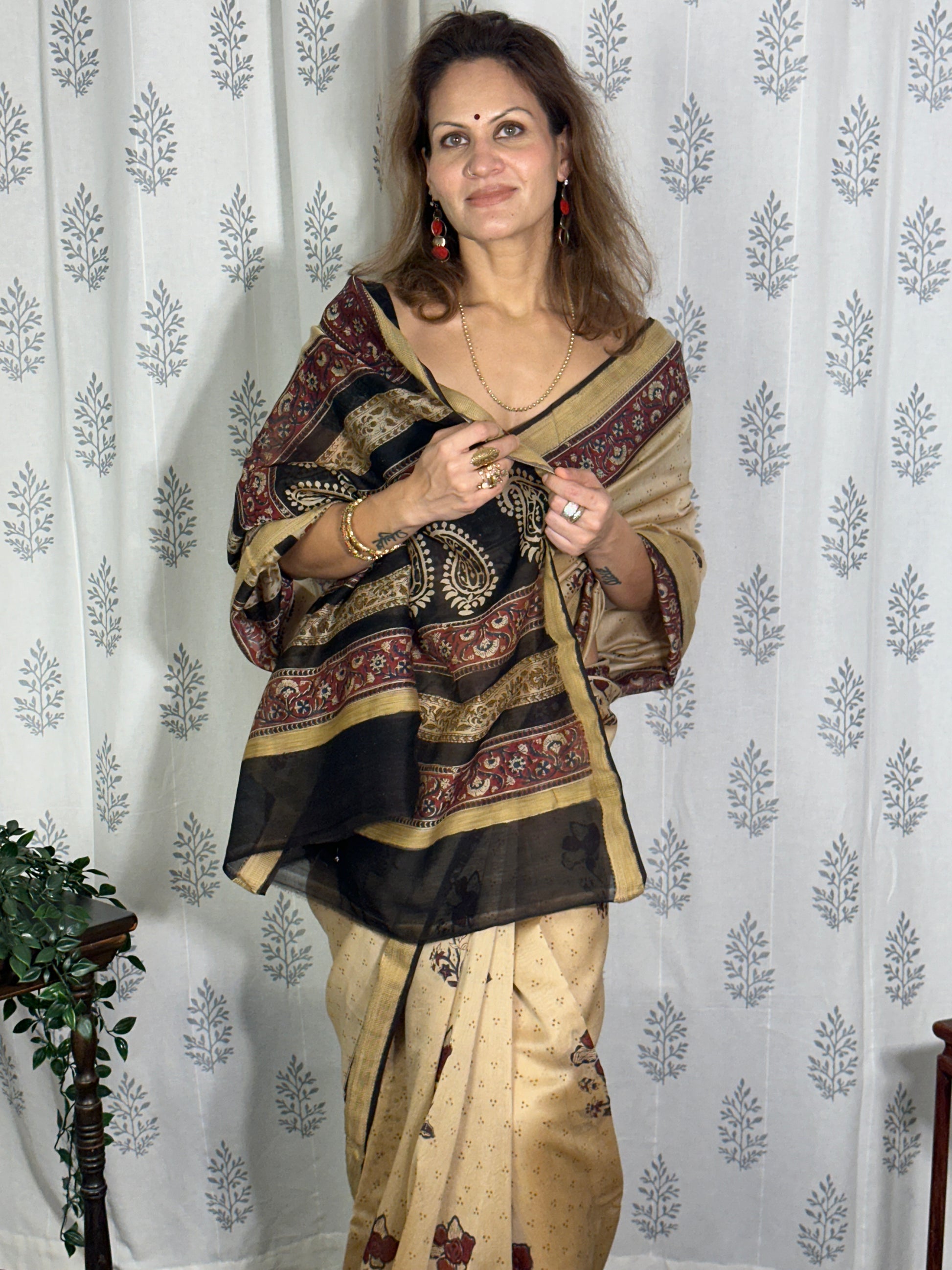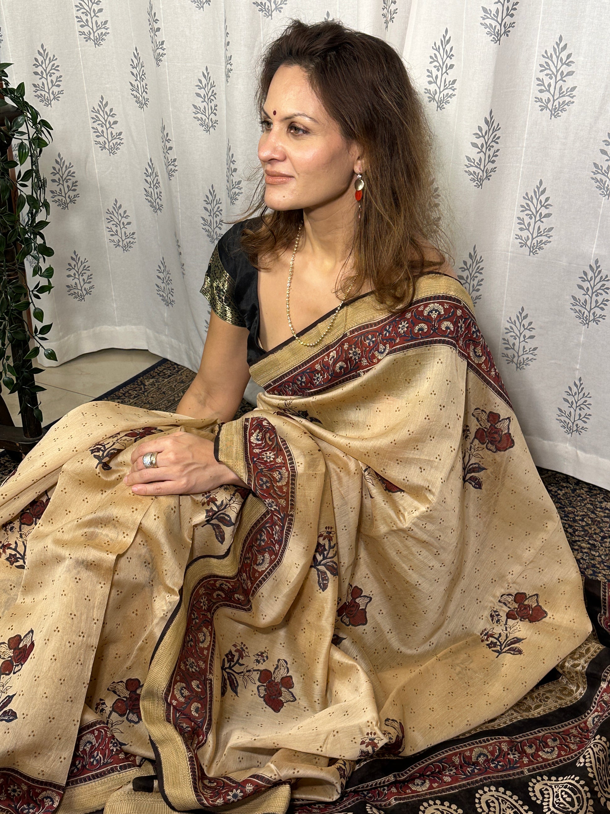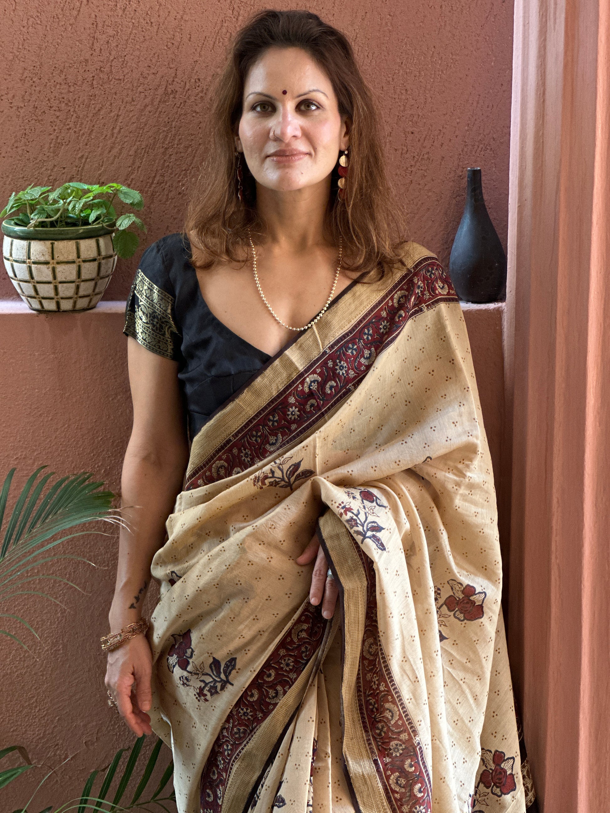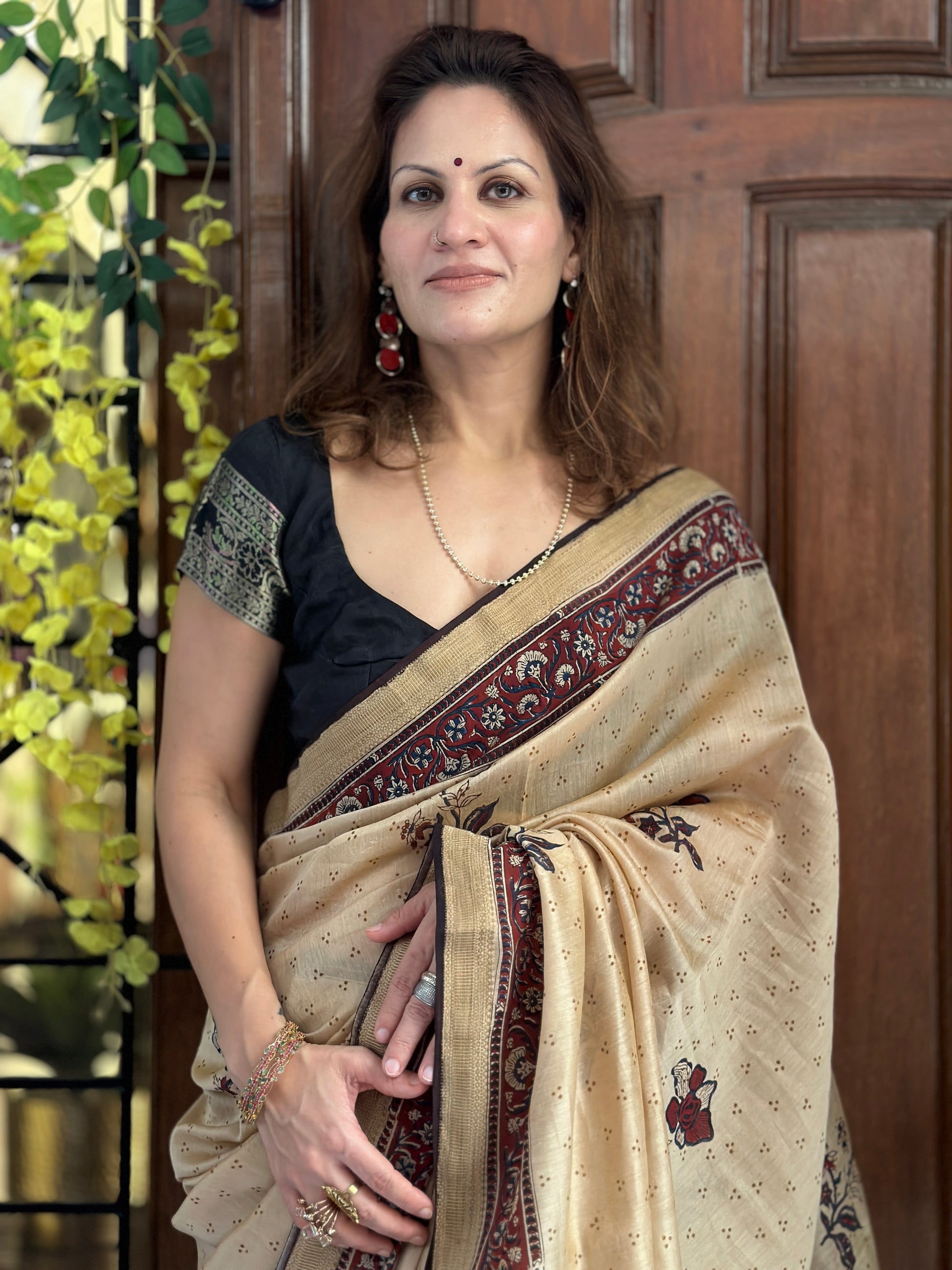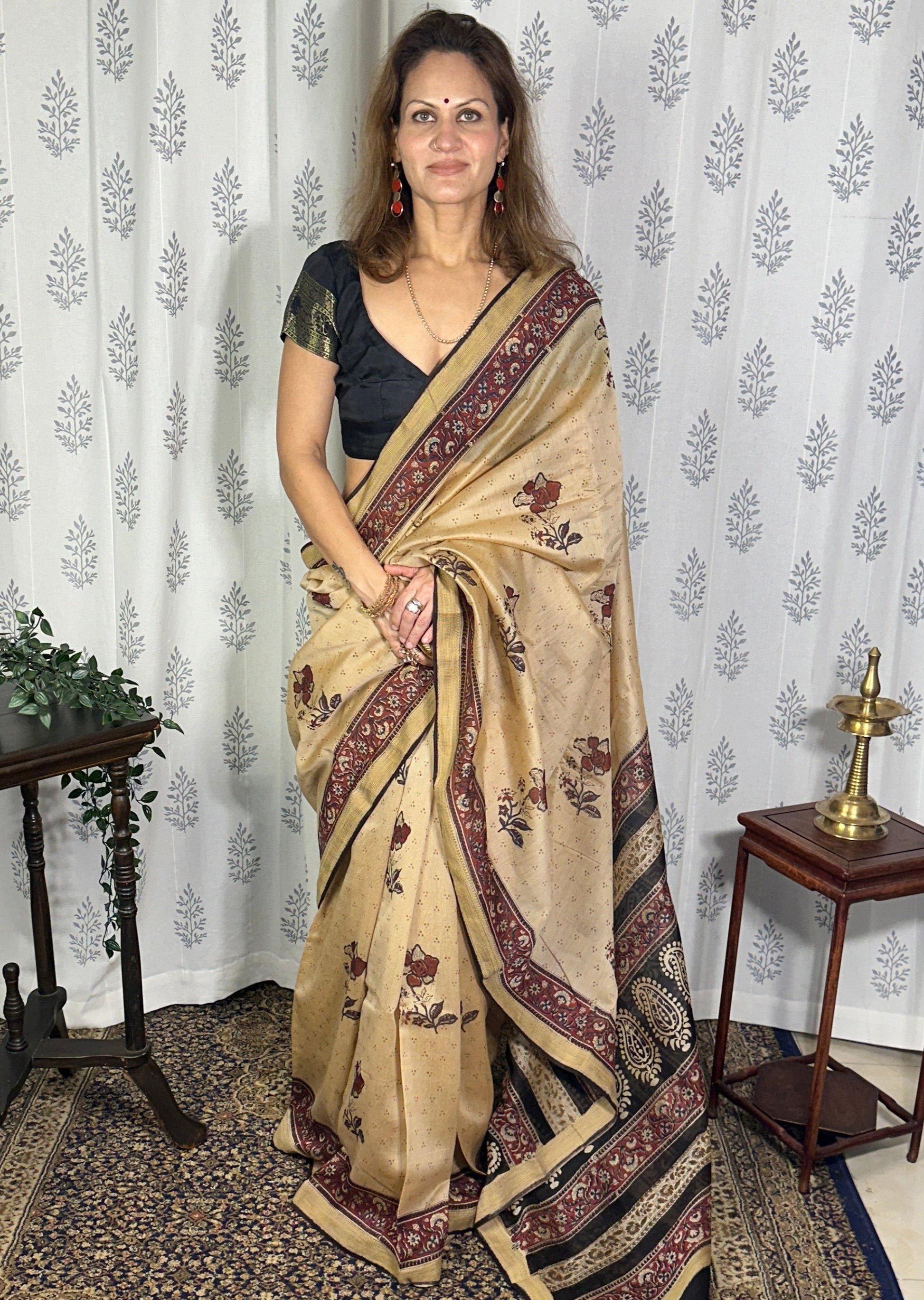 Cream Sanganeri Handblock Print Chanderi Silk Saree