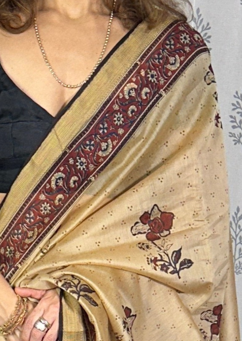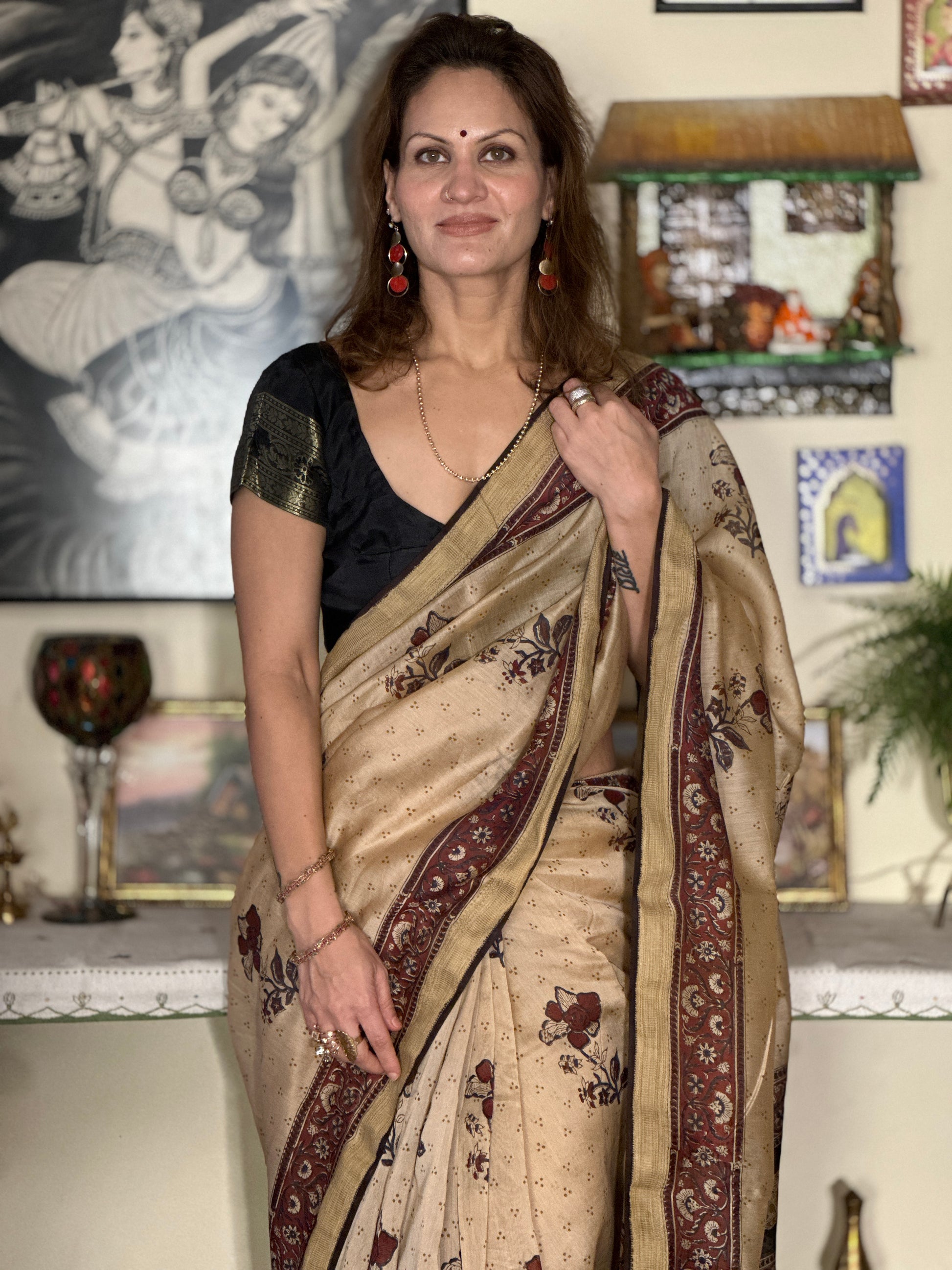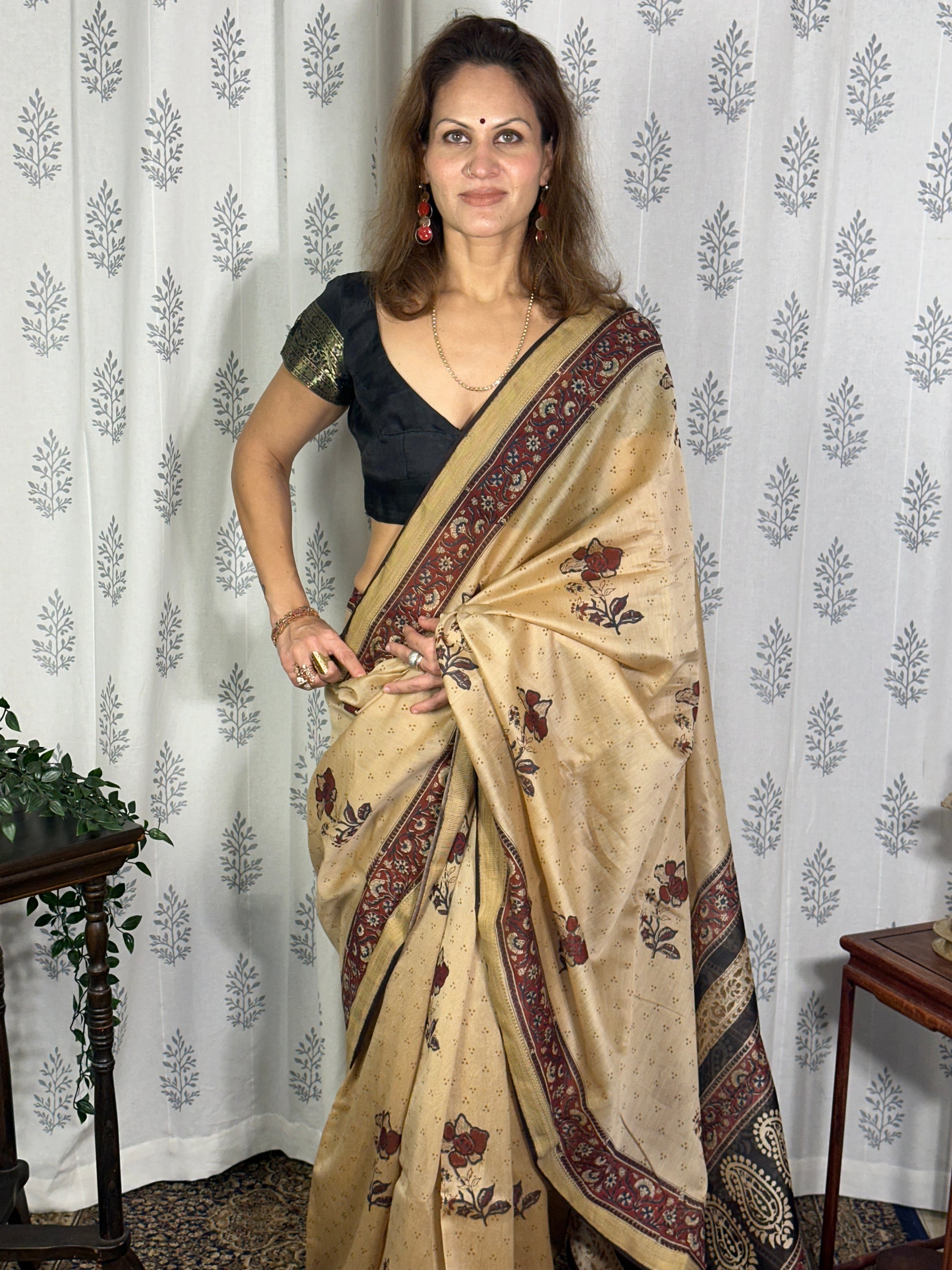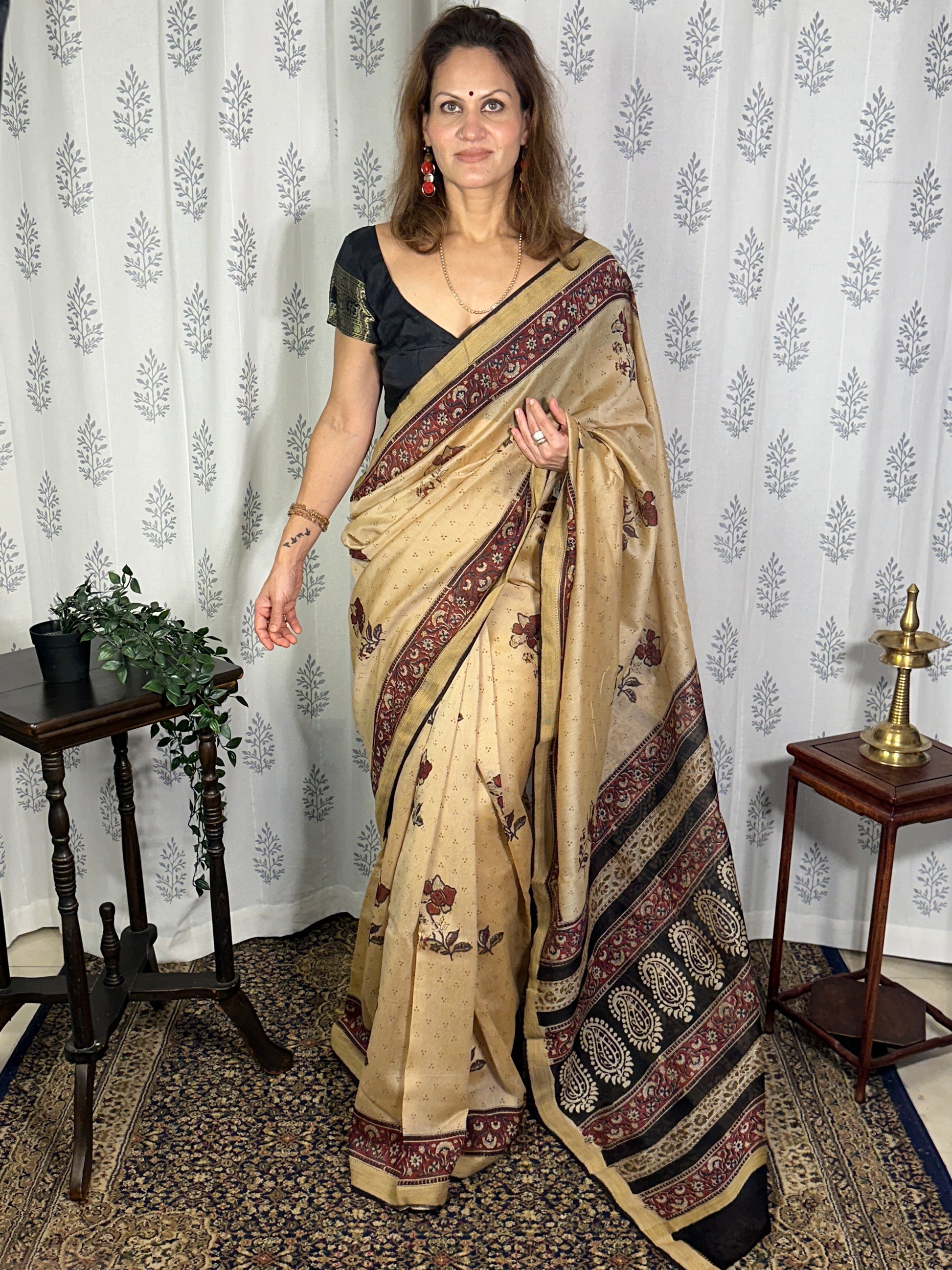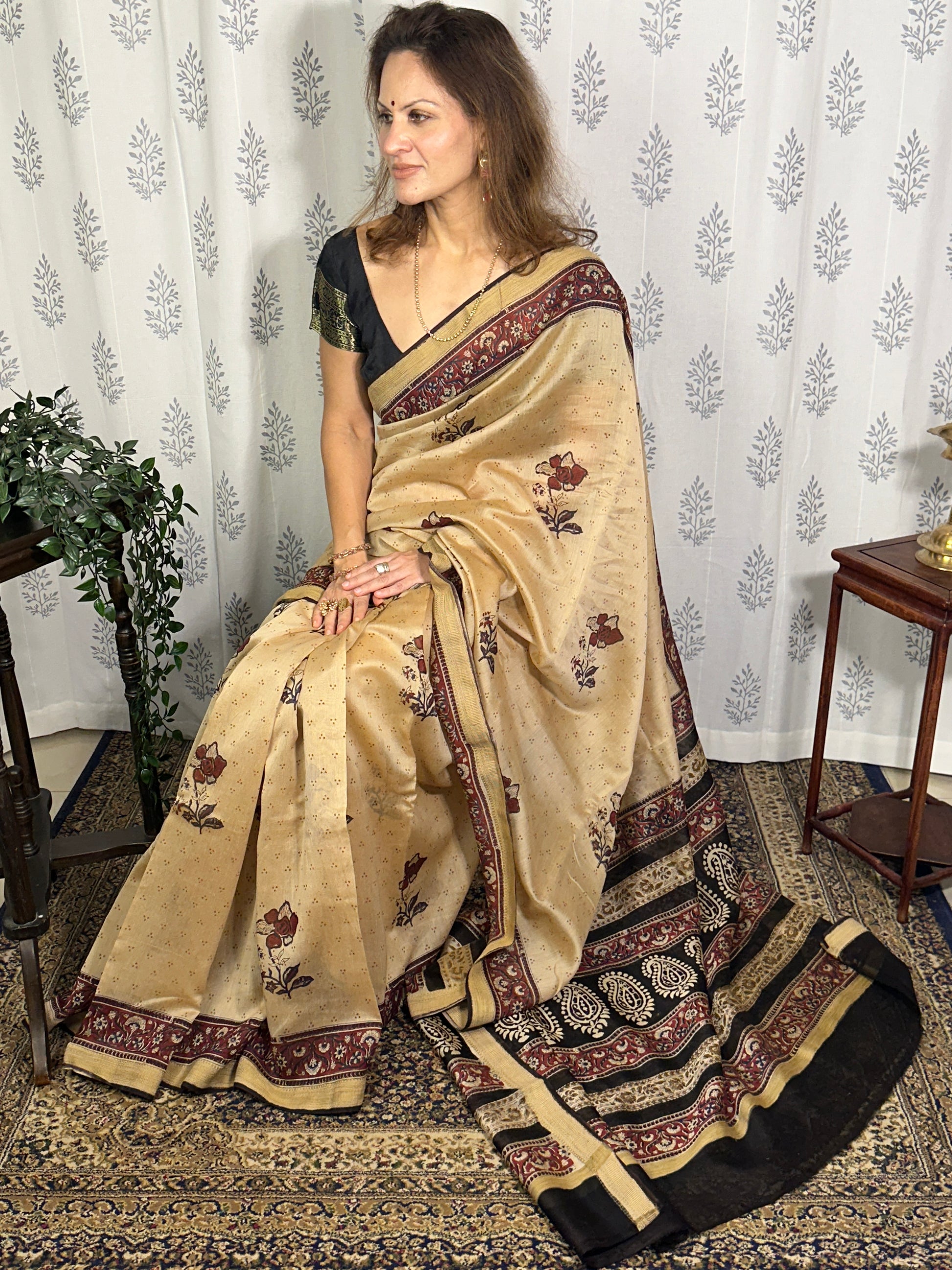 Cream Sanganeri Handblock Print Chanderi Silk Saree