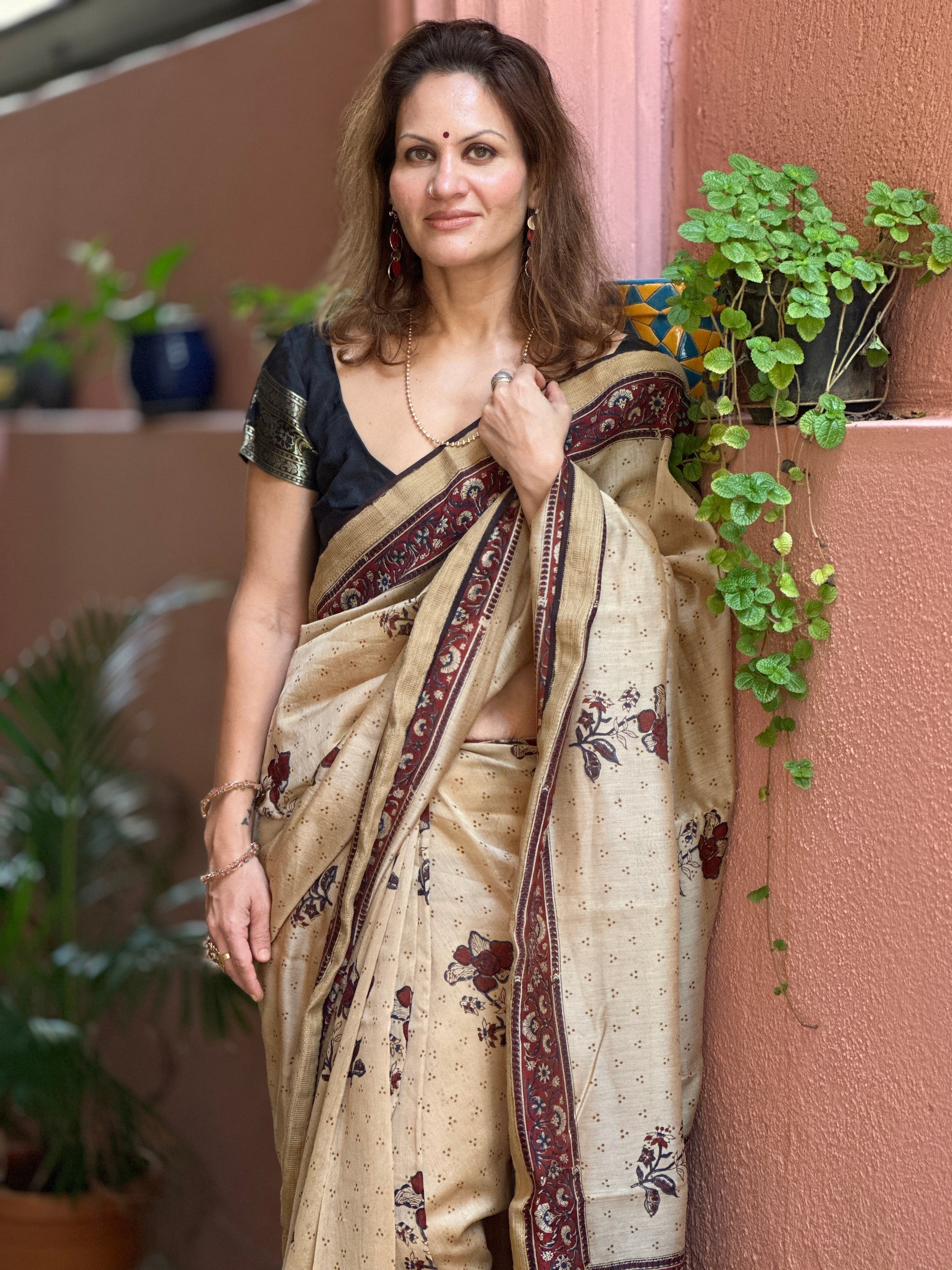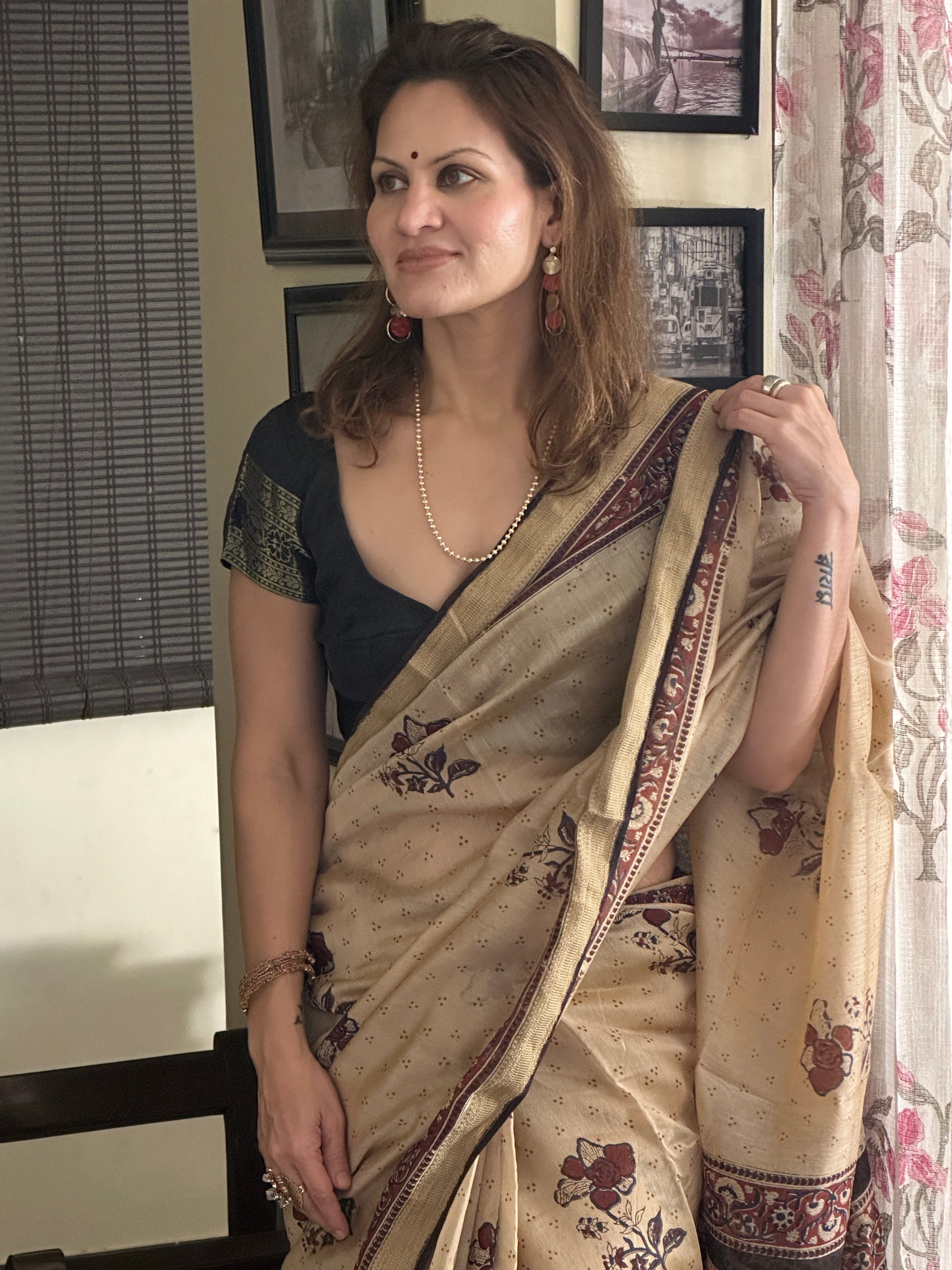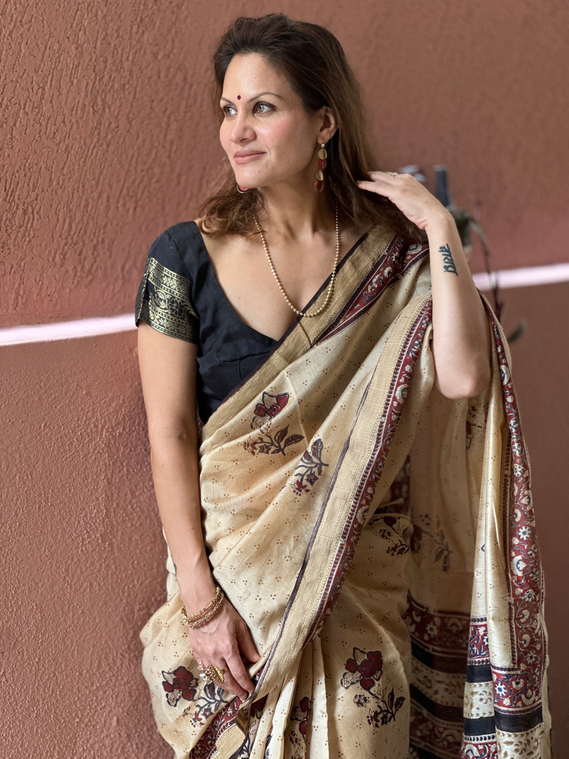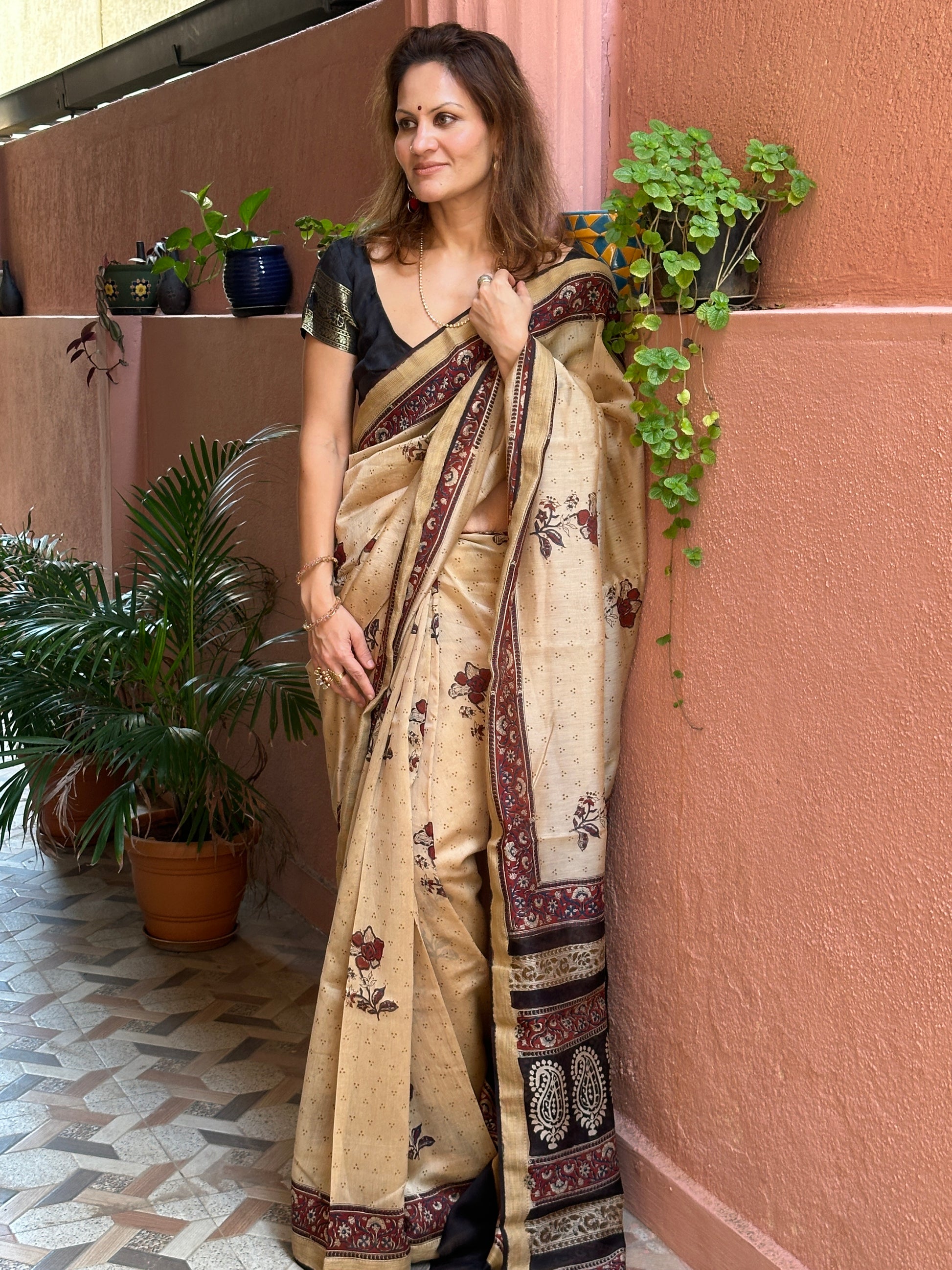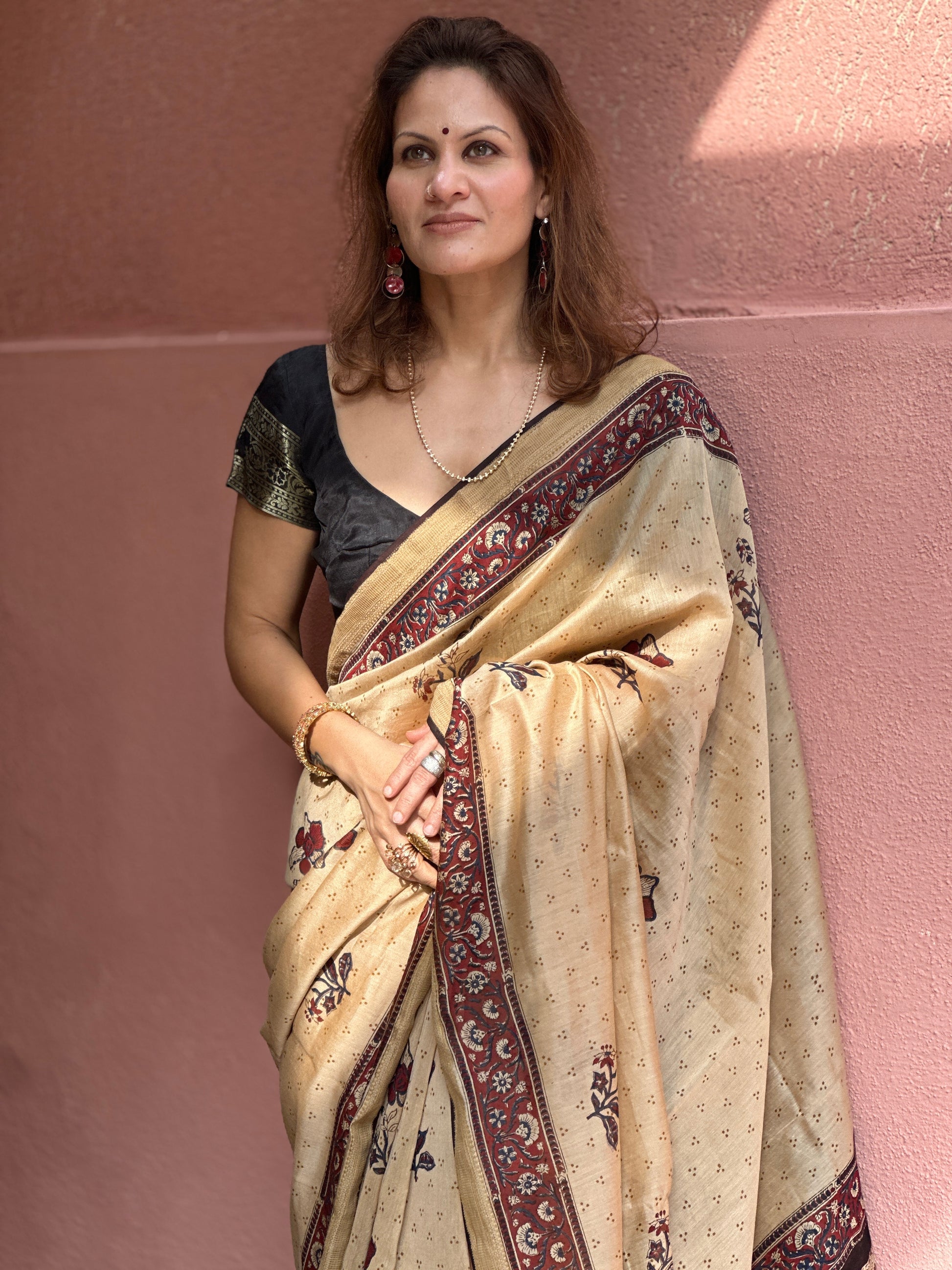 Cream Sanganeri Handblock Print Chanderi Silk Saree