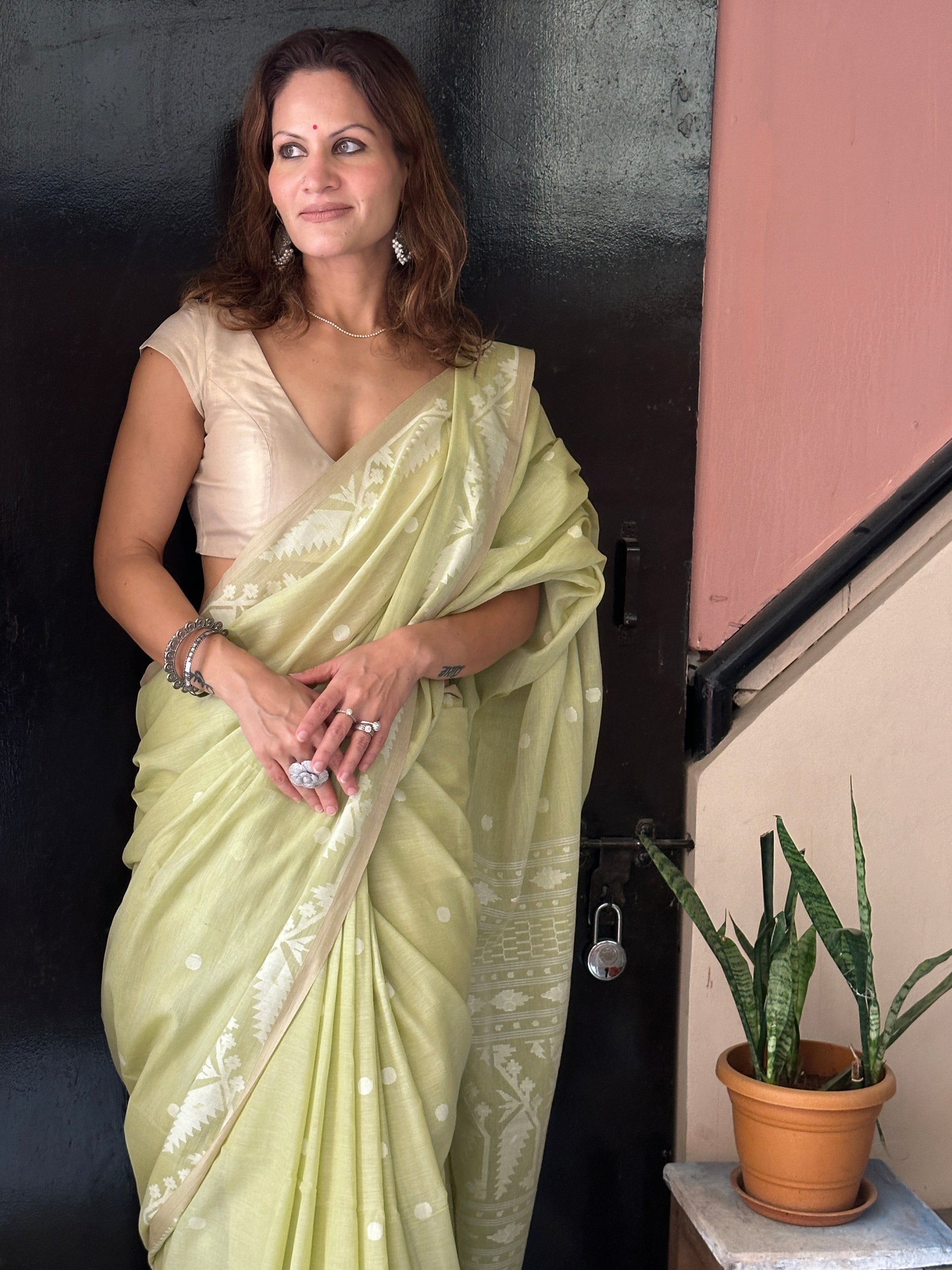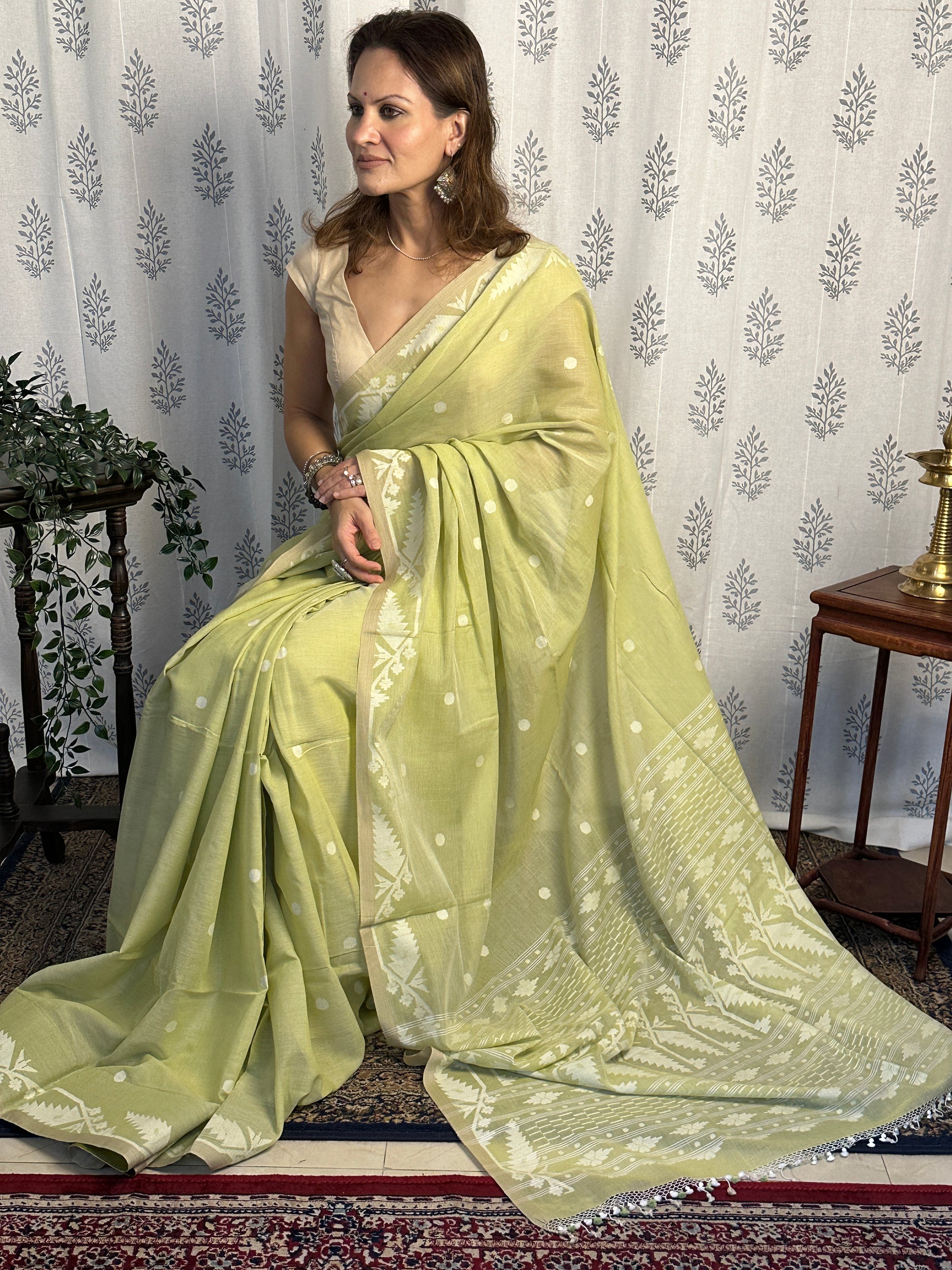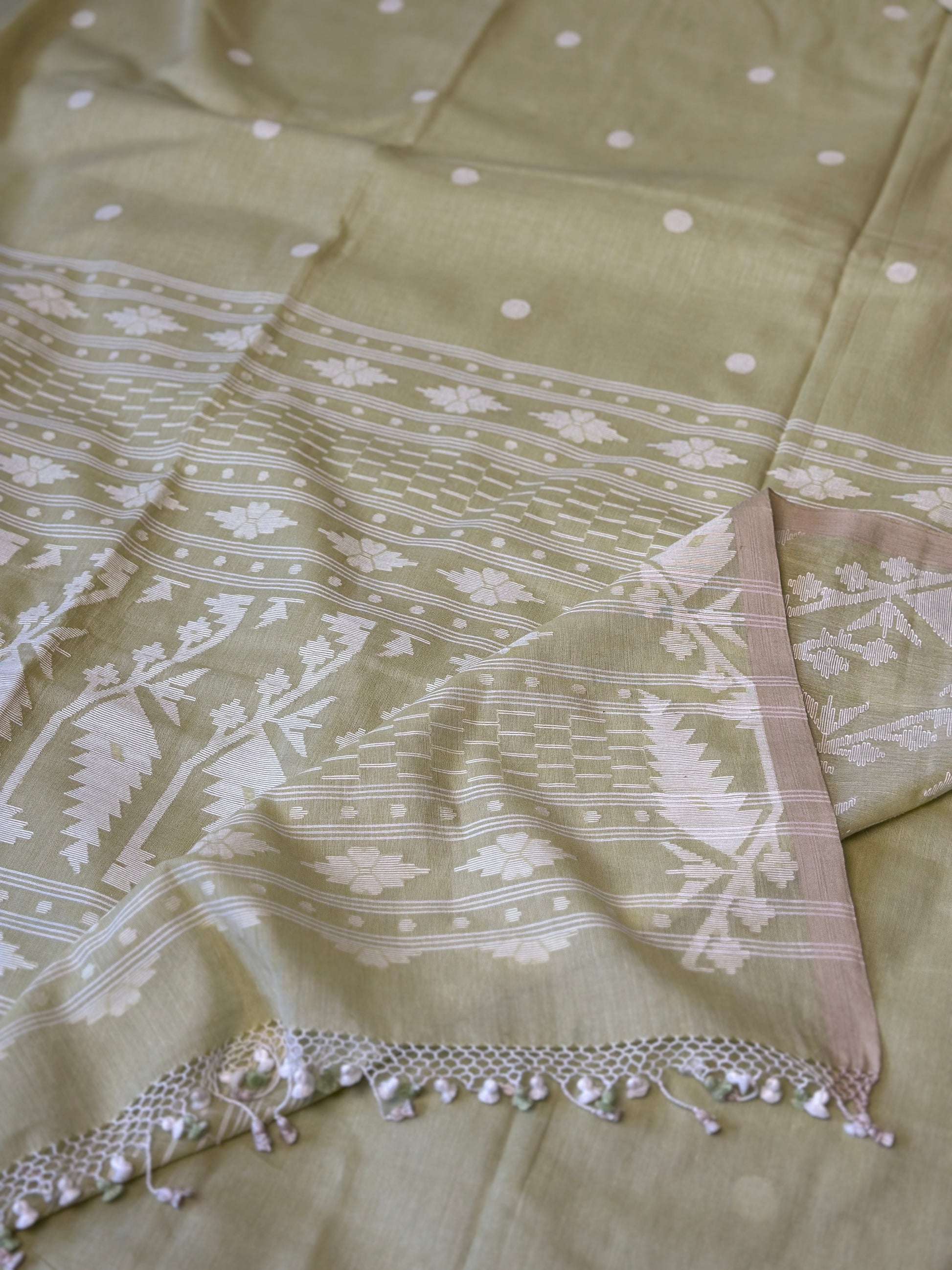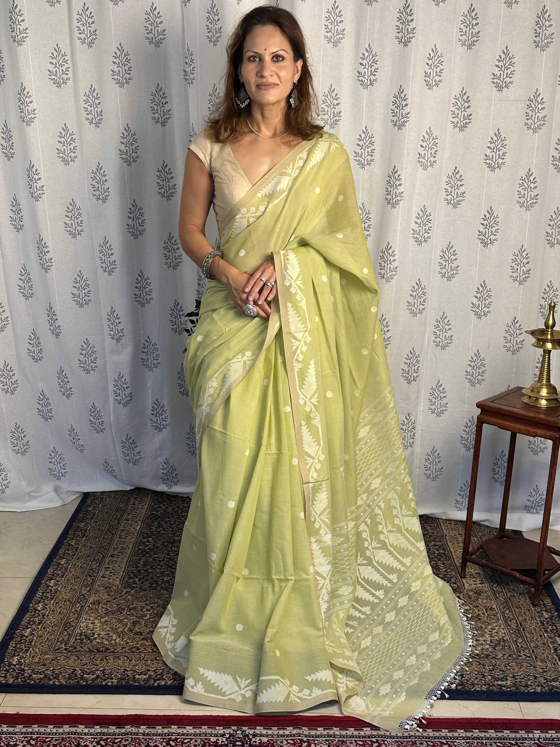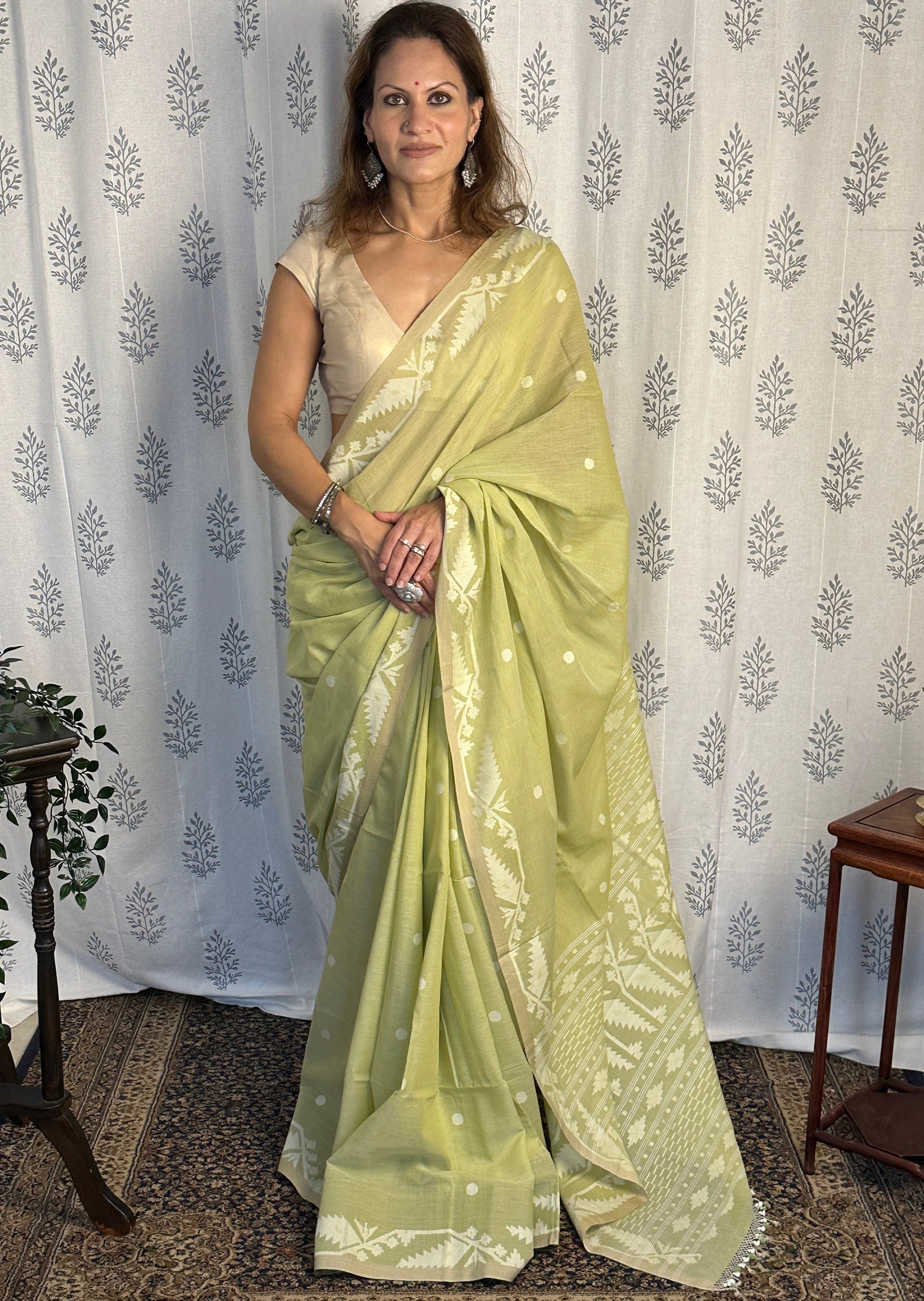 Green Hand Spun and Handwoven Pure Khaadi Sari with Intricate Needle Work Jamdani