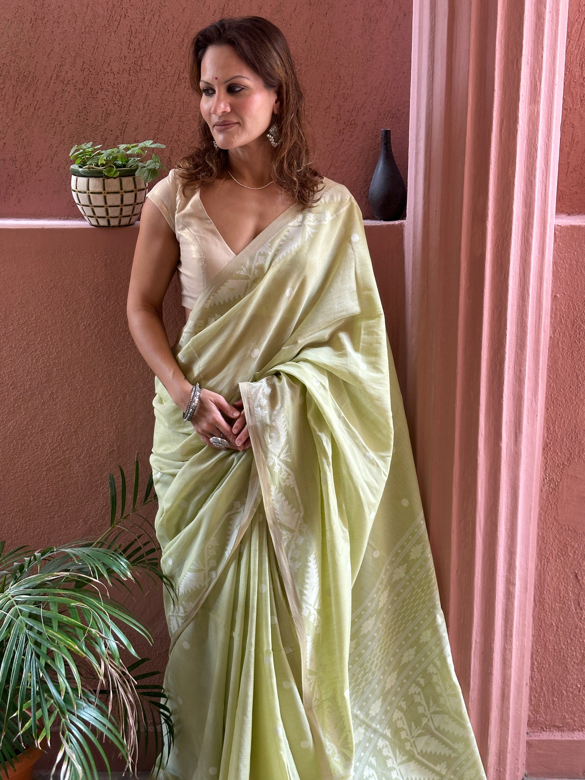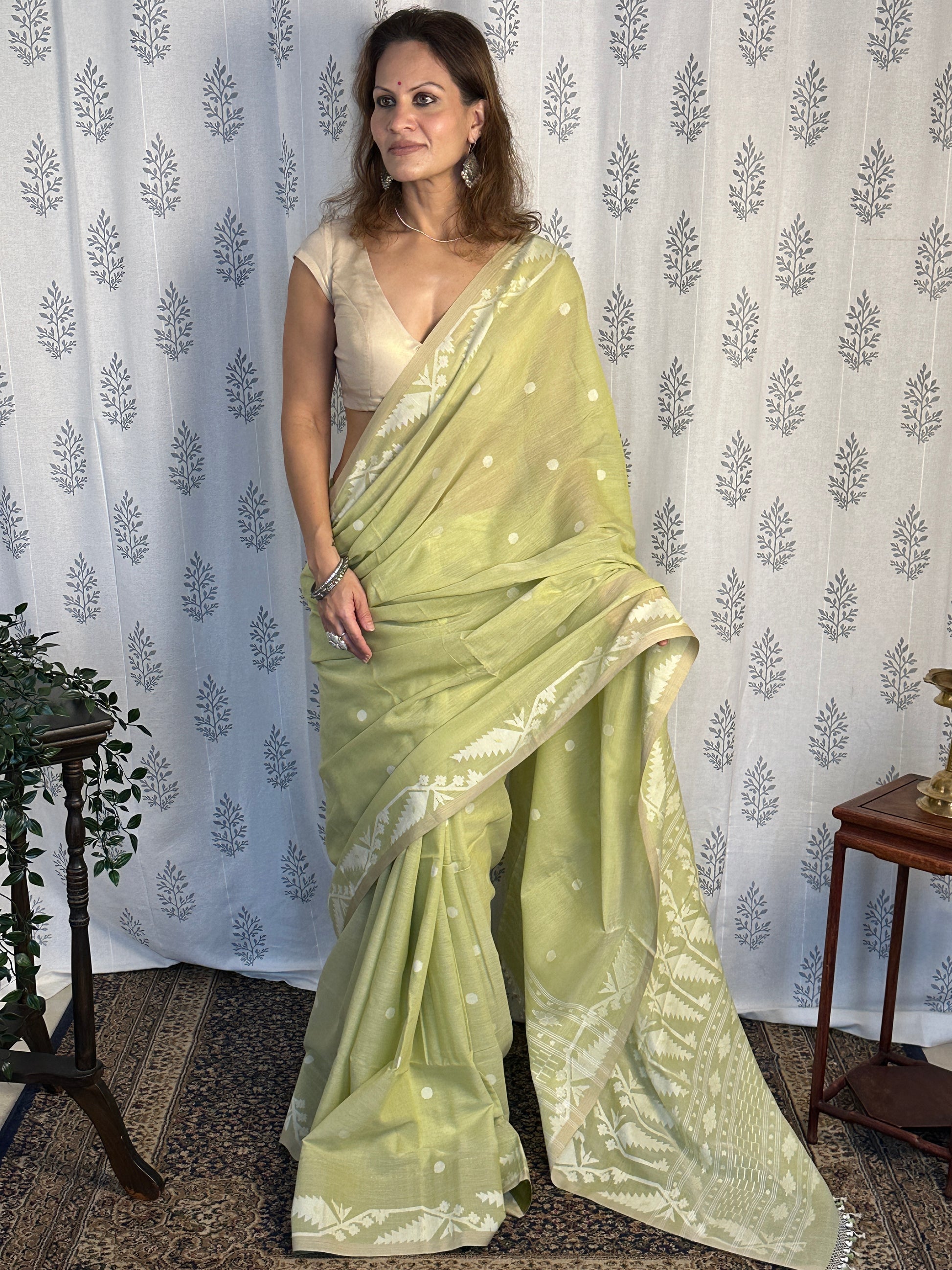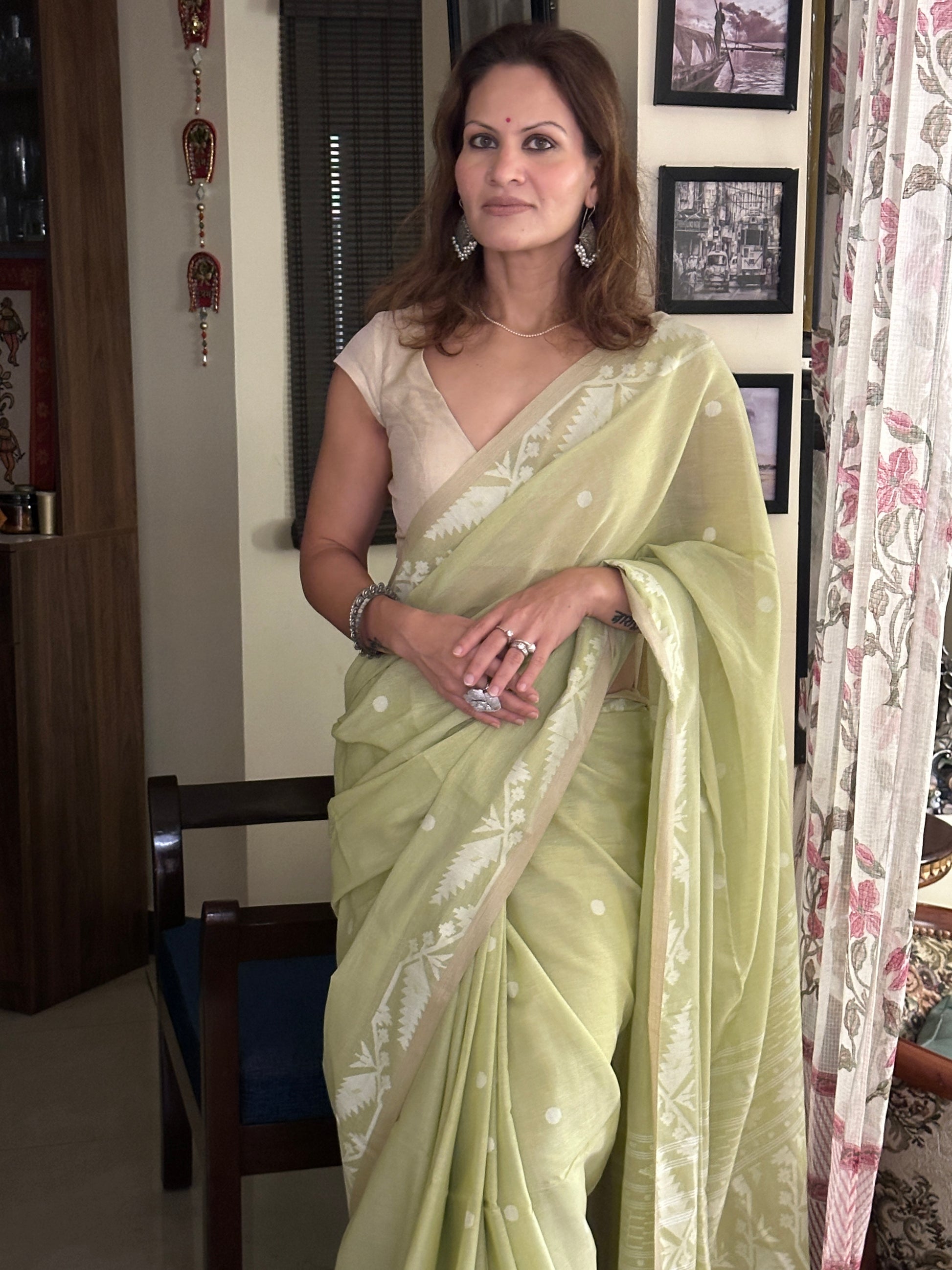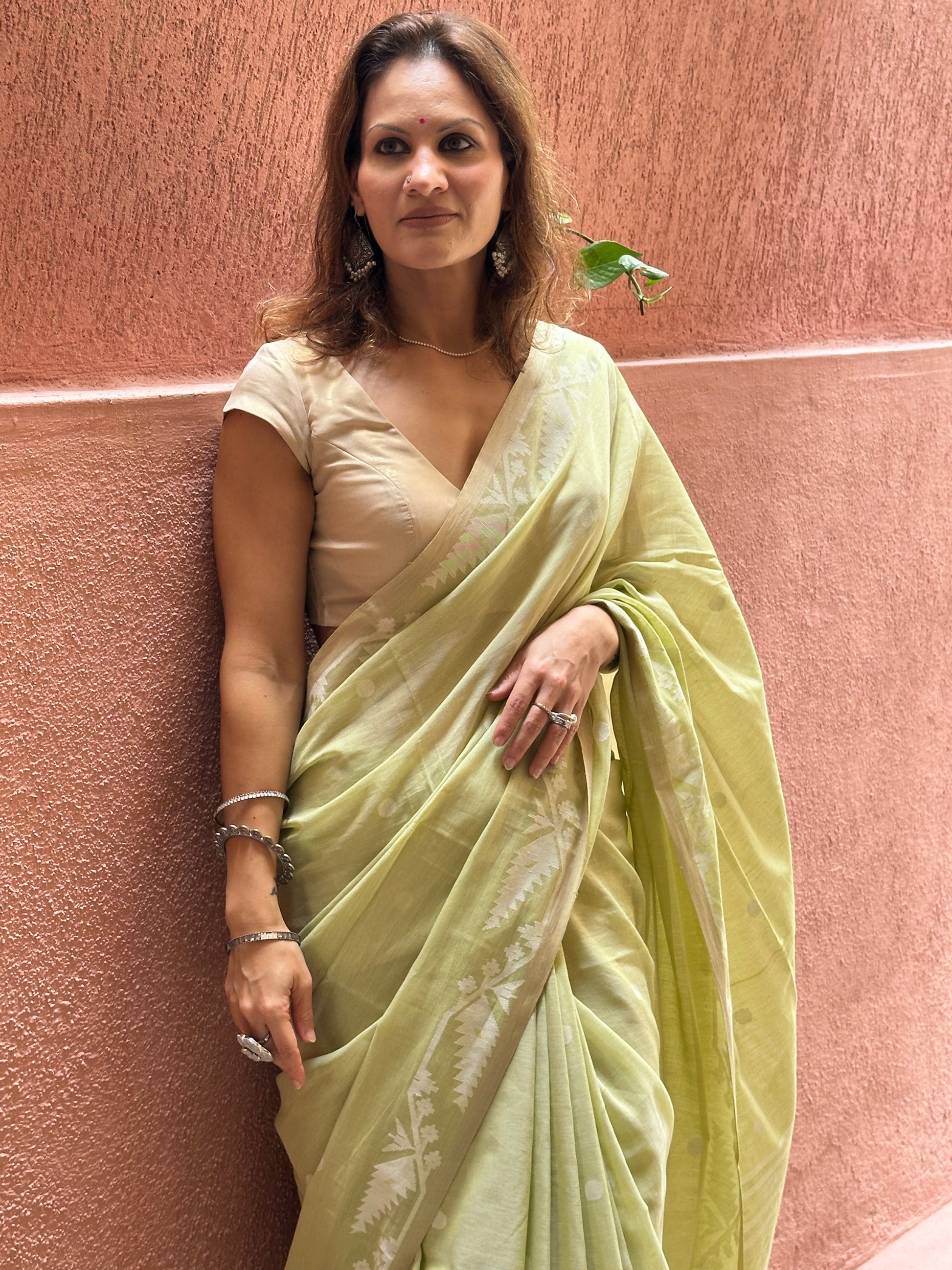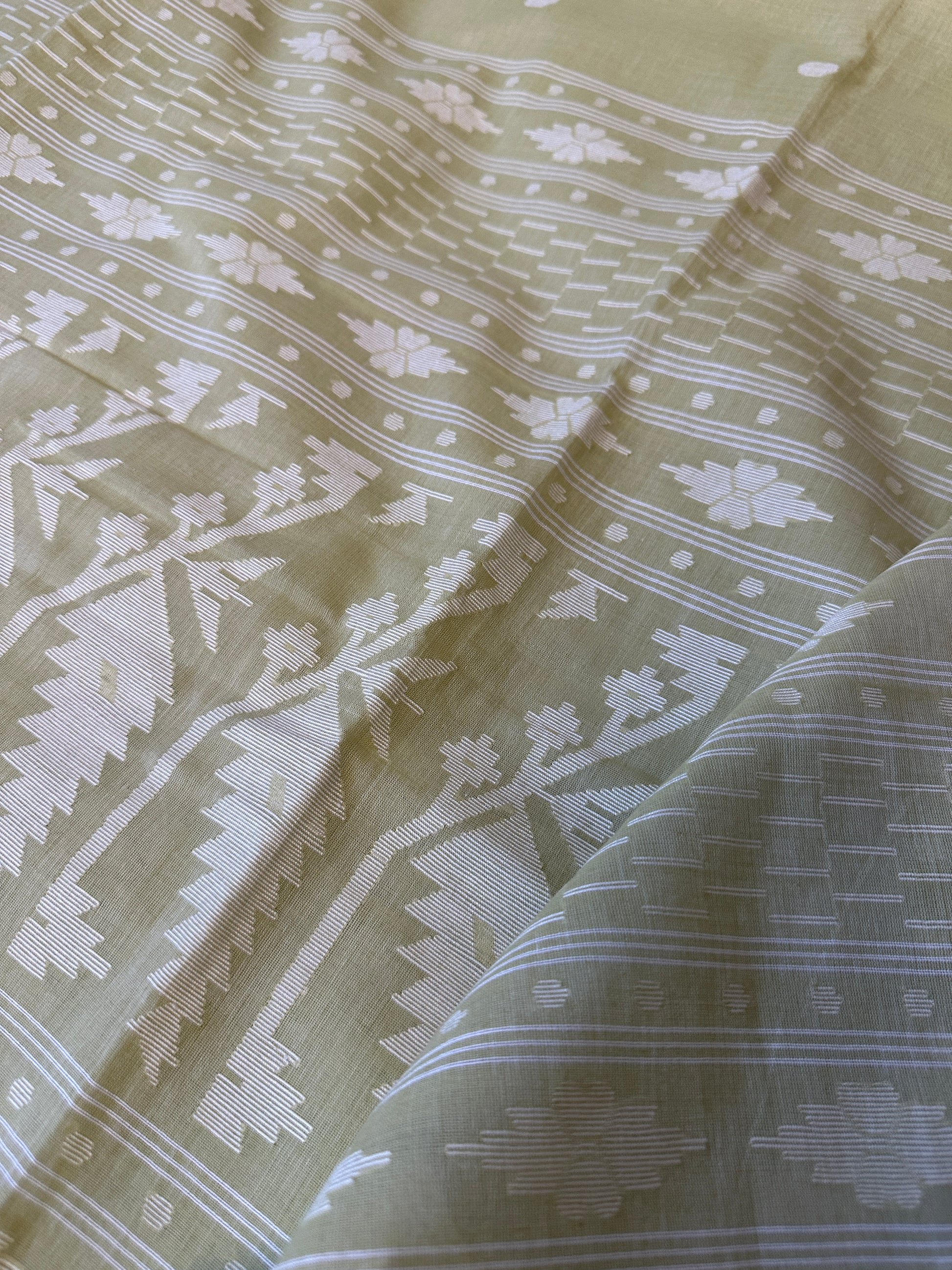 Green Hand Spun and Handwoven Pure Khaadi Sari with Intricate Needle Work Jamdani