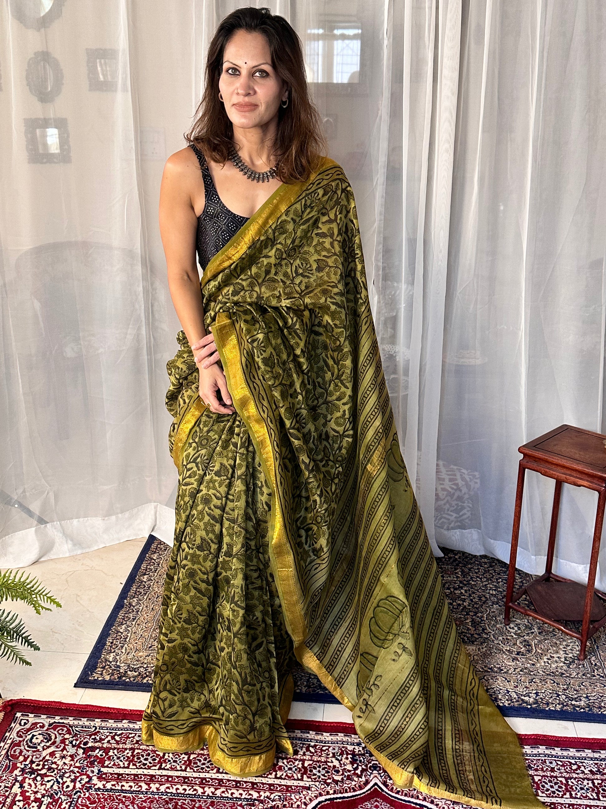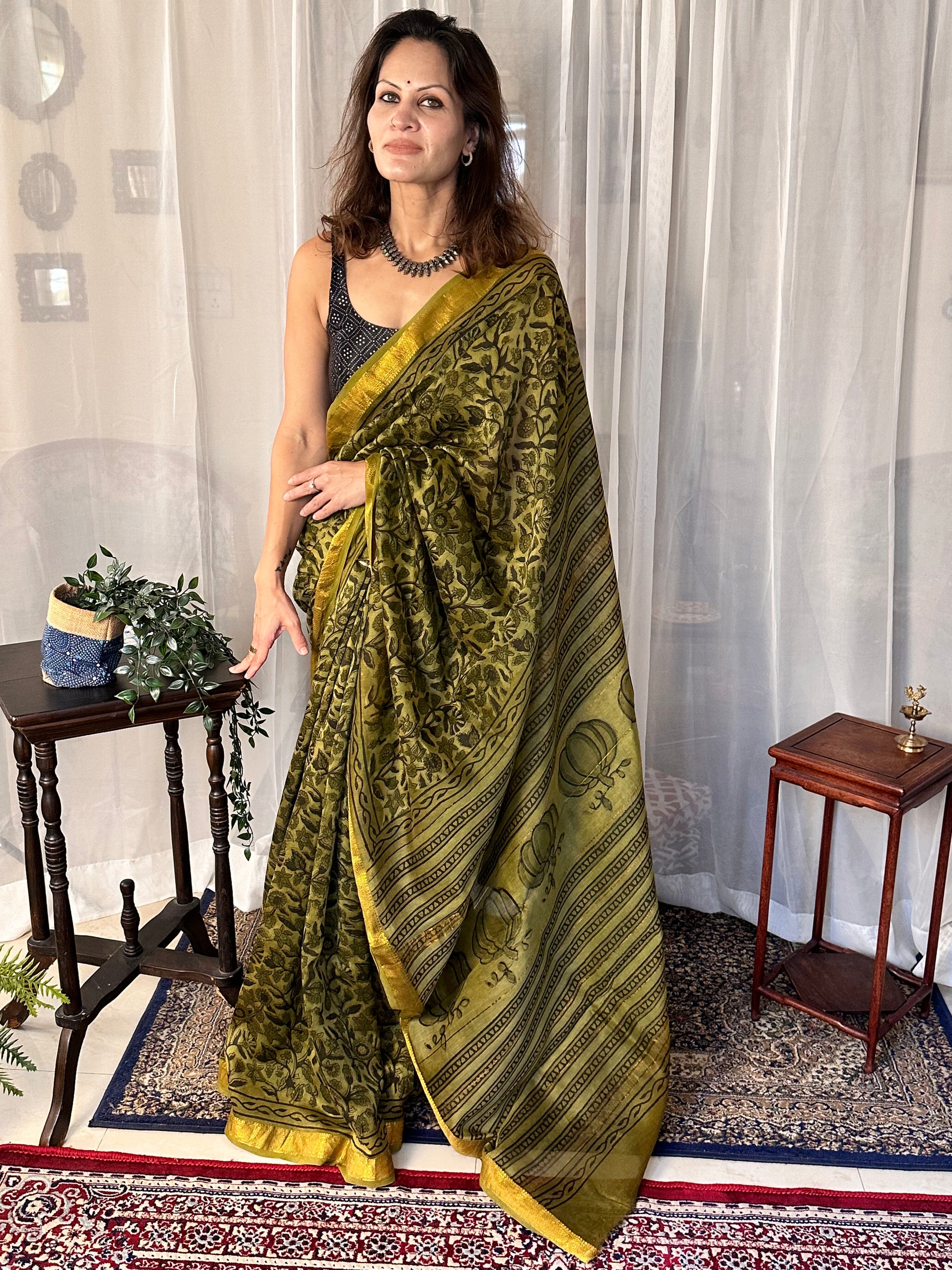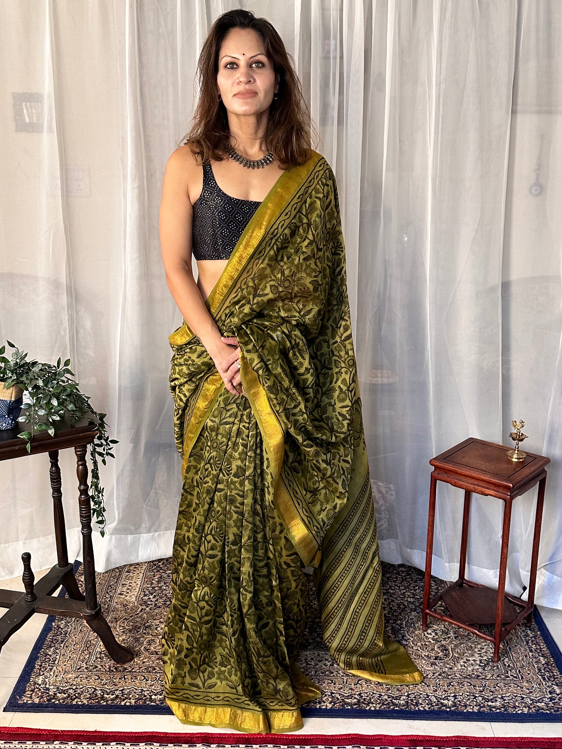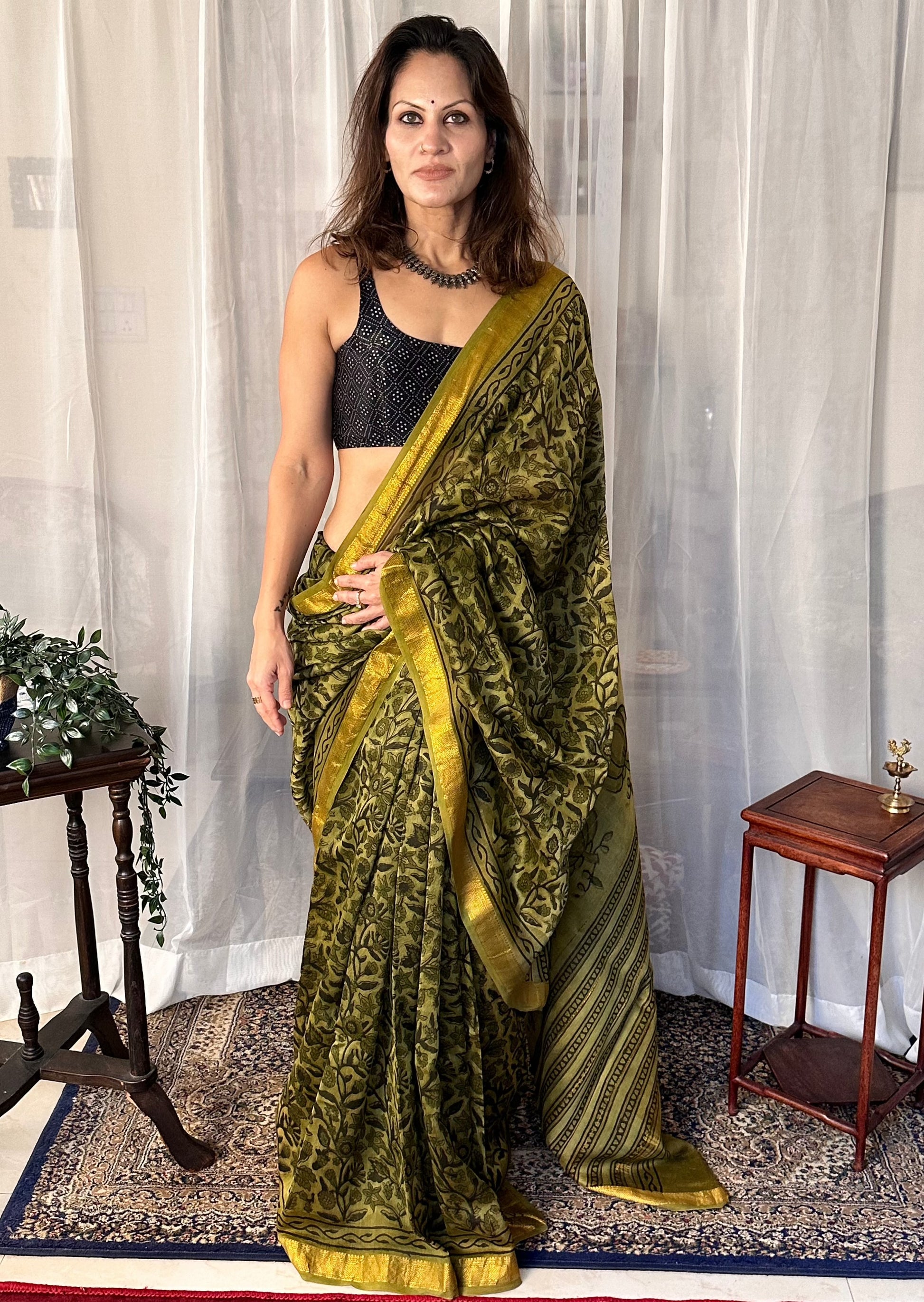 Green Natural Vanaspati Block Print Maheshwari Sari with Zari Border