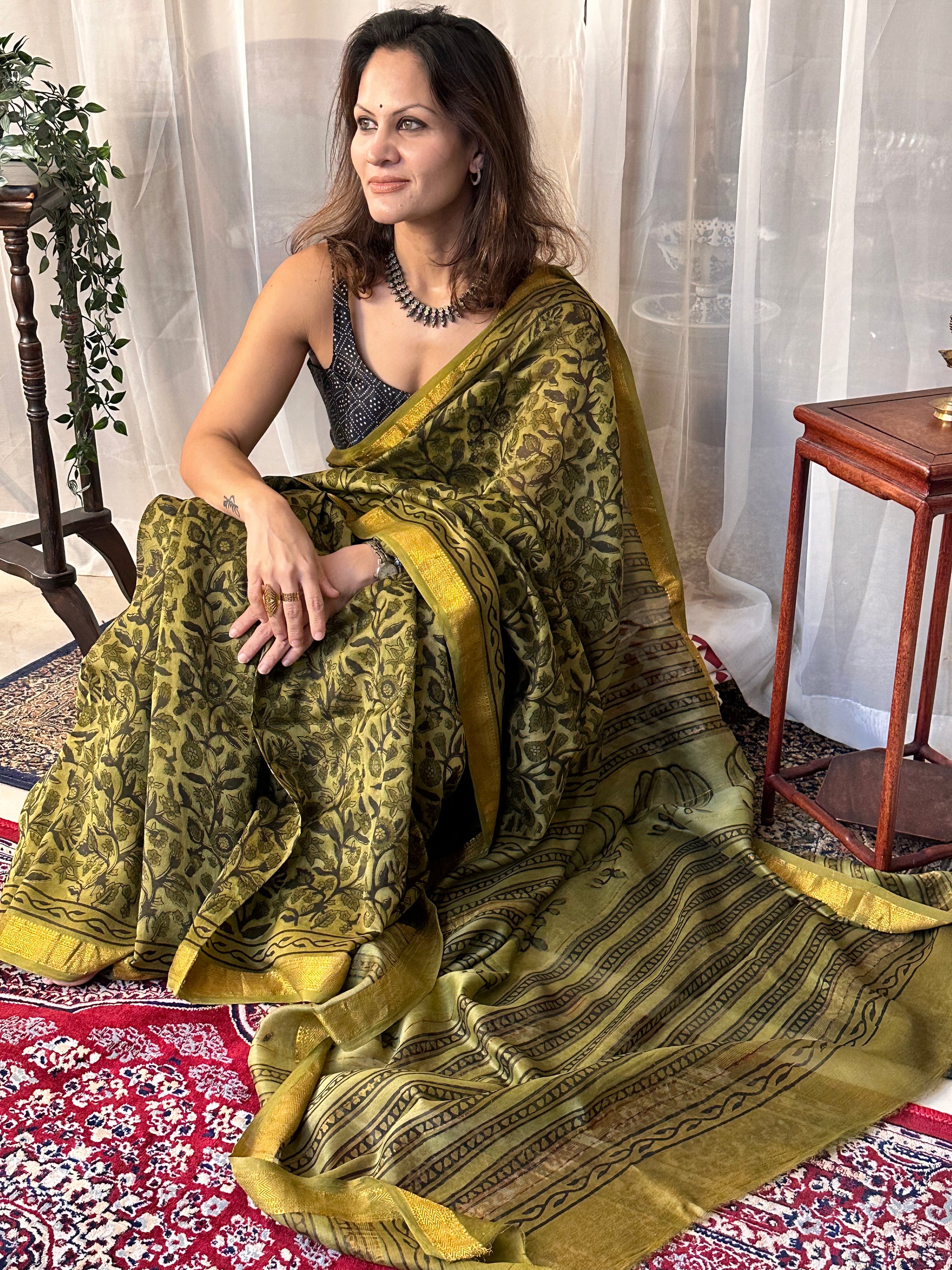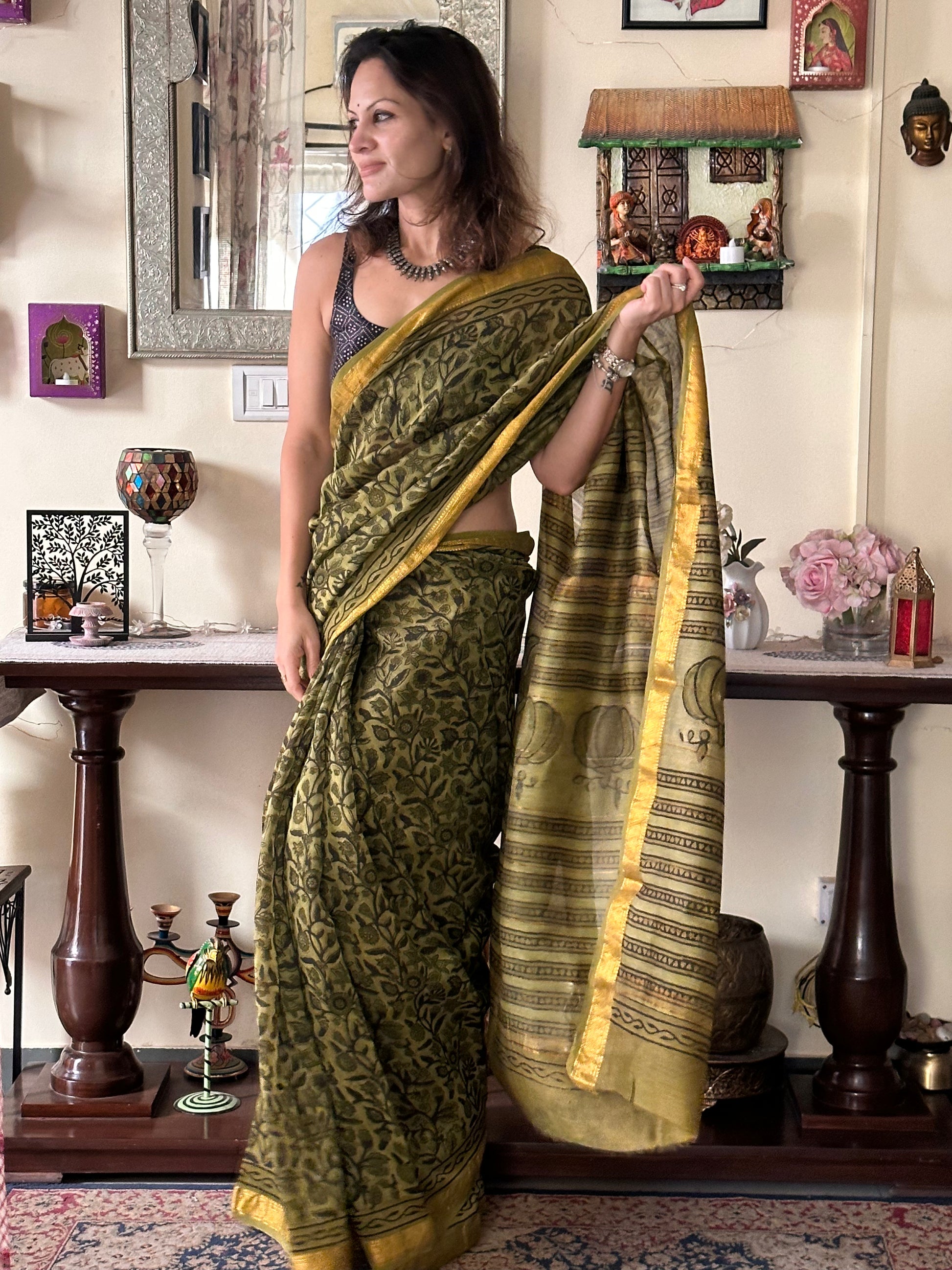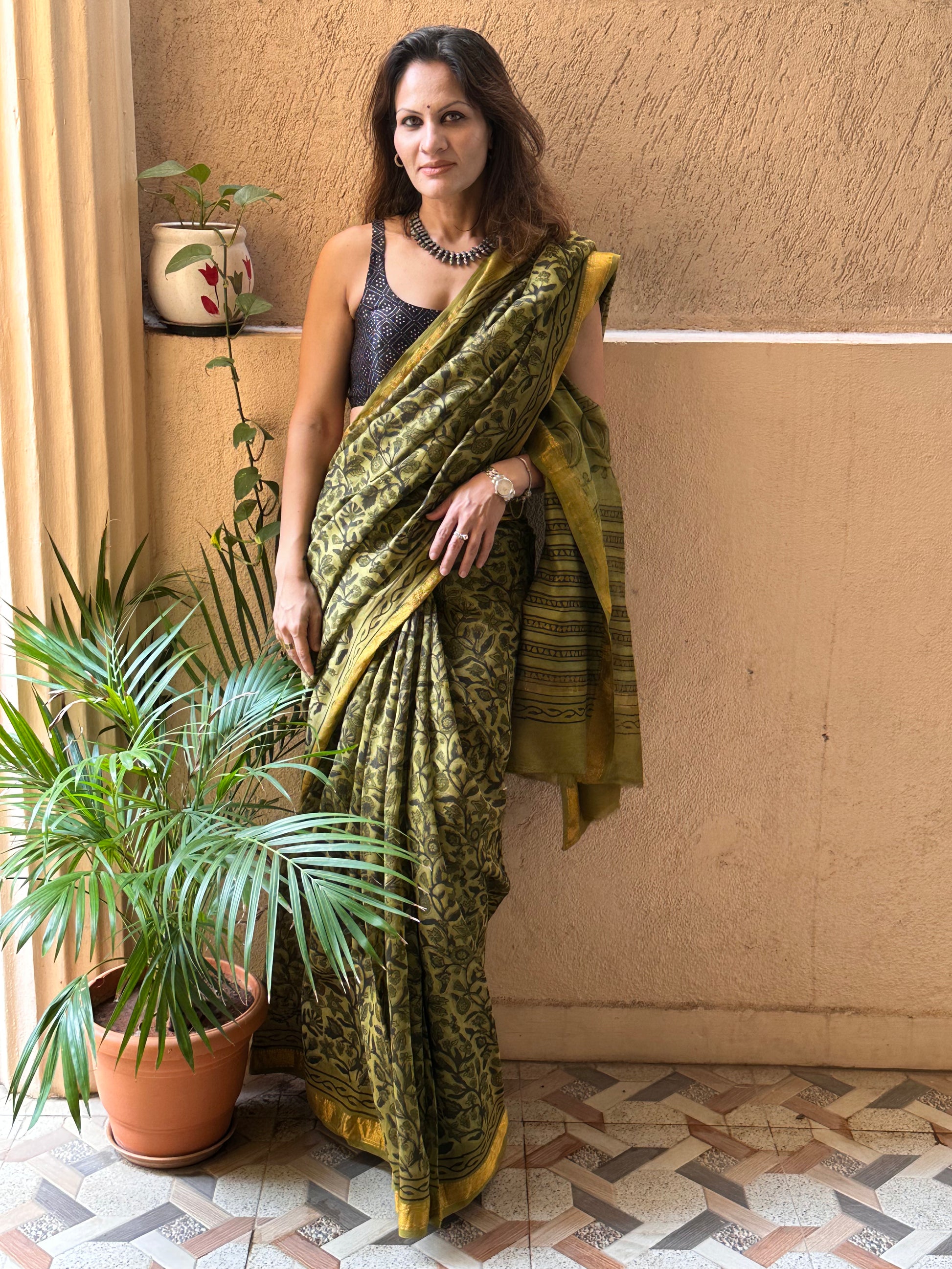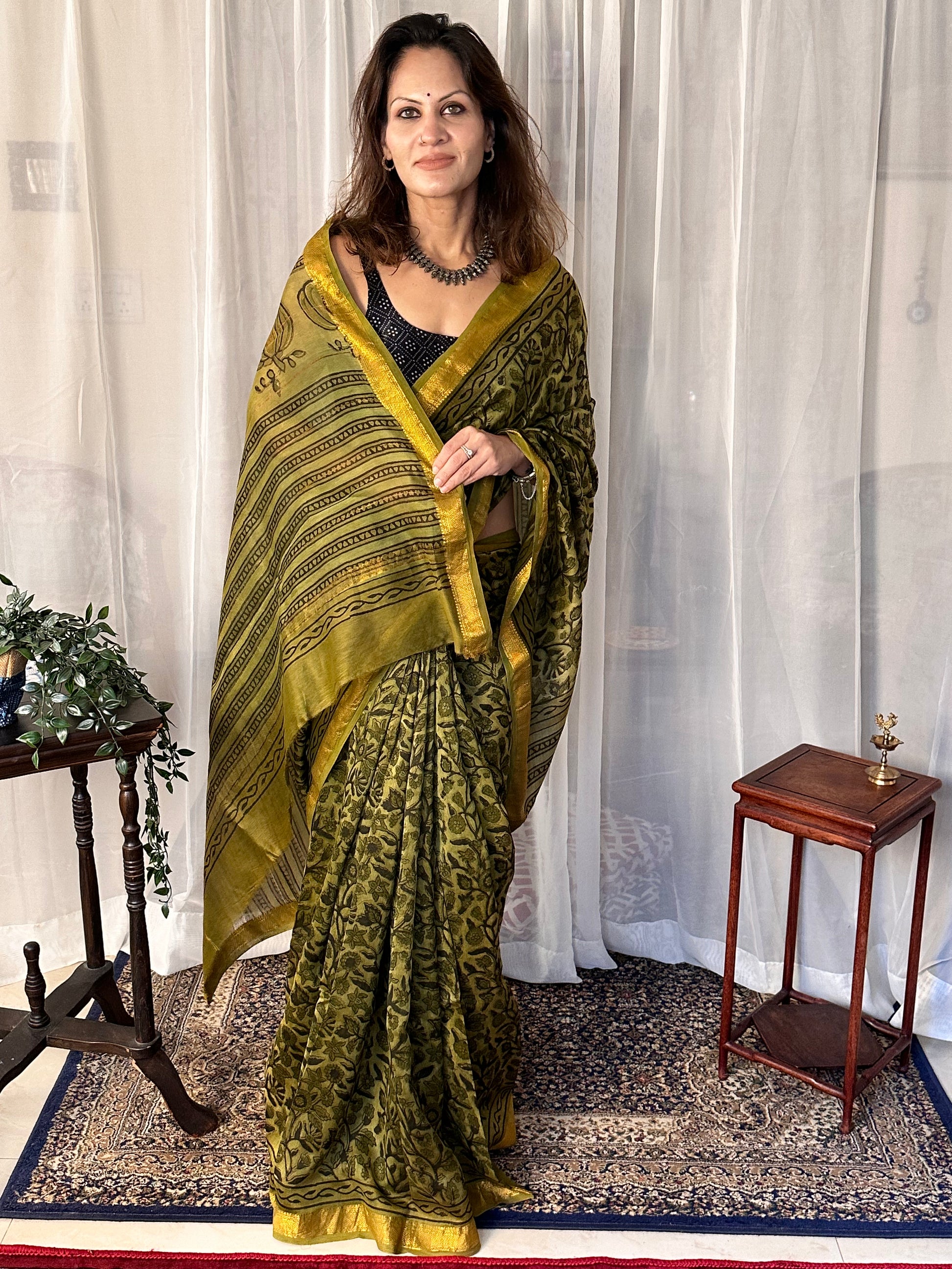 Green Natural Vanaspati Block Print Maheshwari Sari with Zari Border