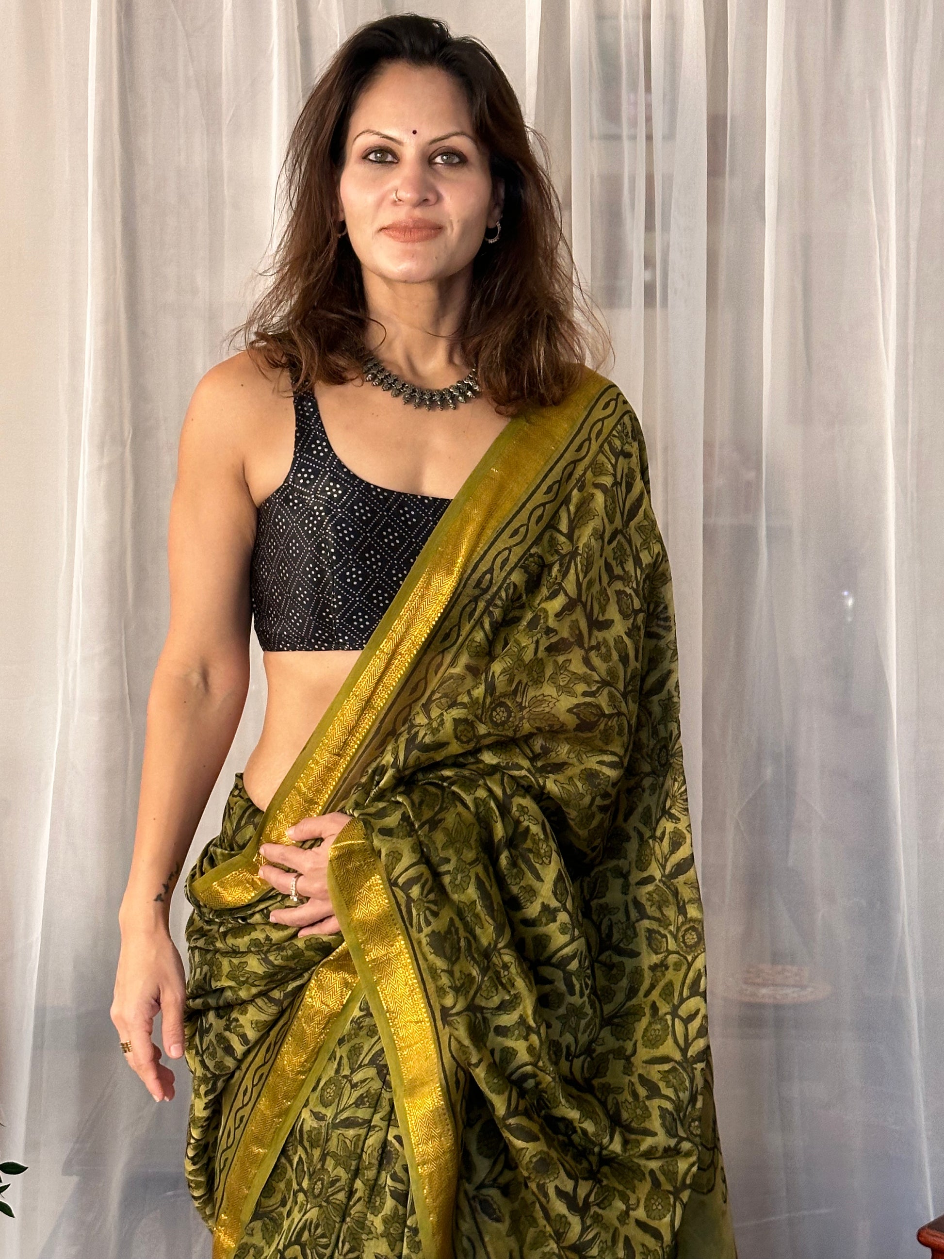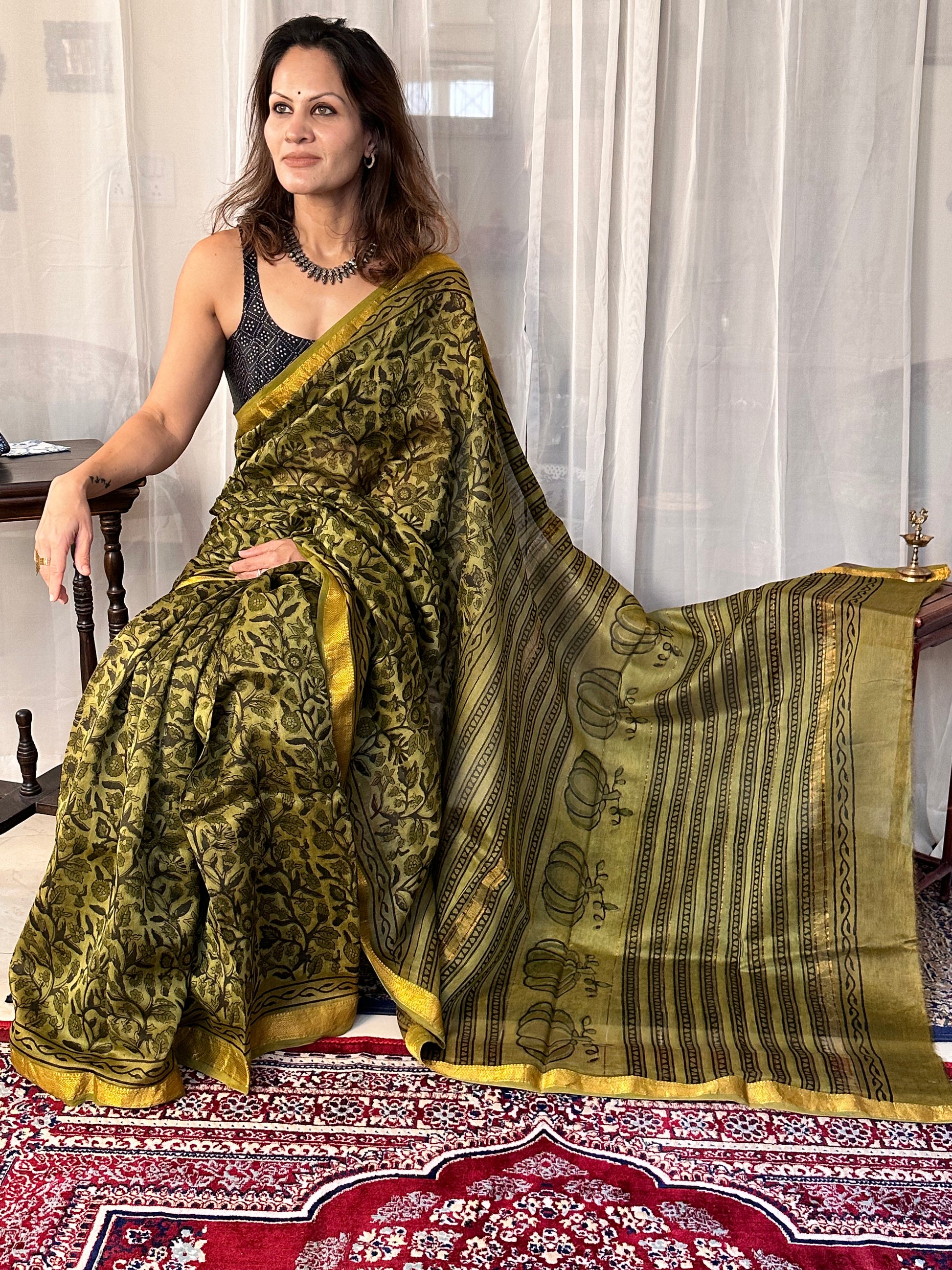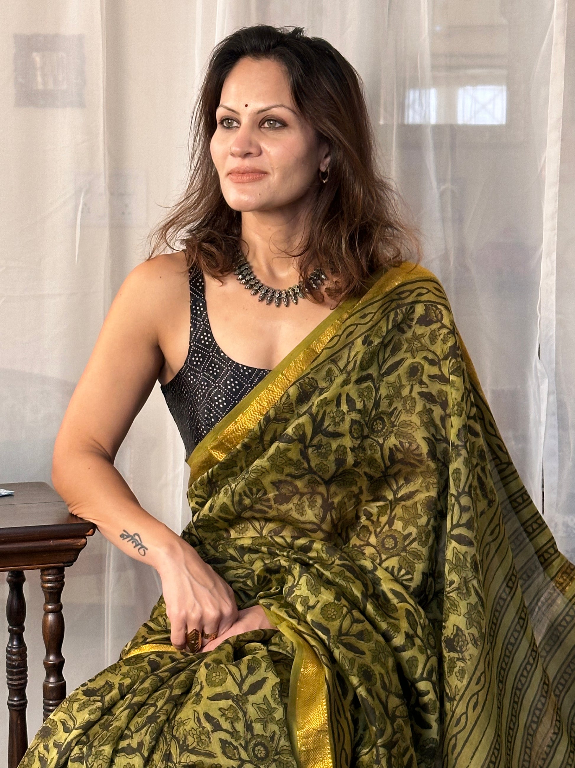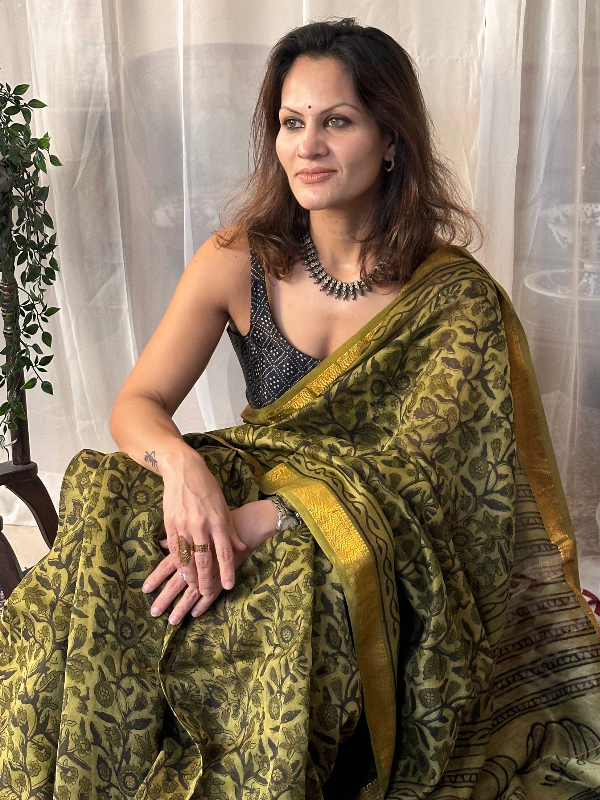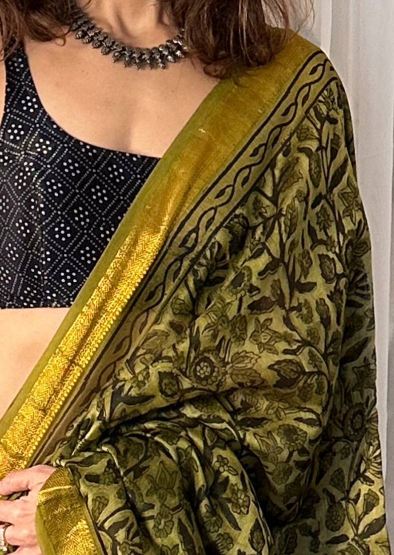 Green Natural Vanaspati Block Print Maheshwari Sari with Zari Border
