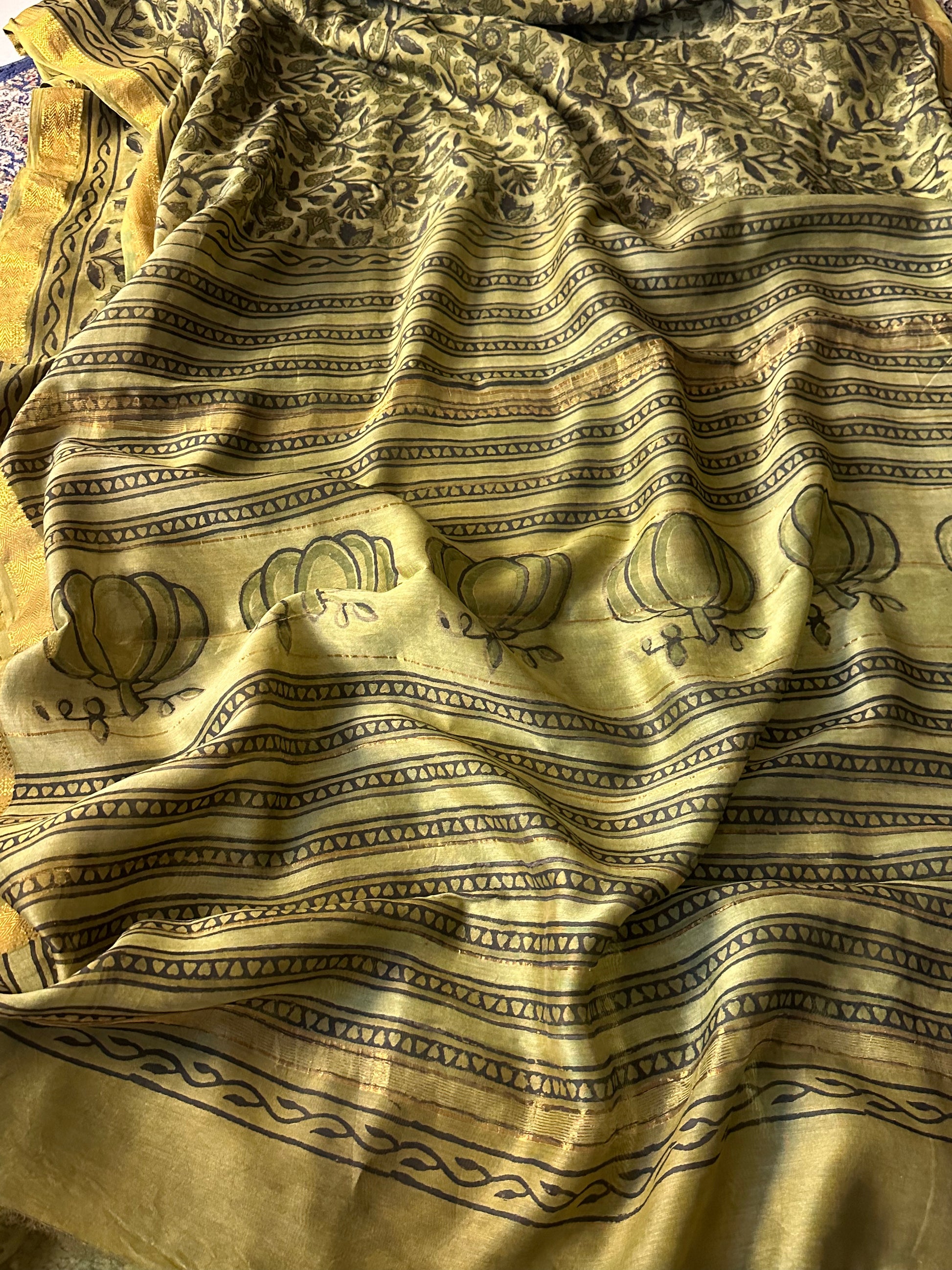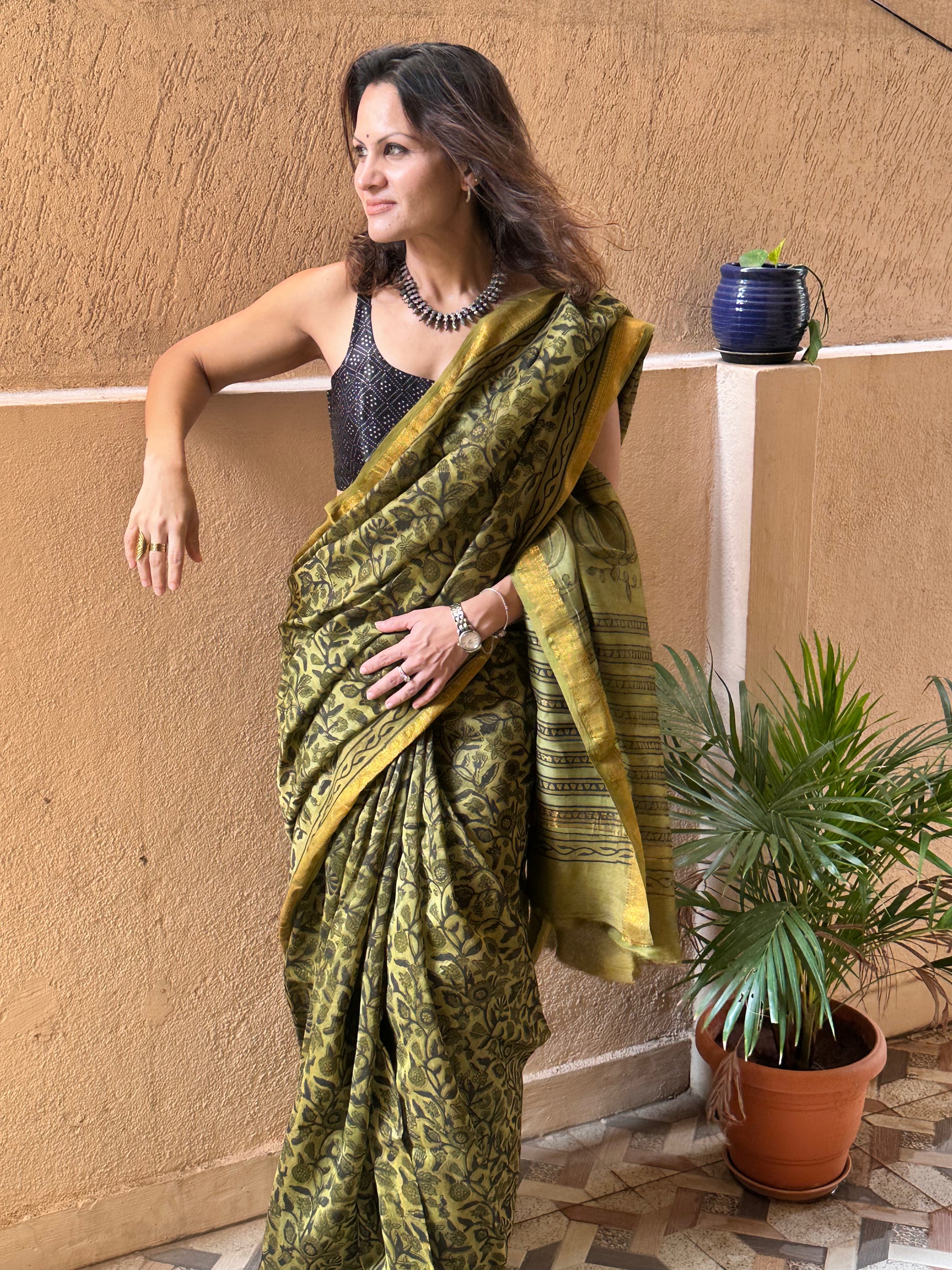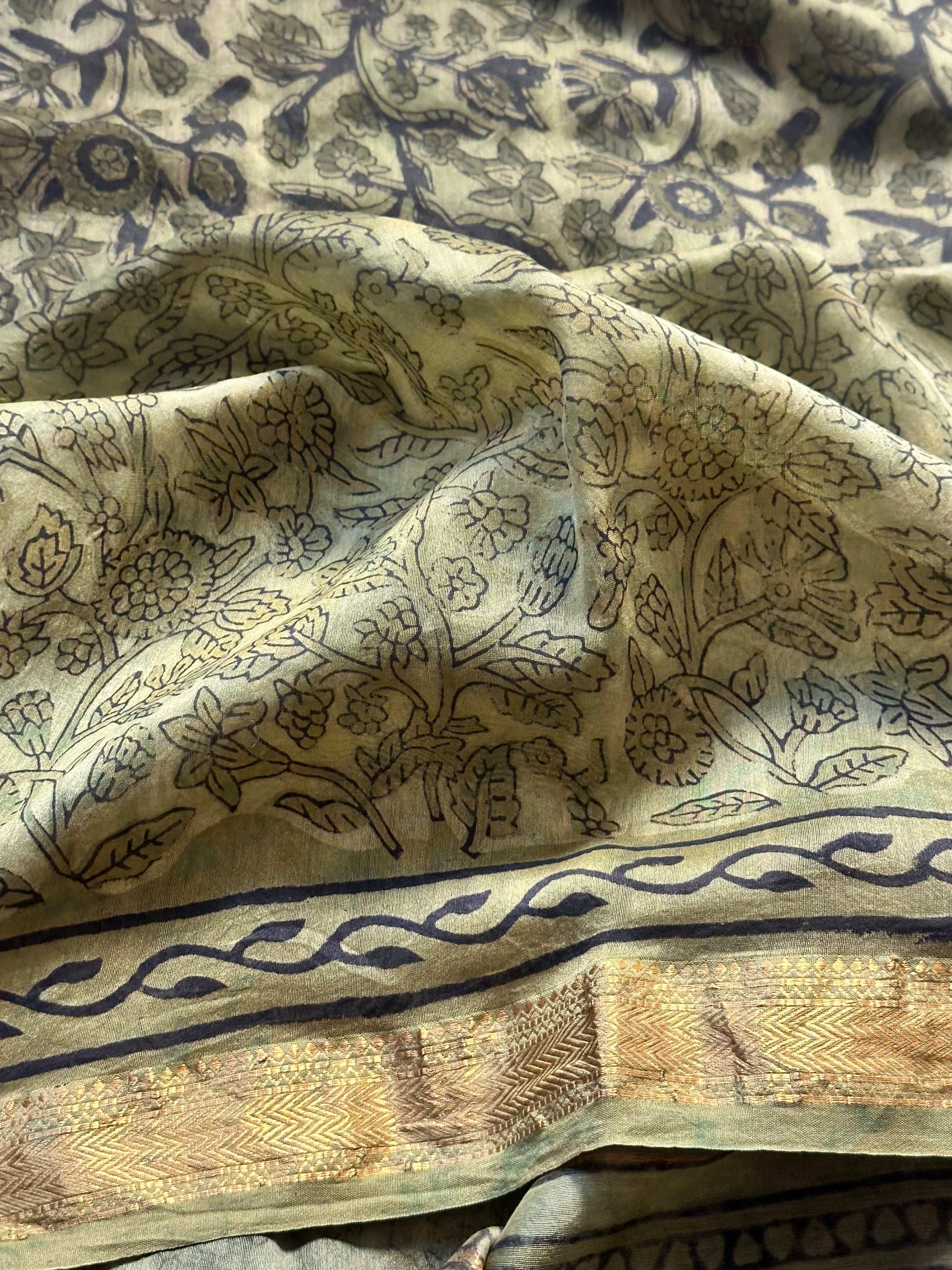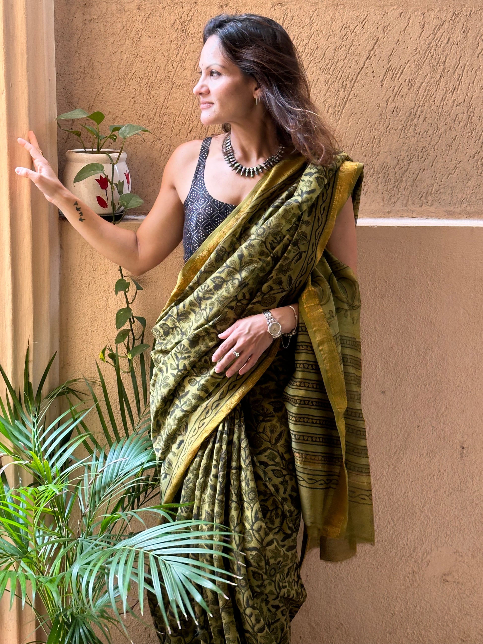 Green Natural Vanaspati Block Print Maheshwari Sari with Zari Border