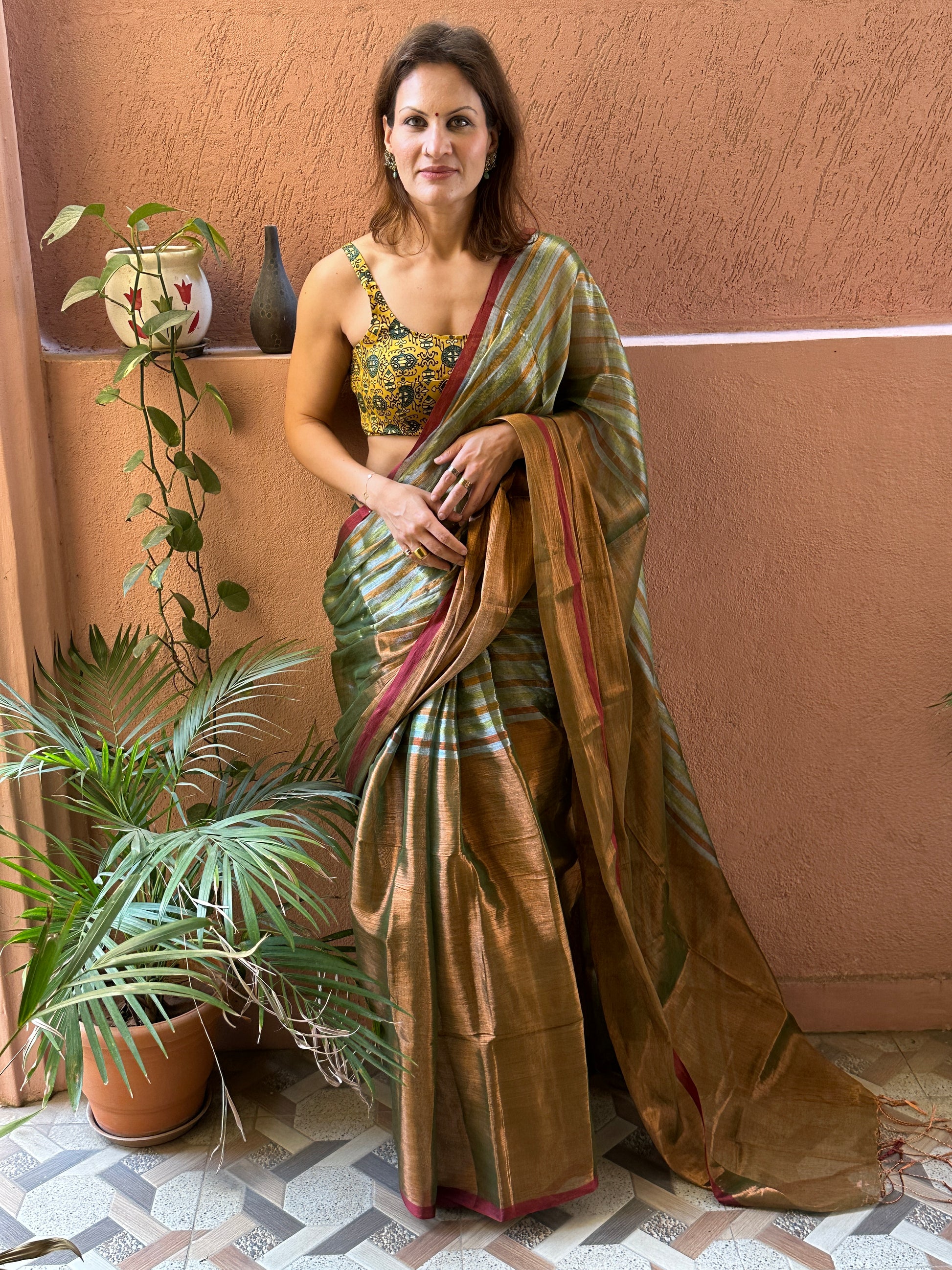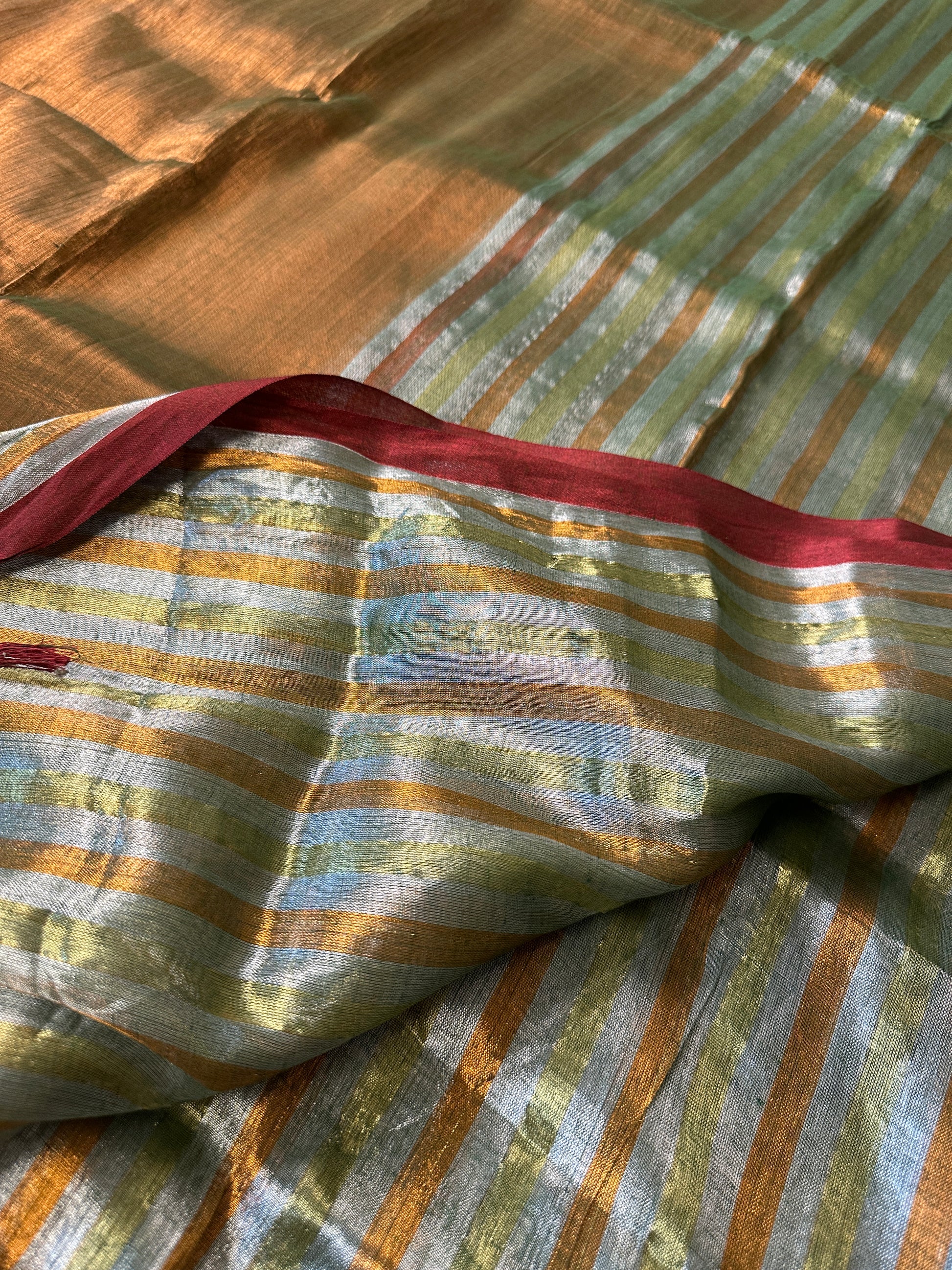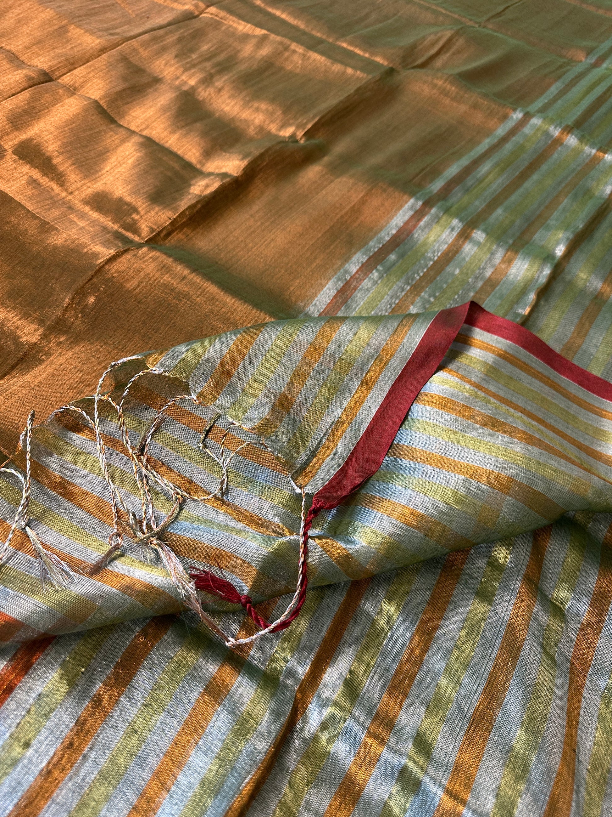 Green & Copper Pure Mul Mul Handwoven Striped Tissue Cotton Saree