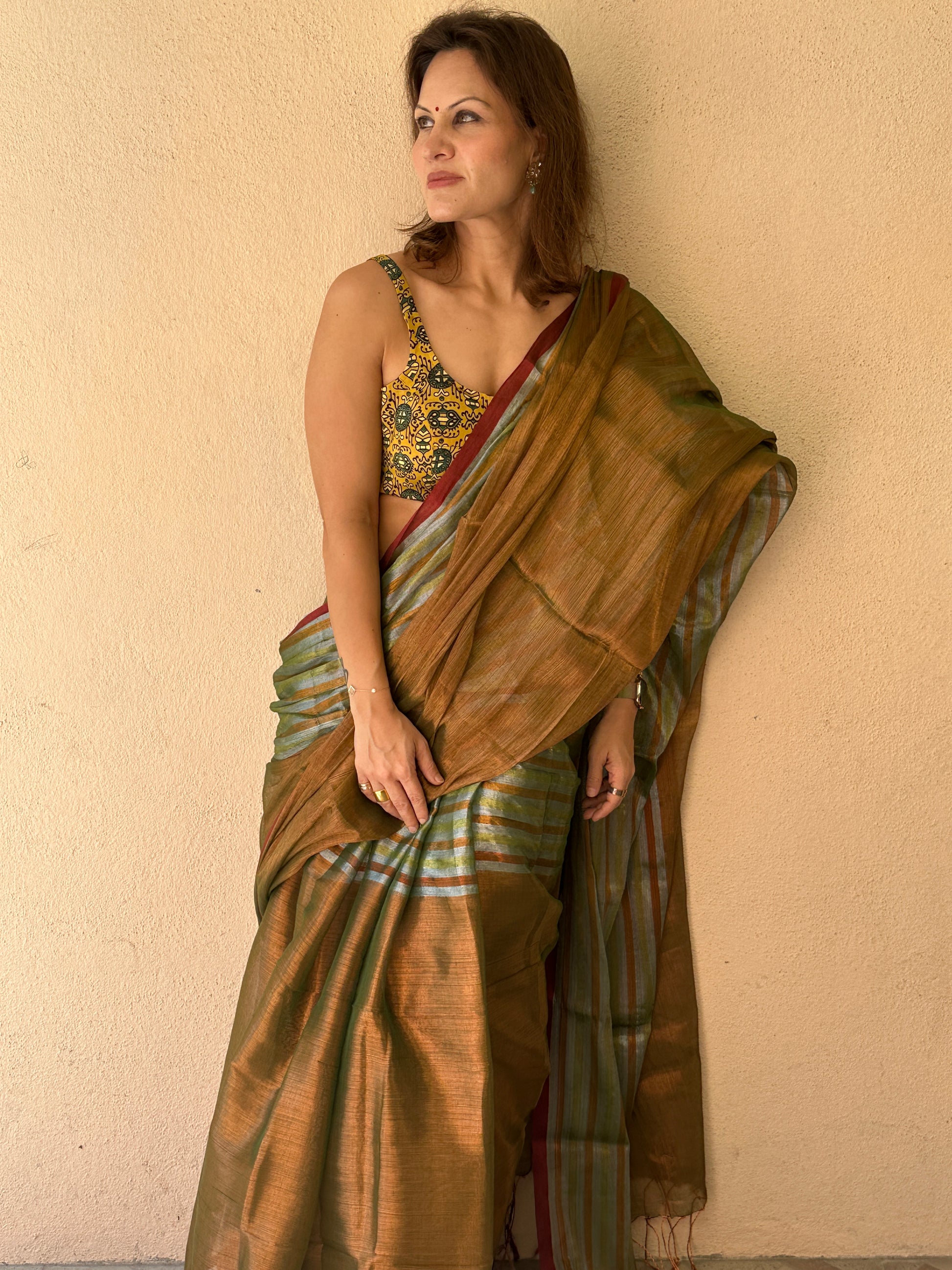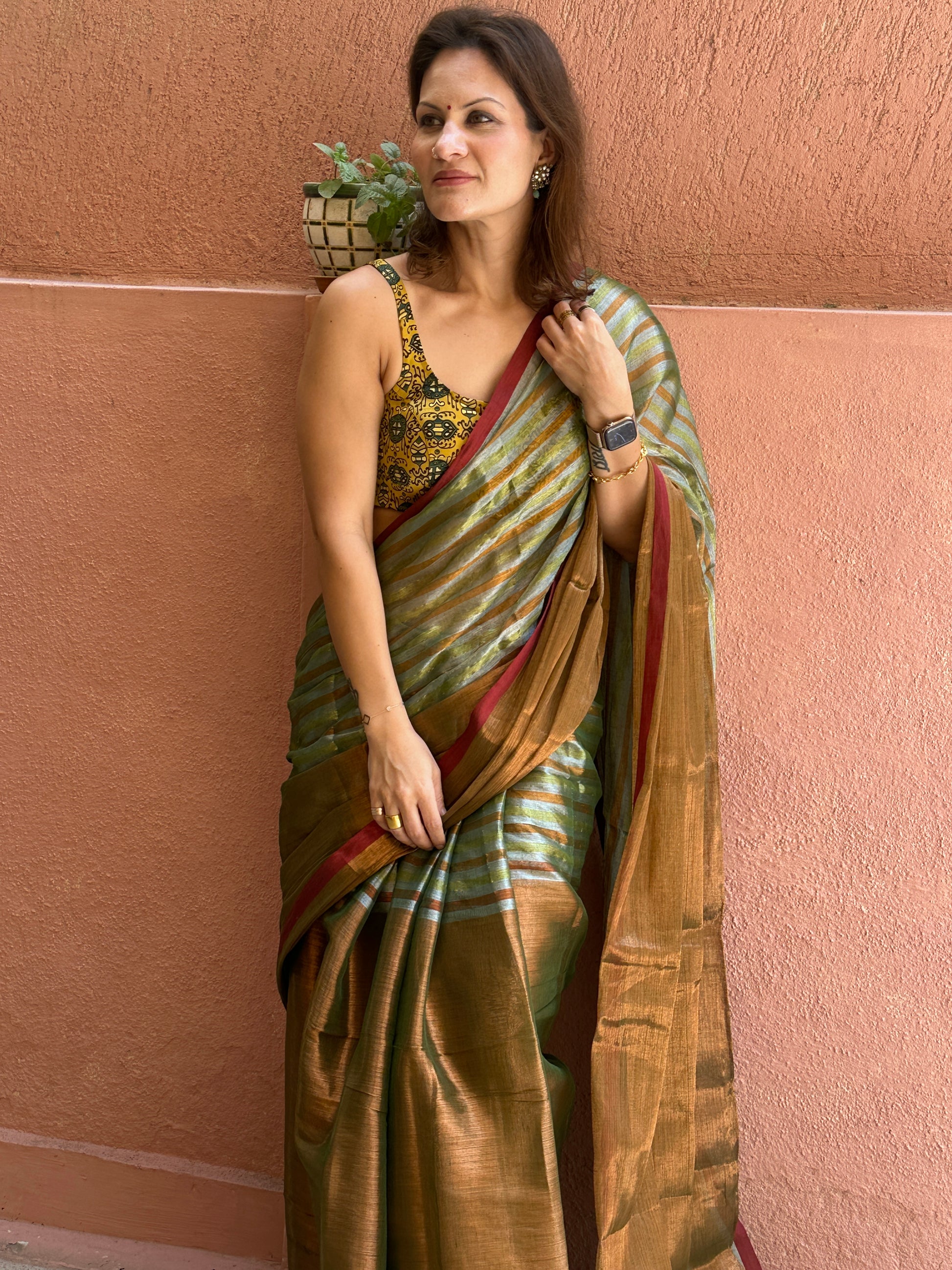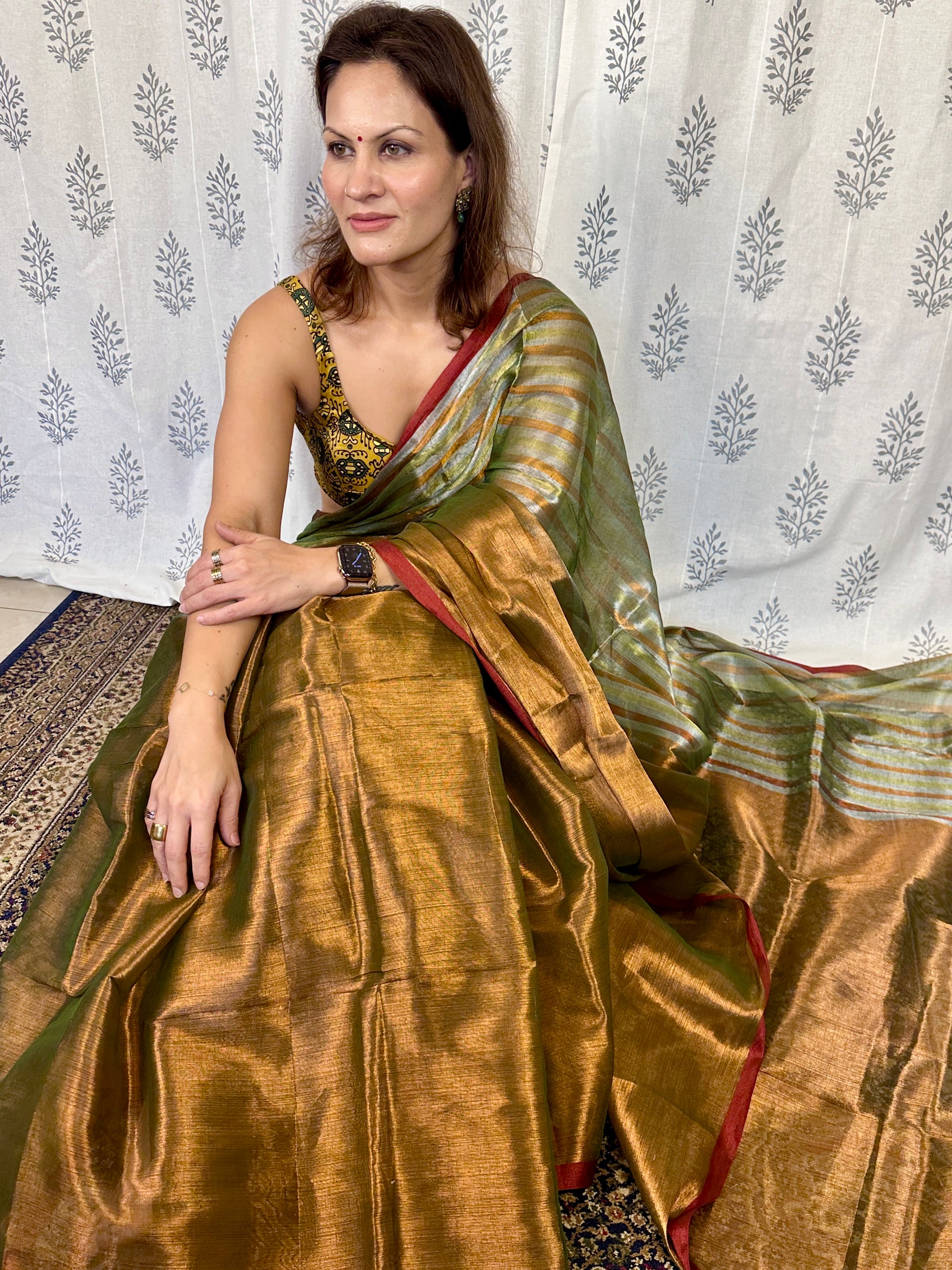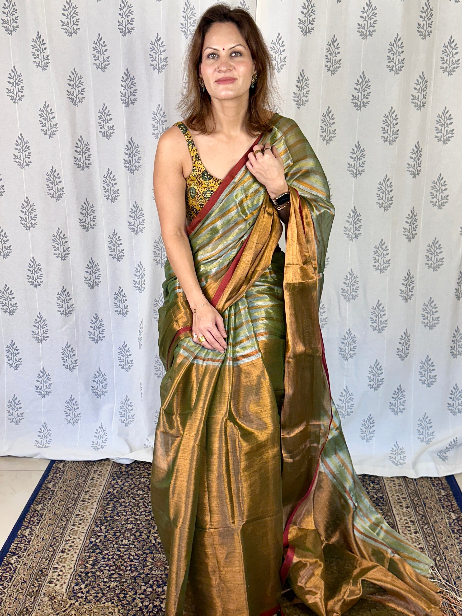 Green & Copper Pure Mul Mul Handwoven Striped Tissue Cotton Saree