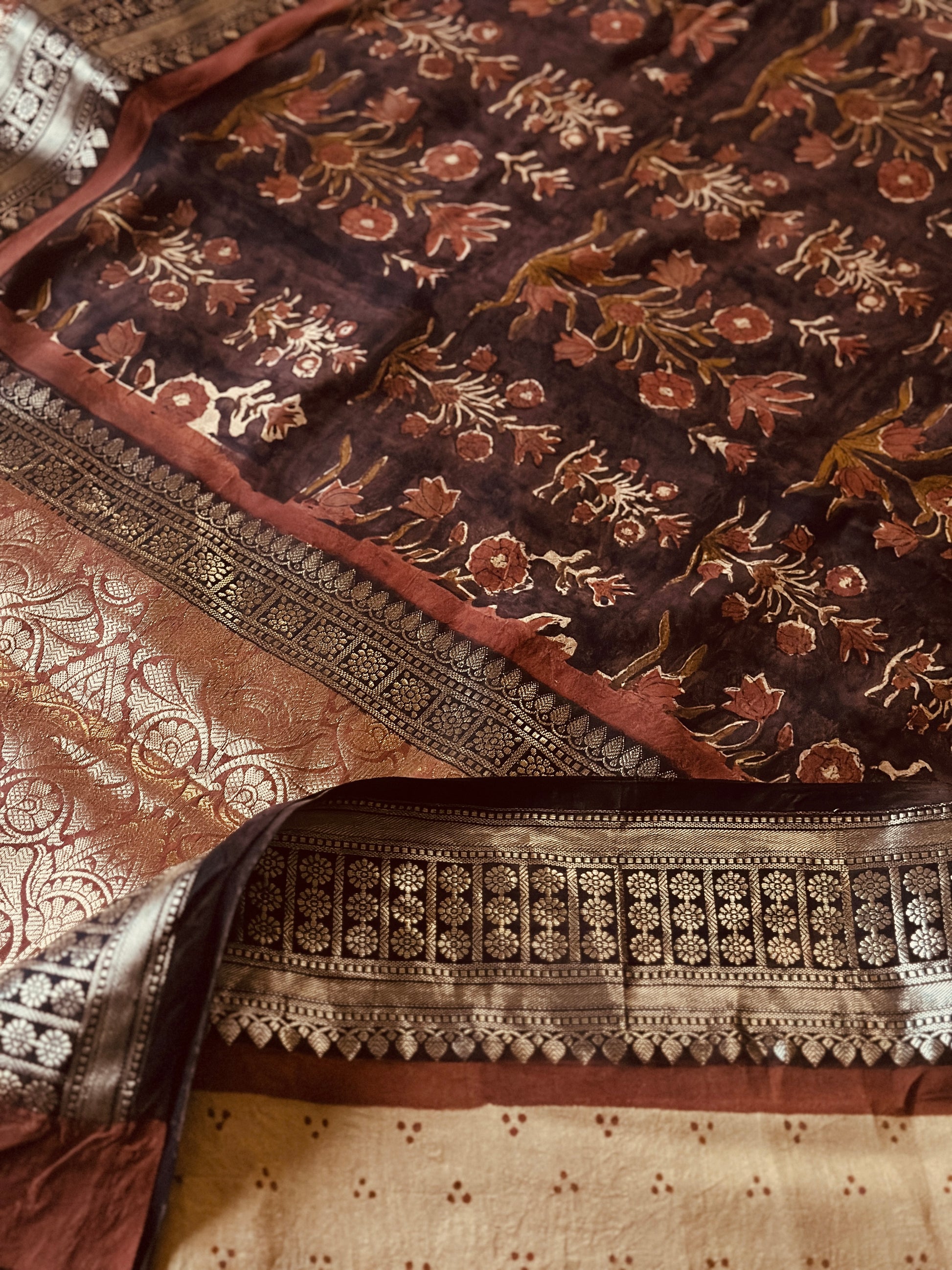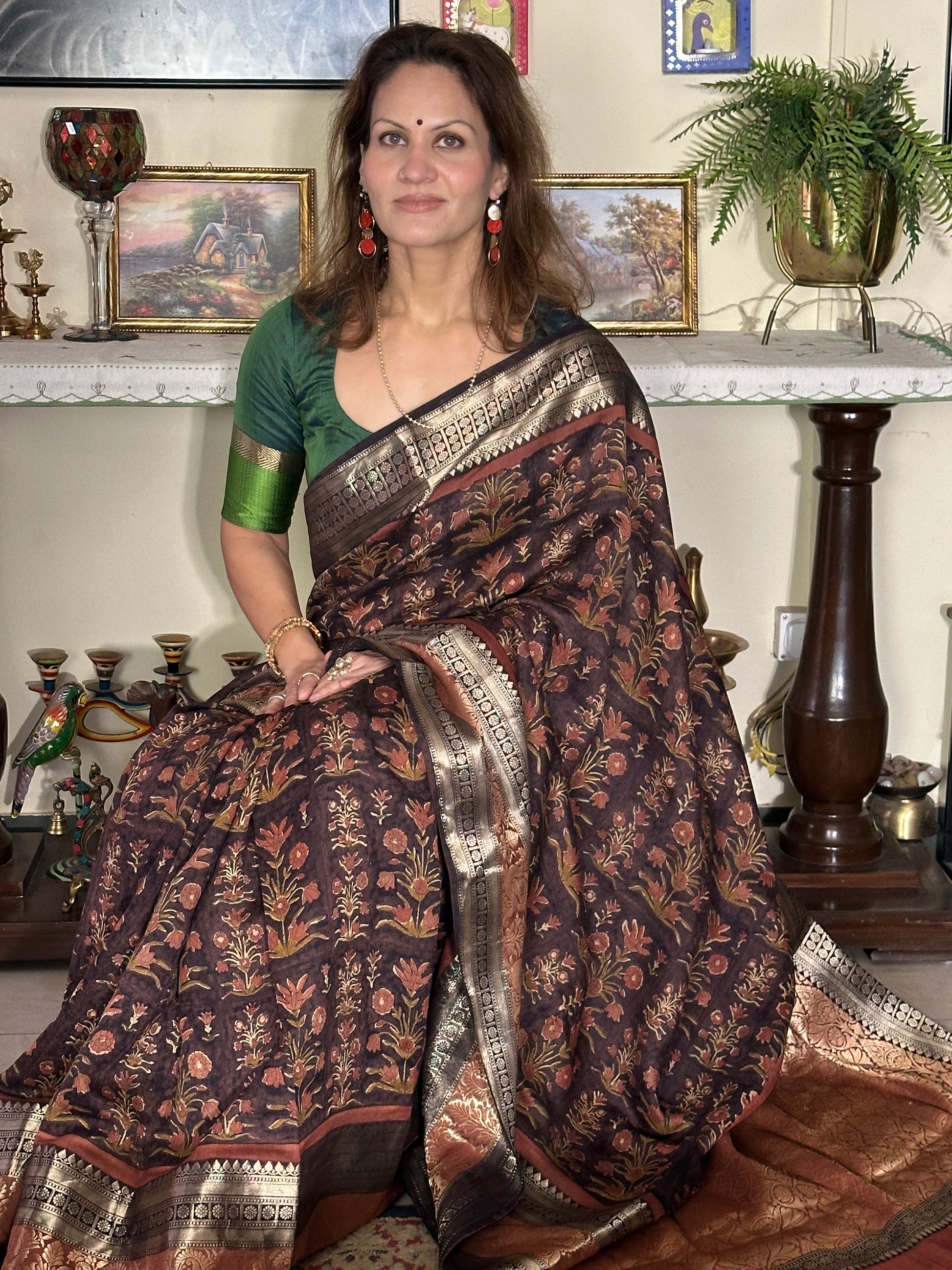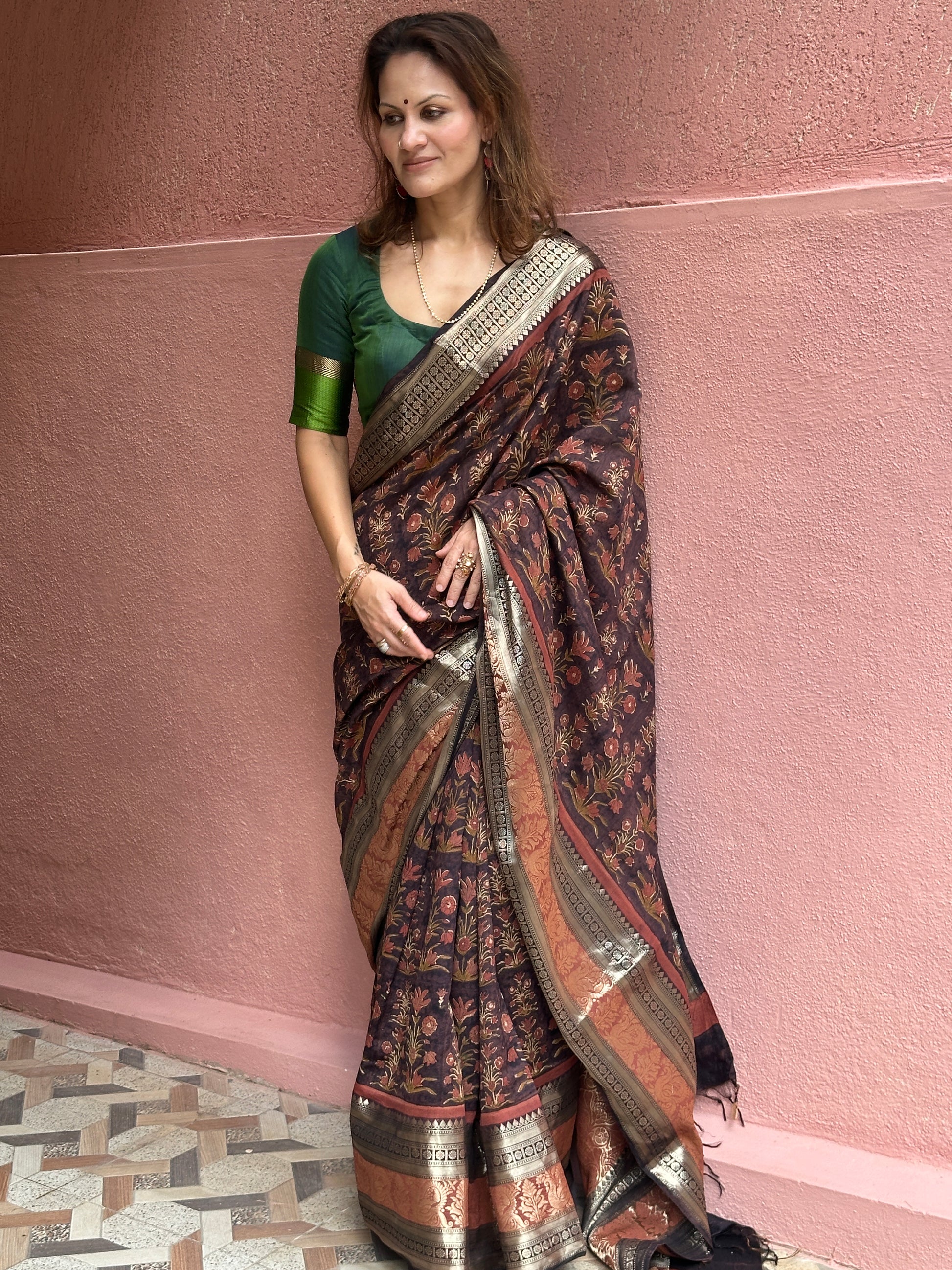 Brown Handblock Print Chanderi Silk Saree with Thick Zari Woven Border & Rich Zari Pallu